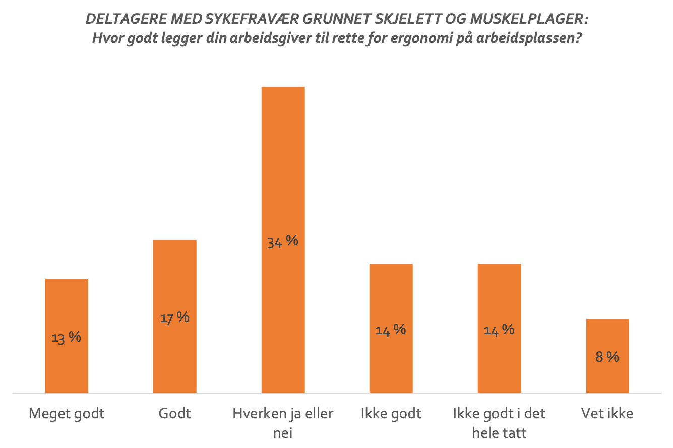 Når vi vet hvor viktig tilrettelegging av ergonomi er for reduksjon av helseplager og fravær, er det overraskende at kun halvparten av de spurte mener at arbeidsgiver legger godt til rette for god ergonomi. For dem som faktisk har sykefravær i forbindelse med skjelett- og muskelplager, er kun 30 % fornøyde med arbeidsgivers tilrettelegging av ergonomi.