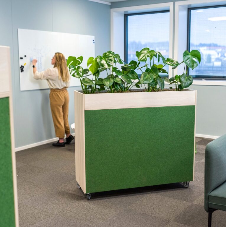 GRØNN ROMDELER: Et gammelt skap har blitt til en fin romdeler og plantekasse hos Agder Energi.