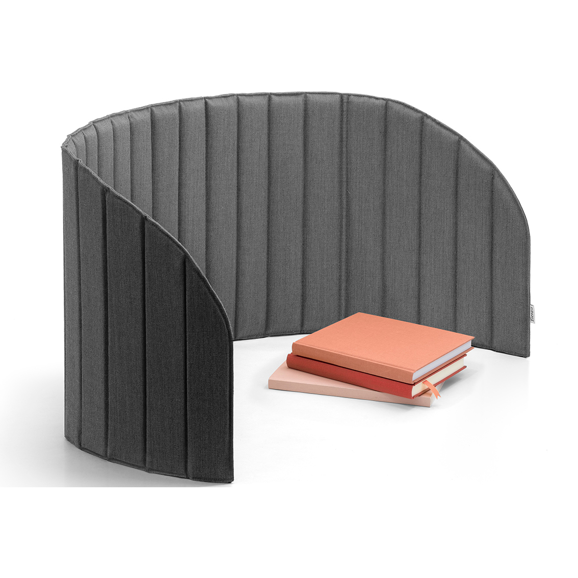 Focus gulvskjerm er en estetisk og fleksibel skjermvegg i tekstil, som enkelt kan formes etter behov. Konstruksjonen er fjærlett og kan enkelt flyttes rundt for å skape nye romløsninger i et fleksibelt kontorlandskap. – Skjermen kan brukes som en «bølget» romdeler, eller du kan forme den til en bås som brukes i sosiale soner, forklarer Hans.