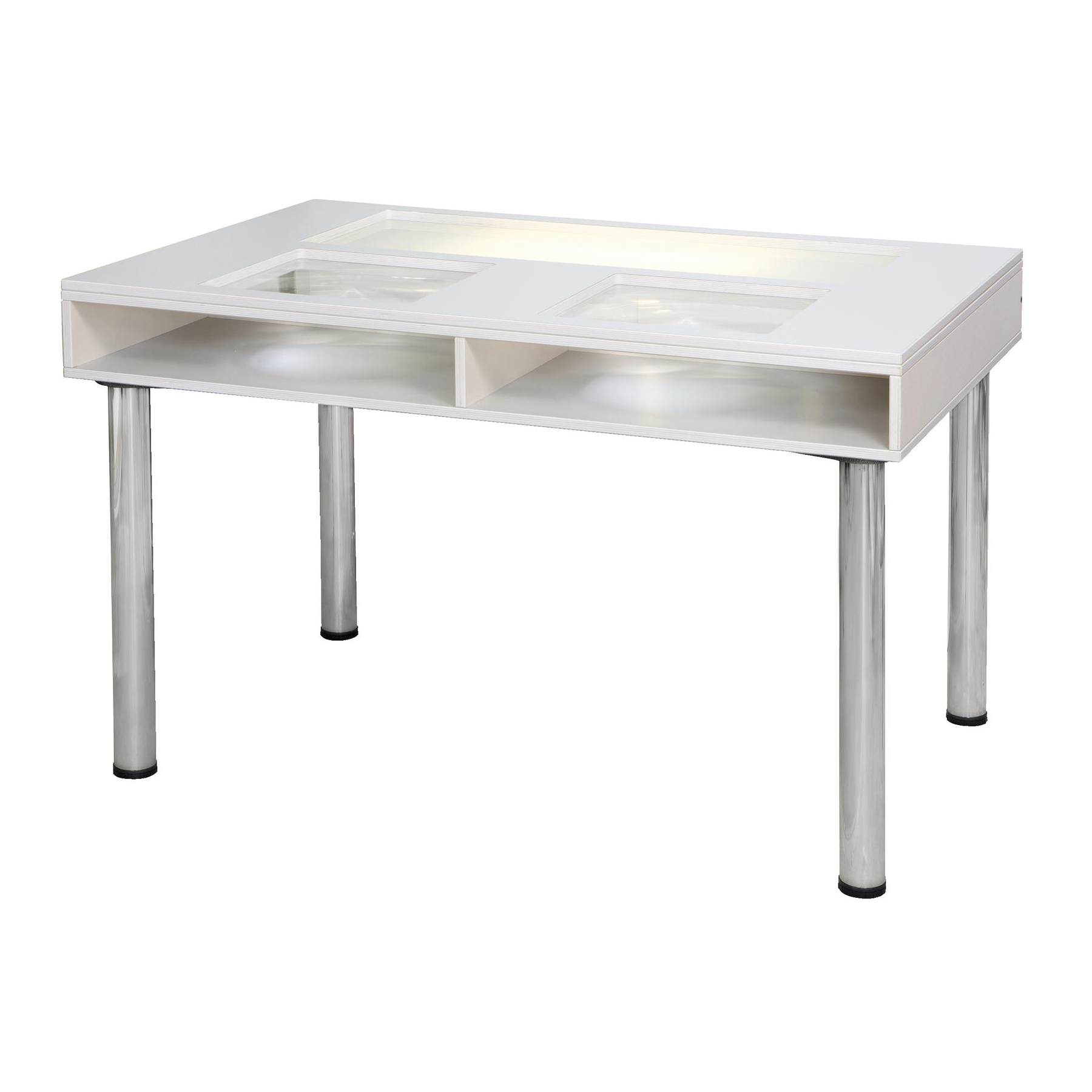 Kombinert lys- og forstørrelsesbord. Inneholder plasser med optiske linser for forstørring og lysbord. Av hvitpigmentert bjørkekryssfiner med bordplate i grå laminat. Topplater følger med slik at bordet kan benyttes som et vanlig bord. El. godkjent sikkerhetsglass. Mål: 120x75xh73 cm. Leveres med runde metallben.