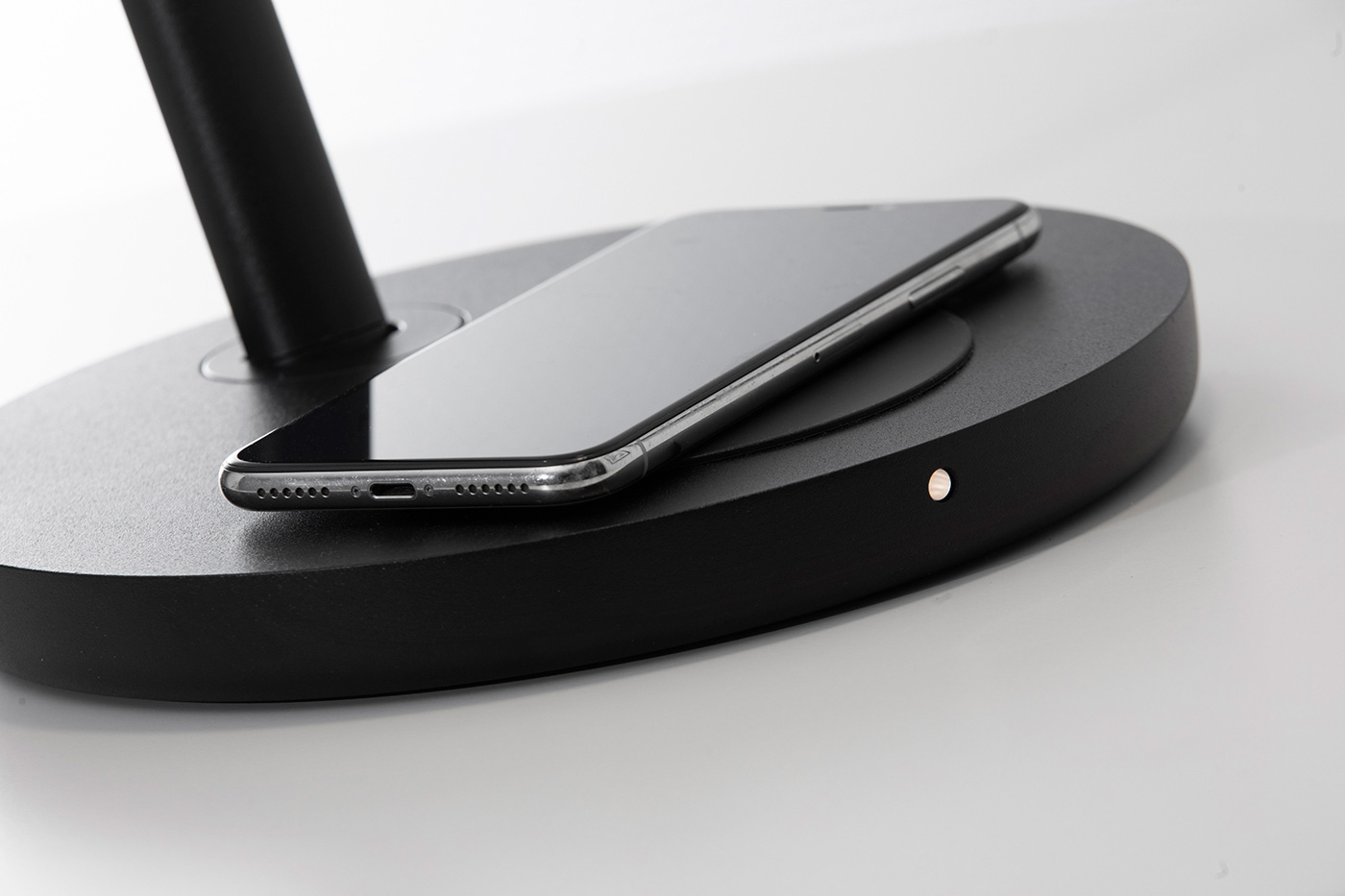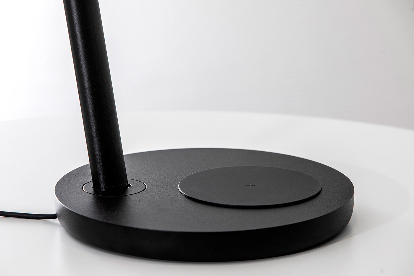Med motus induktiv base har du en ladeplass som er lett tilgjengelig i foten av skrivebordslampen. Enkel trådløs lading av mobiler som er forberedt for trådløs lading.