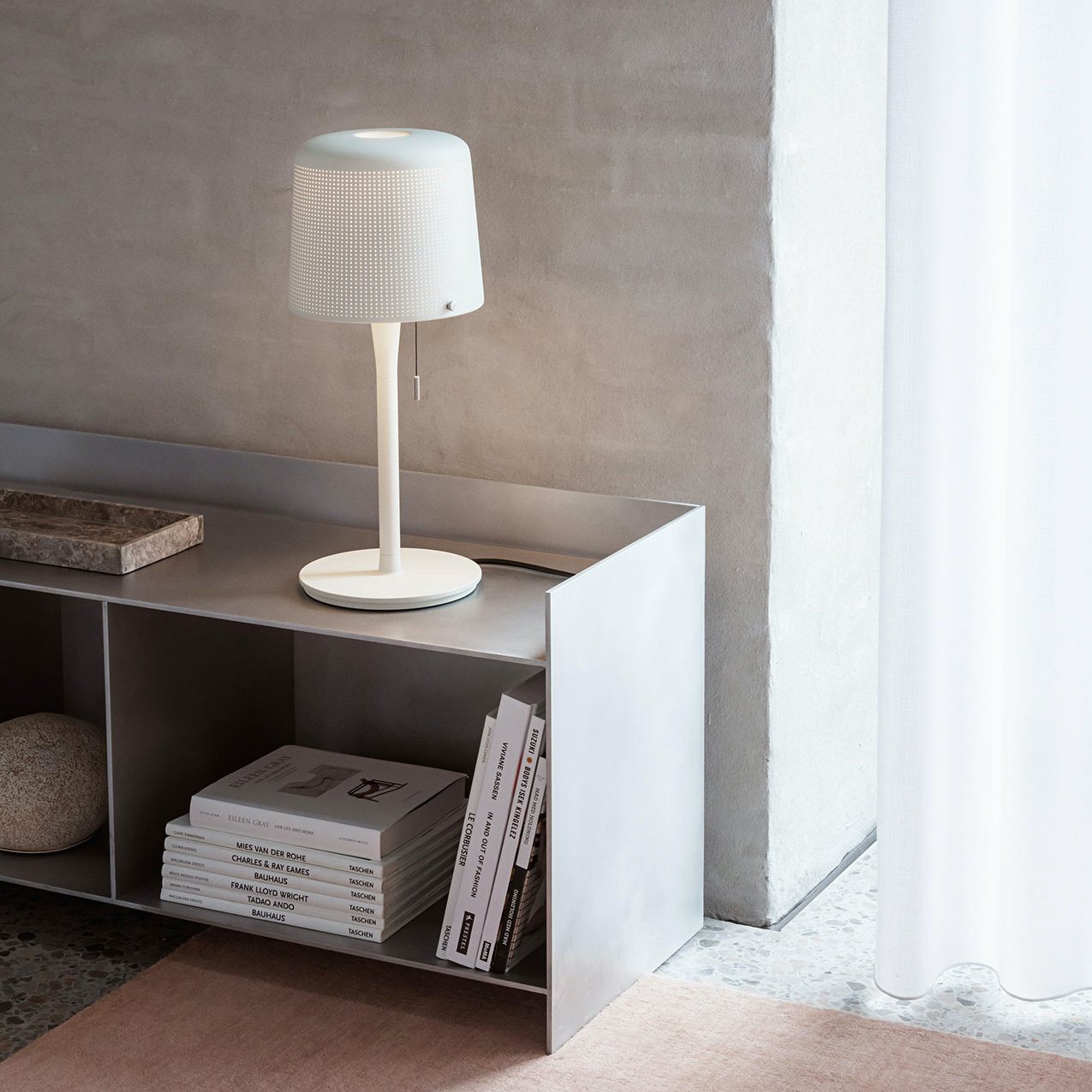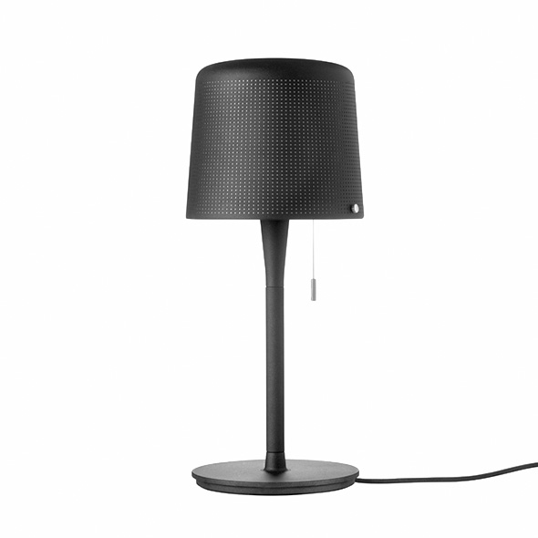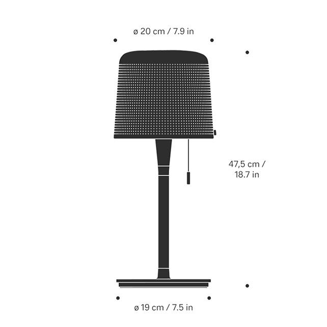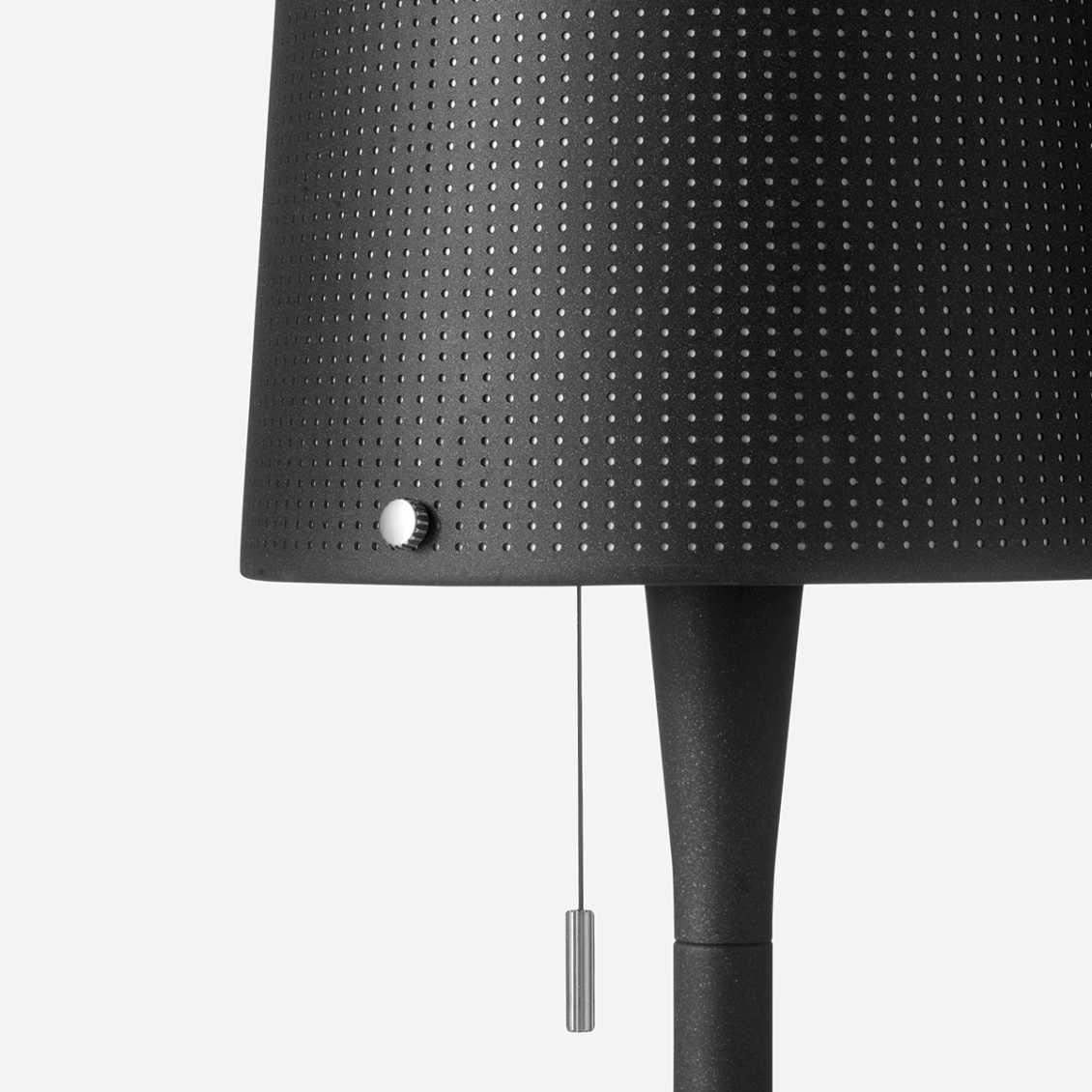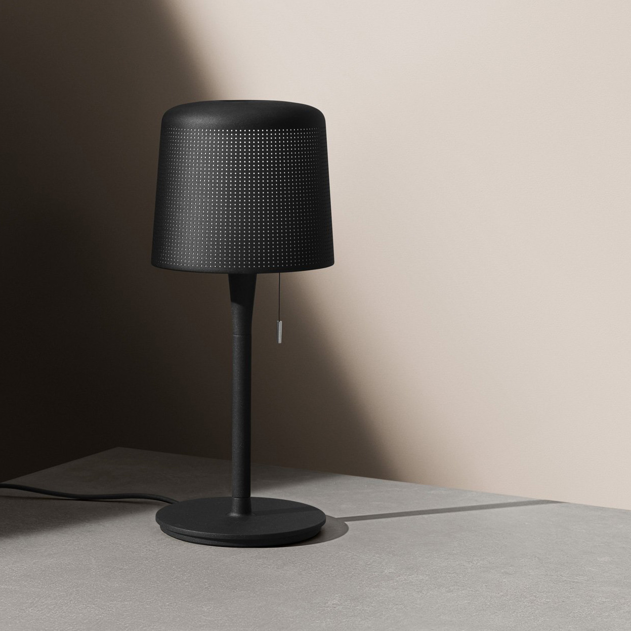Vipp bordlampe er utstyrt med en tråd til å trekke i samt en solid fot som sikrer stabilitet. En innebygd reflektor fører lyset rett nedover, og den perforerte lampeskjermen gjør lyset mykt og behagelig, noe som gjør at lampen passer utmerket på nattbordet eller på et skatoll.