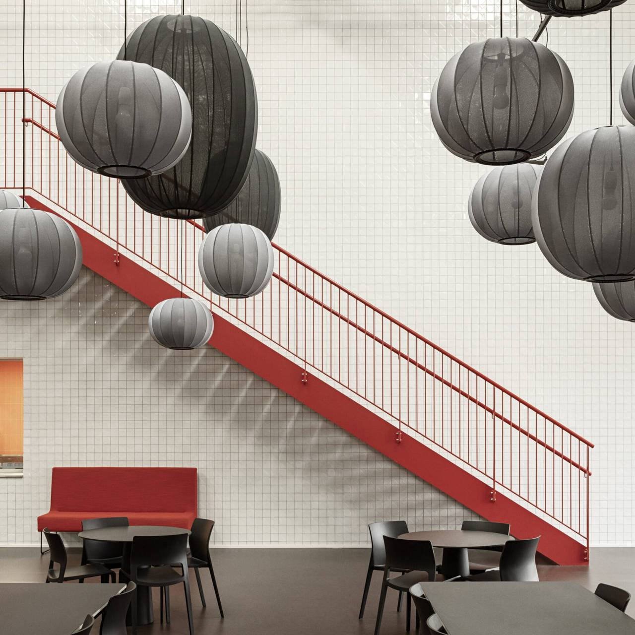 Lampeskjermen er laget av 3D strikket flammehemmende polyester.