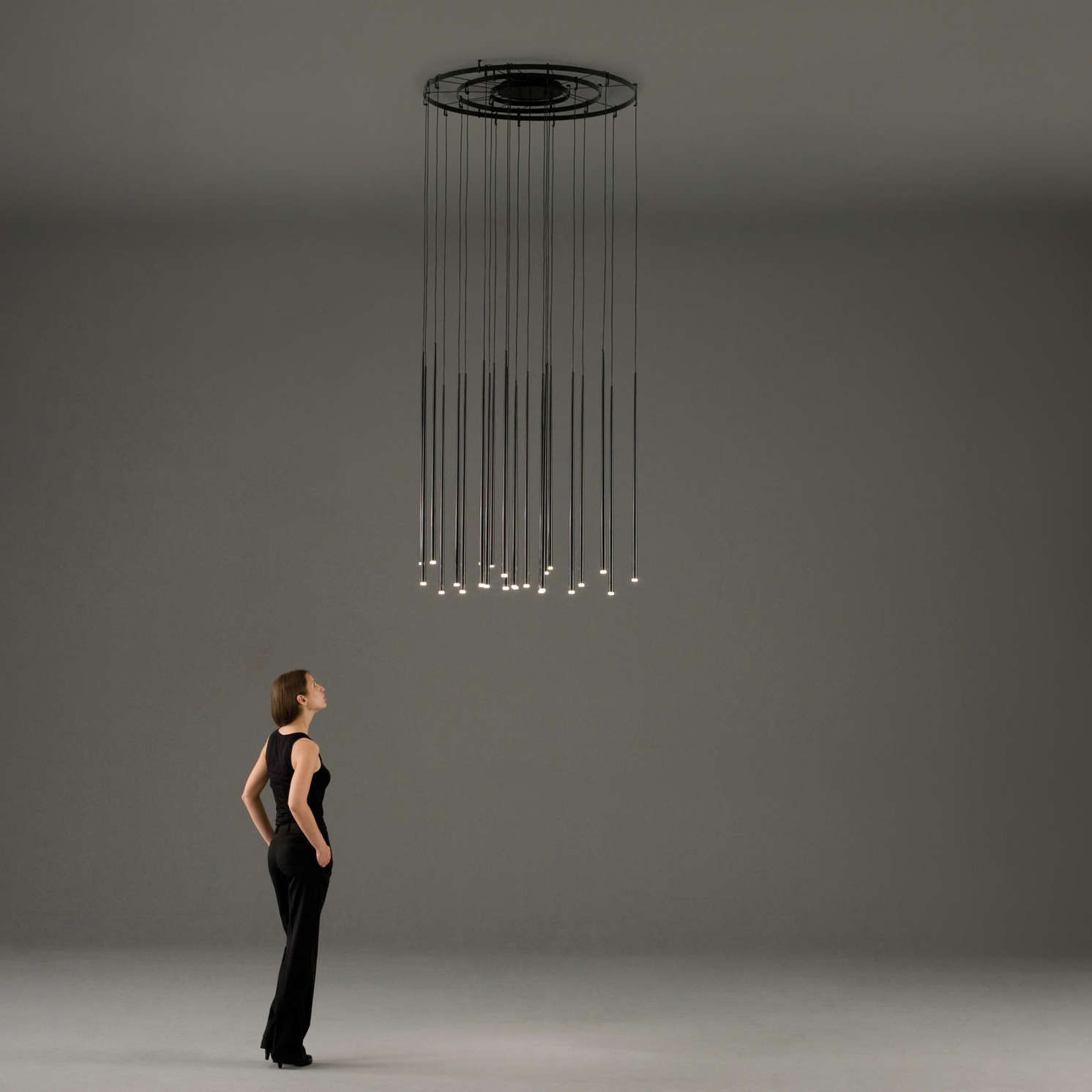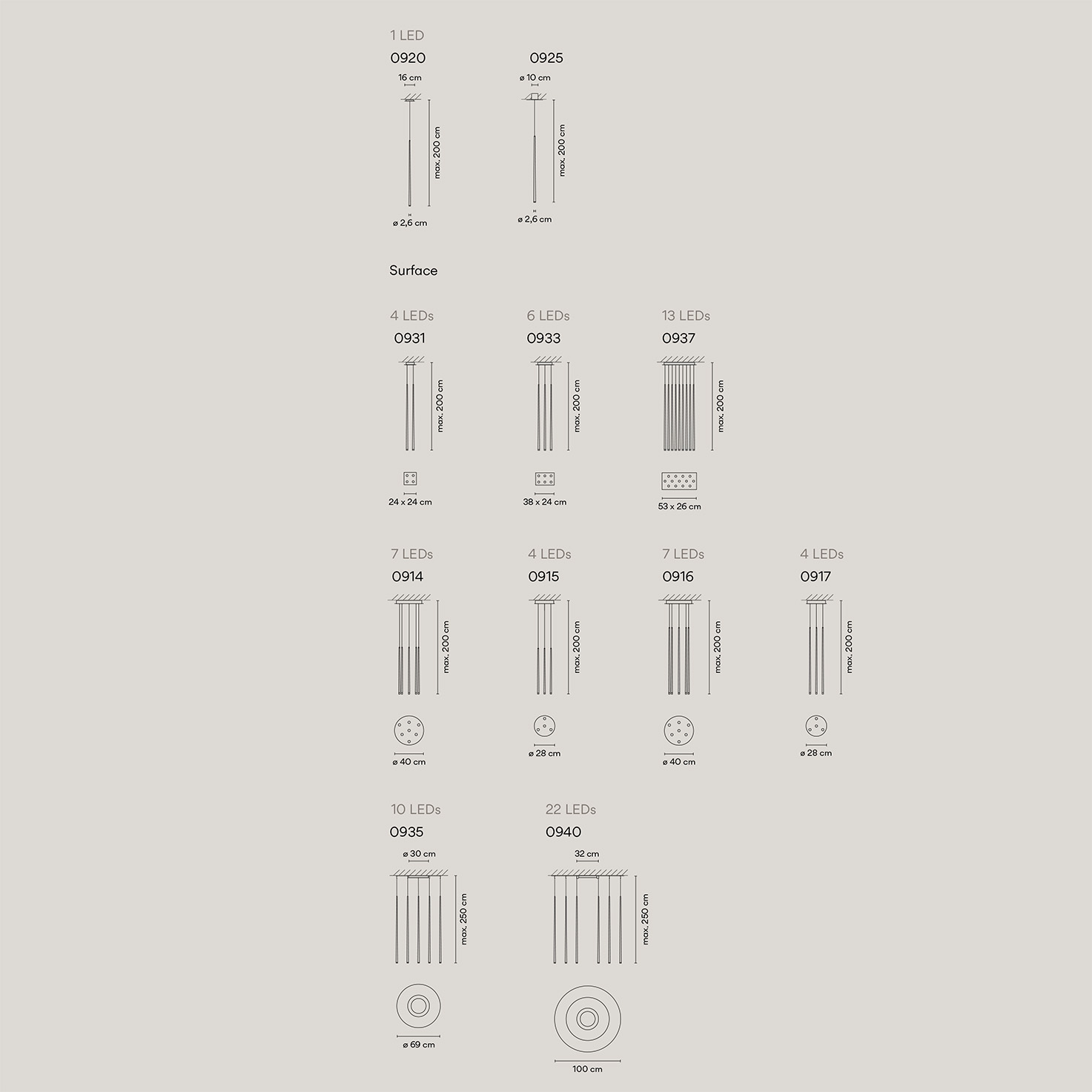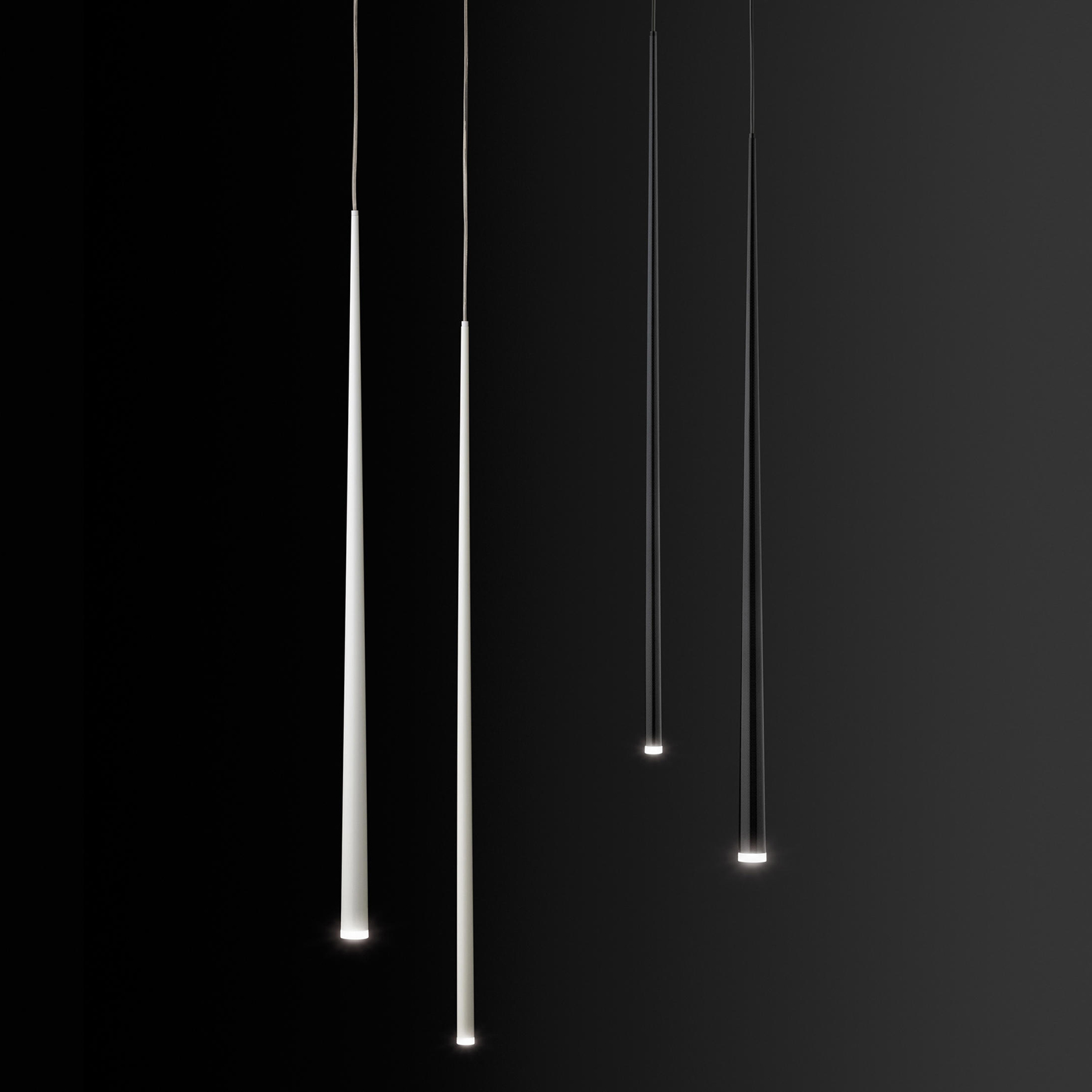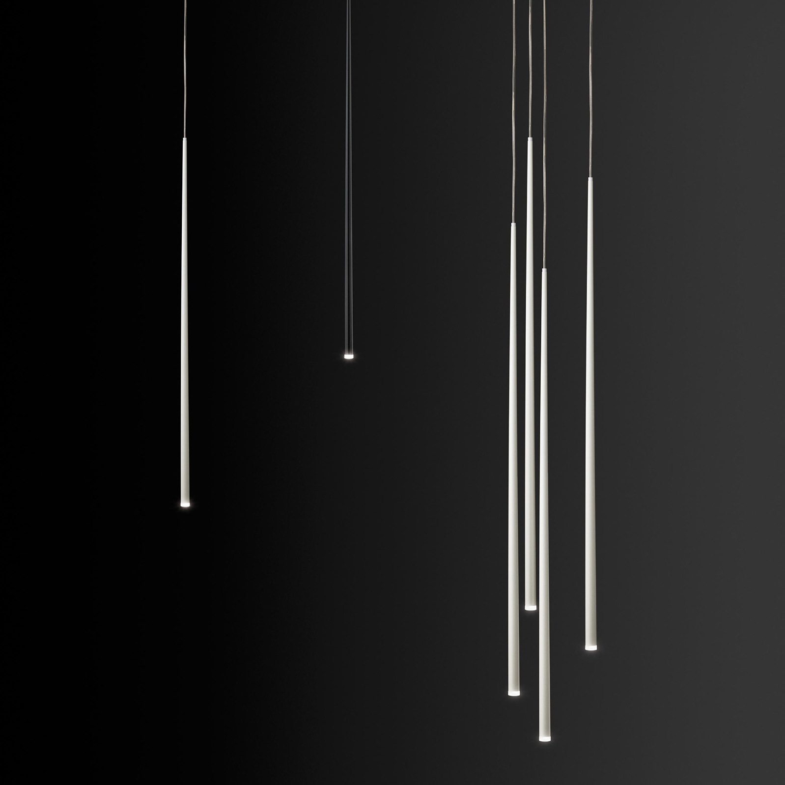 Slim hengende lampekolleksjon for Vibia er produsert i flere versjoner: individuelle, 4, 6, 7, 10, 13 og 22 kjegler. Alle modellene som tilhører Slim-kolleksjonen er tilgjengelige i to farger: hvitlakkert fiber eller sort karbonlakkert fiber som standard, eller alternativt i flere standard farger hos Vibia.