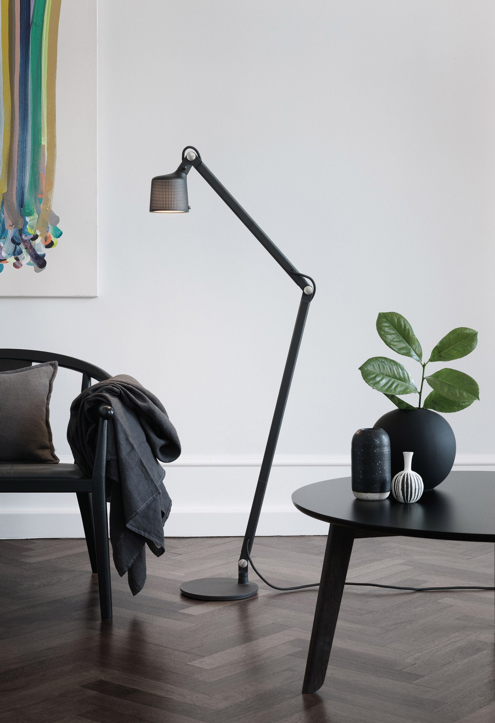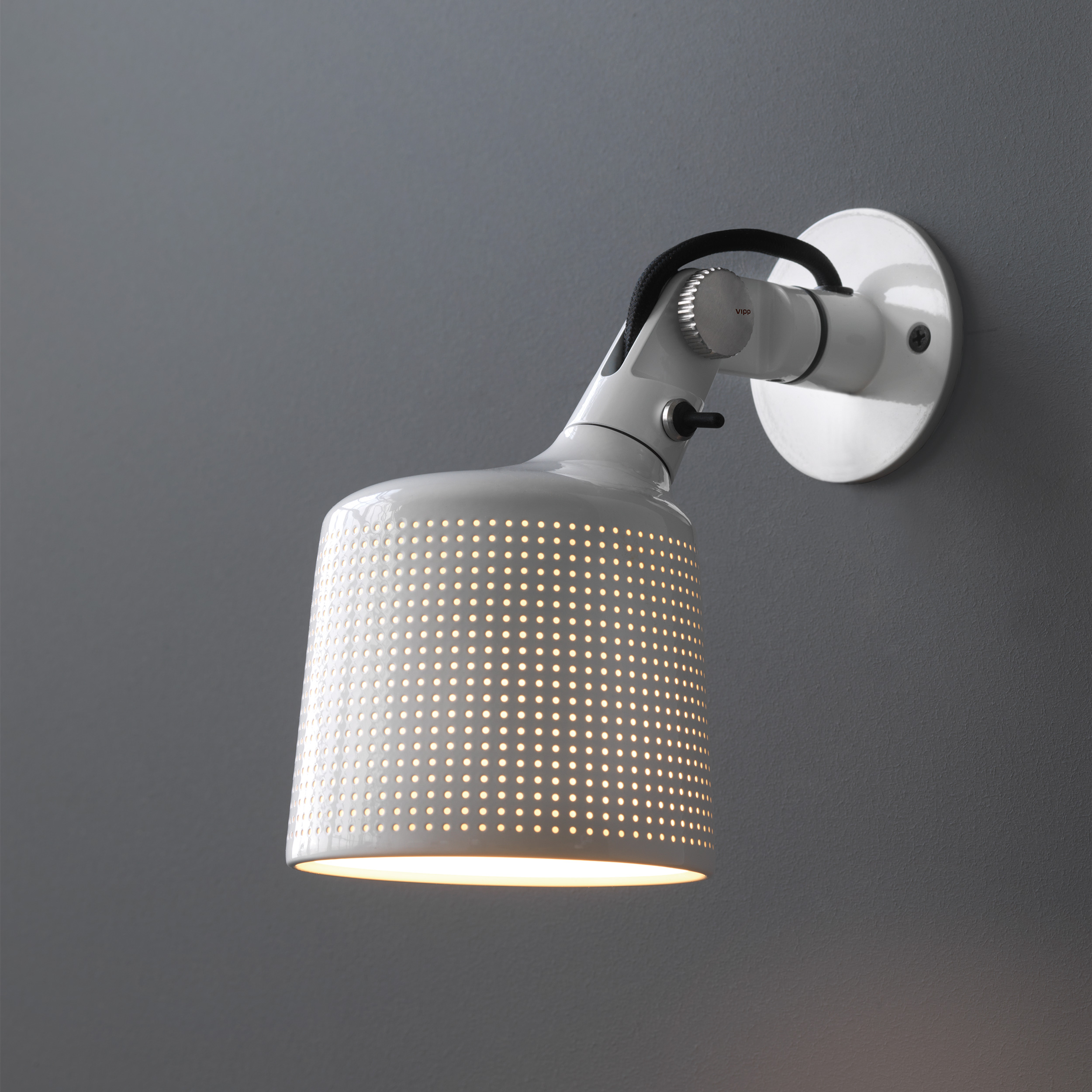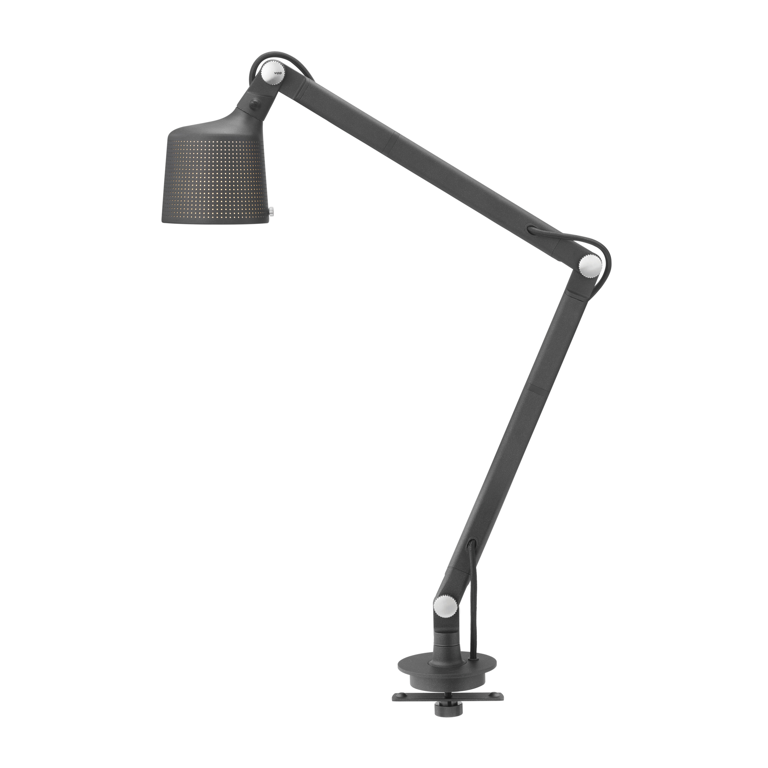 Lampene er nøysomt forarbeidet i pulverlakkert aluminium og stål, og har en perforert skjerm og glasslinse for en behagelig spredning av lyset. Lampen er utstyrt med detaljer, slik som en justerbar armer for fokusert lys og fingerskruer for å låse posisjonen. På grunn av den raske utviklingen i LED-teknologi, har alle Vipp-lamper en utskiftbar LED-lyskilde. Dette lar deg oppdatere Vipp-lampen din til den beste lyskvaliteten og gir deg en lampe som er tidløs i både design og funksjon. E14 maks 22 Watt. Kompatibel med lyspærer i energiklassene A++ til E. Lampene fås i sort, foruten veggspot som også fås i hvit.