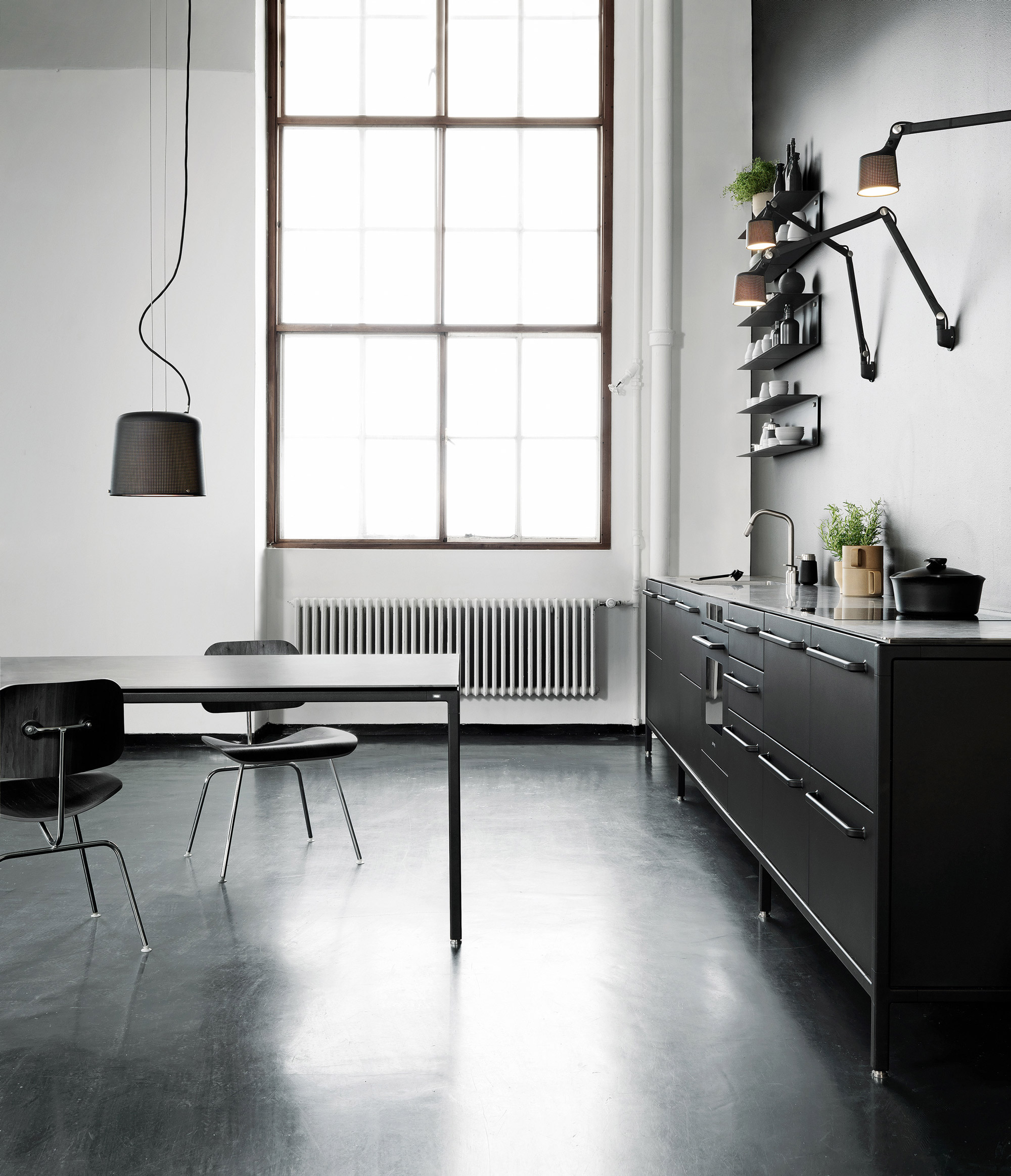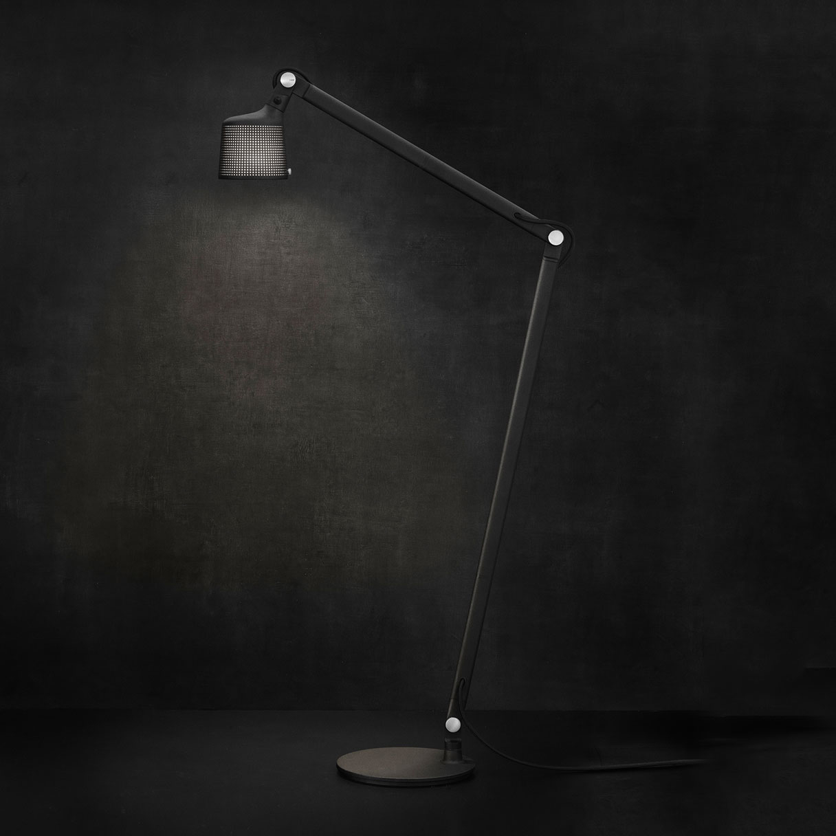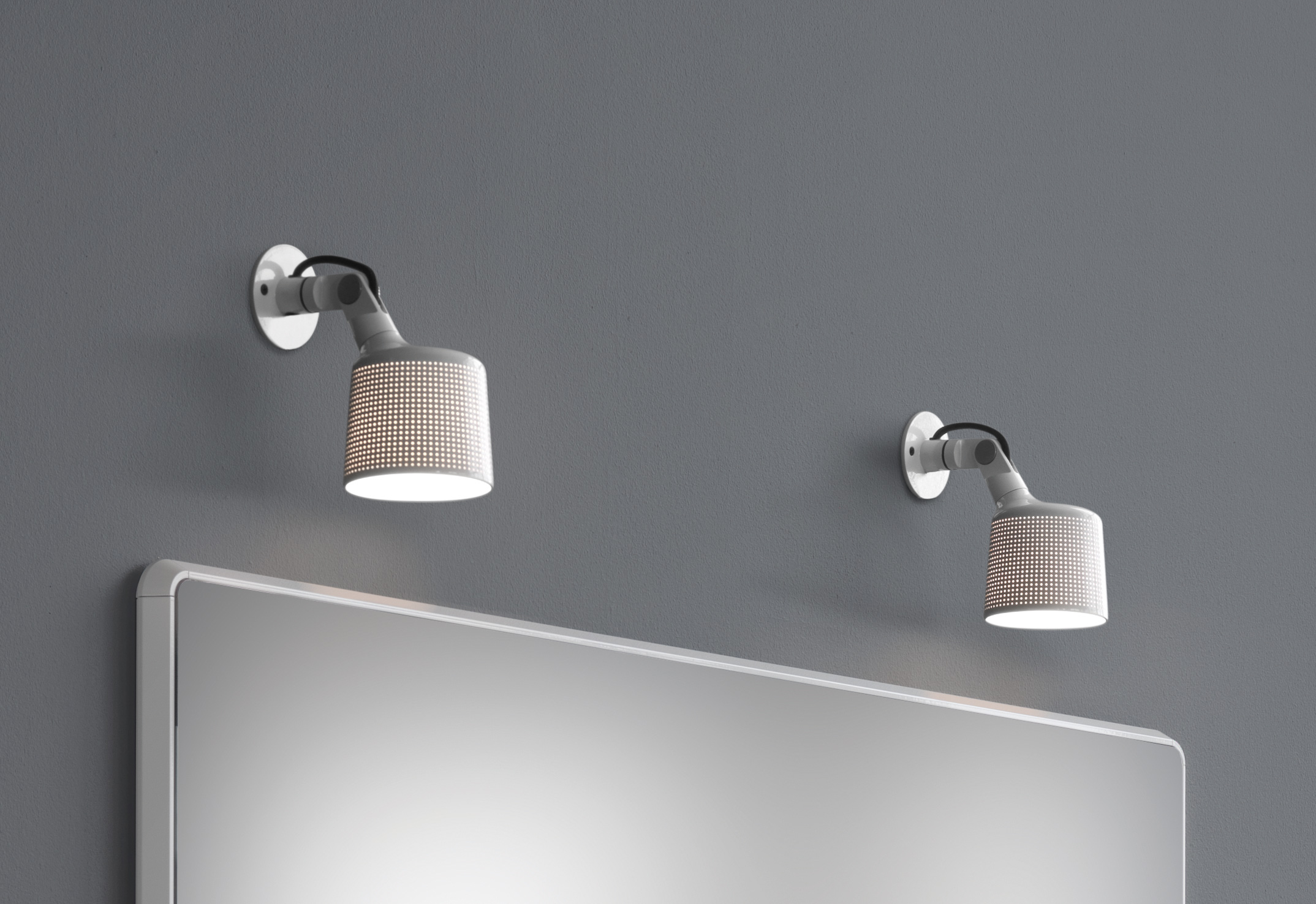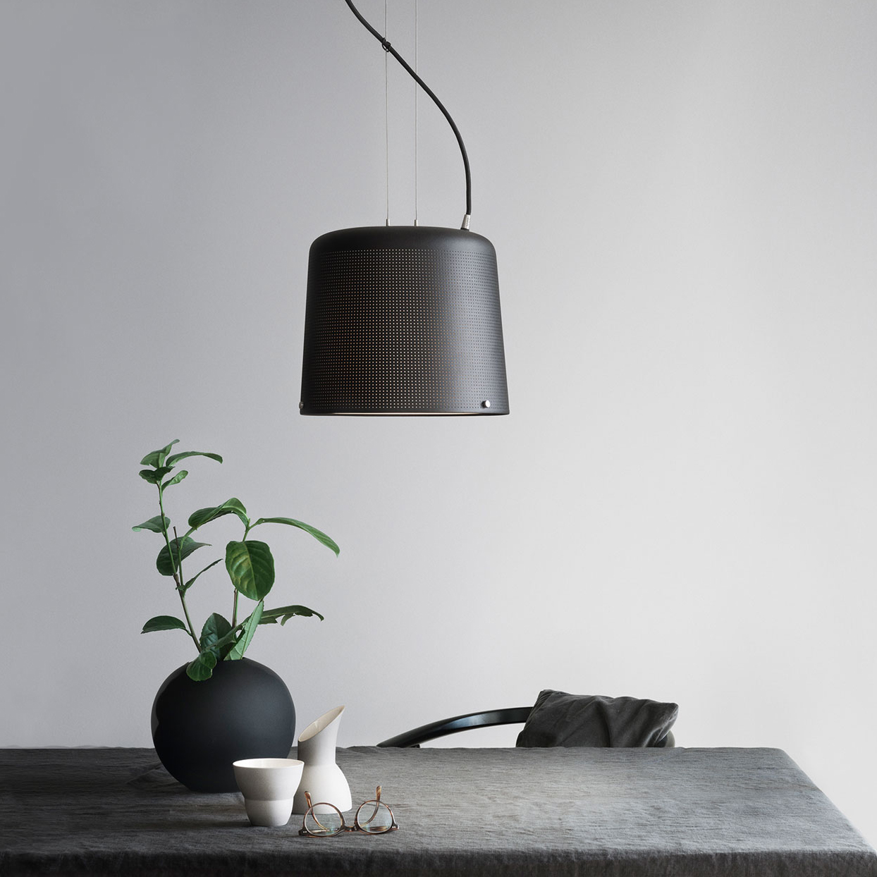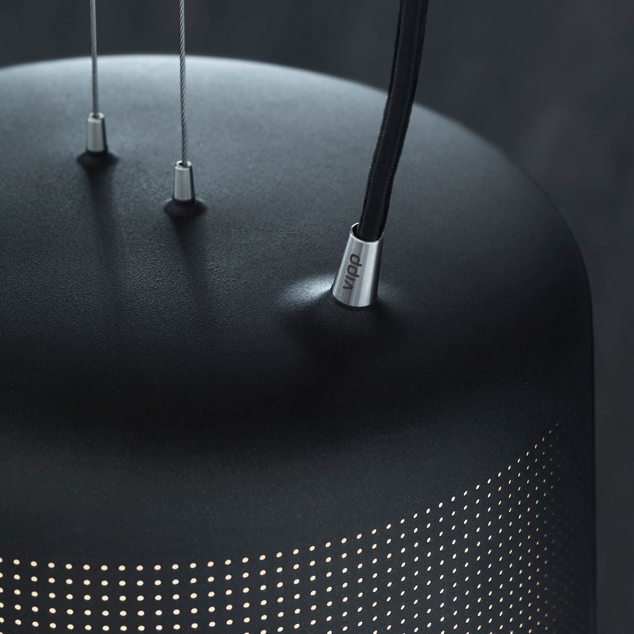 Pulverlakeret aluminium, stål, stofftrukket silikonledning. IP 20.