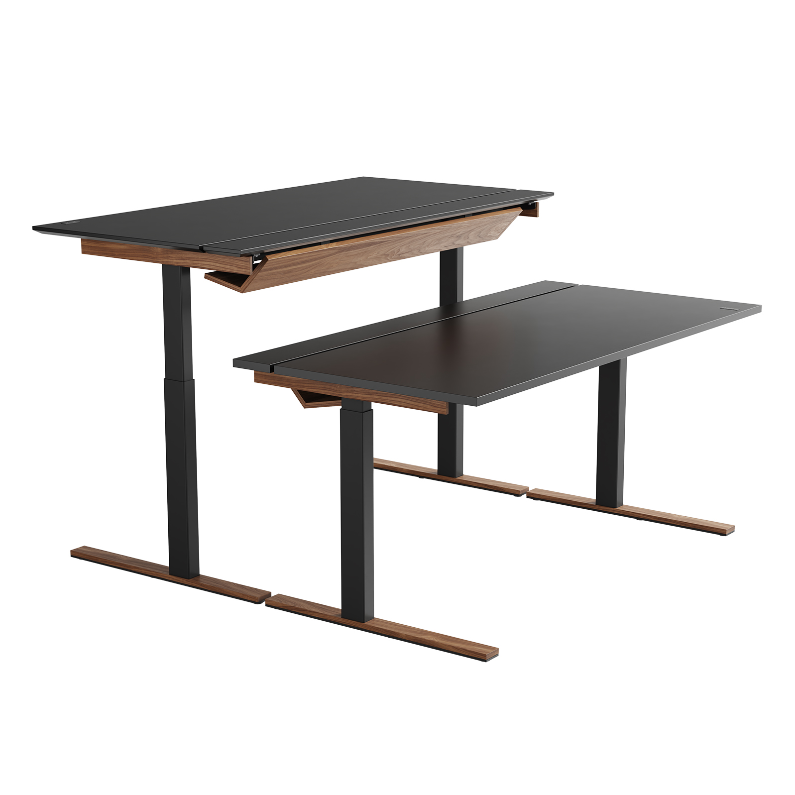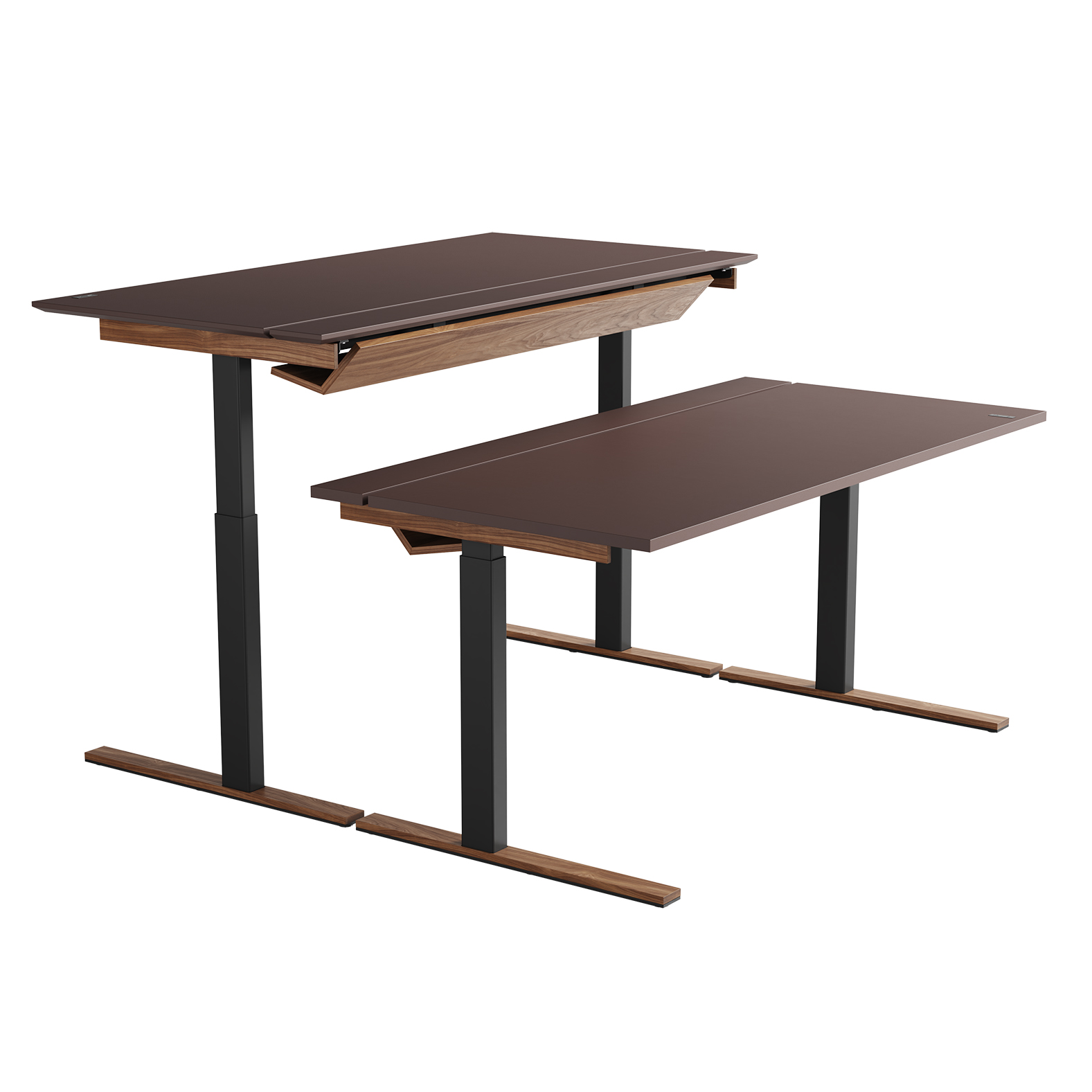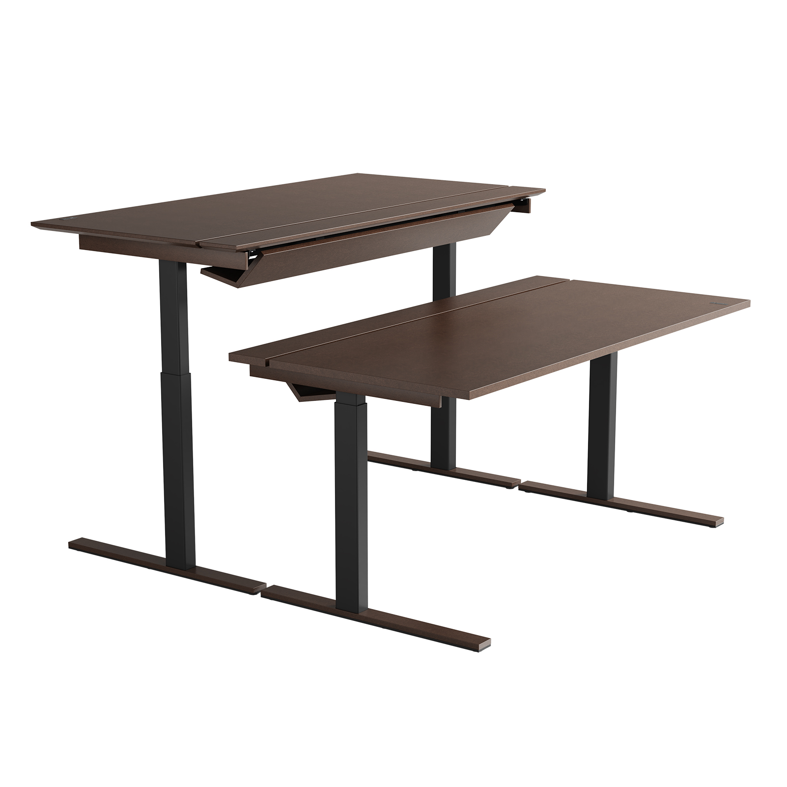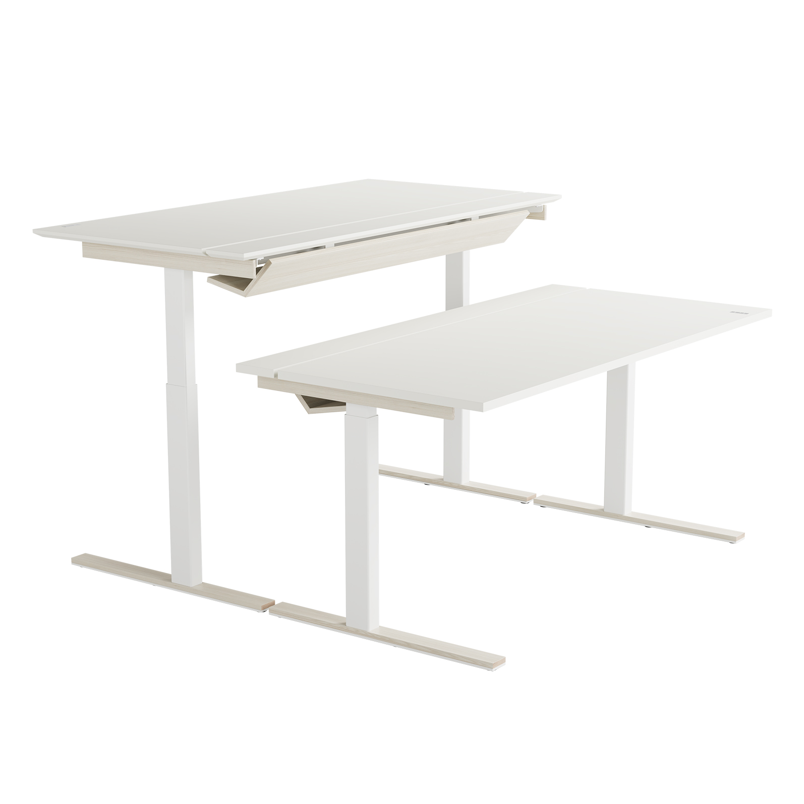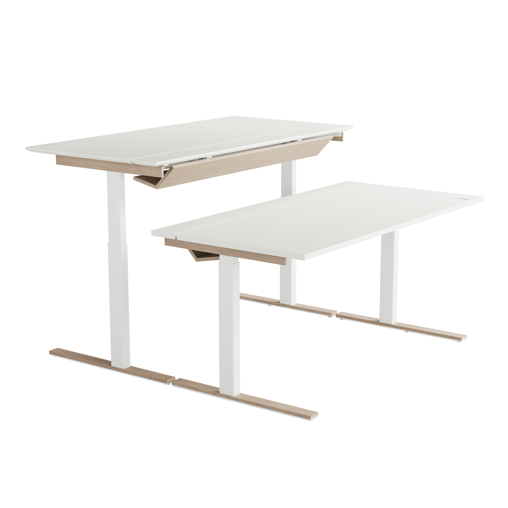 Den delte bordplaten er en stilig, enkel og praktisk måte å skjule kabler på, men også en enkel måte å tilgang til kablene ved behov. Det vakre designet til kabelrennen i tre eller Valchromat legger til prikken over i’en på bordet.