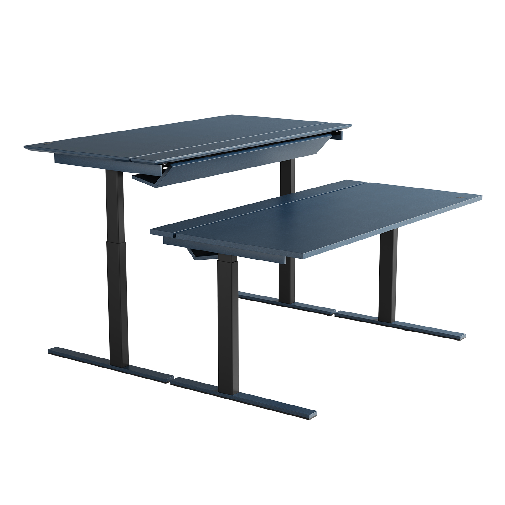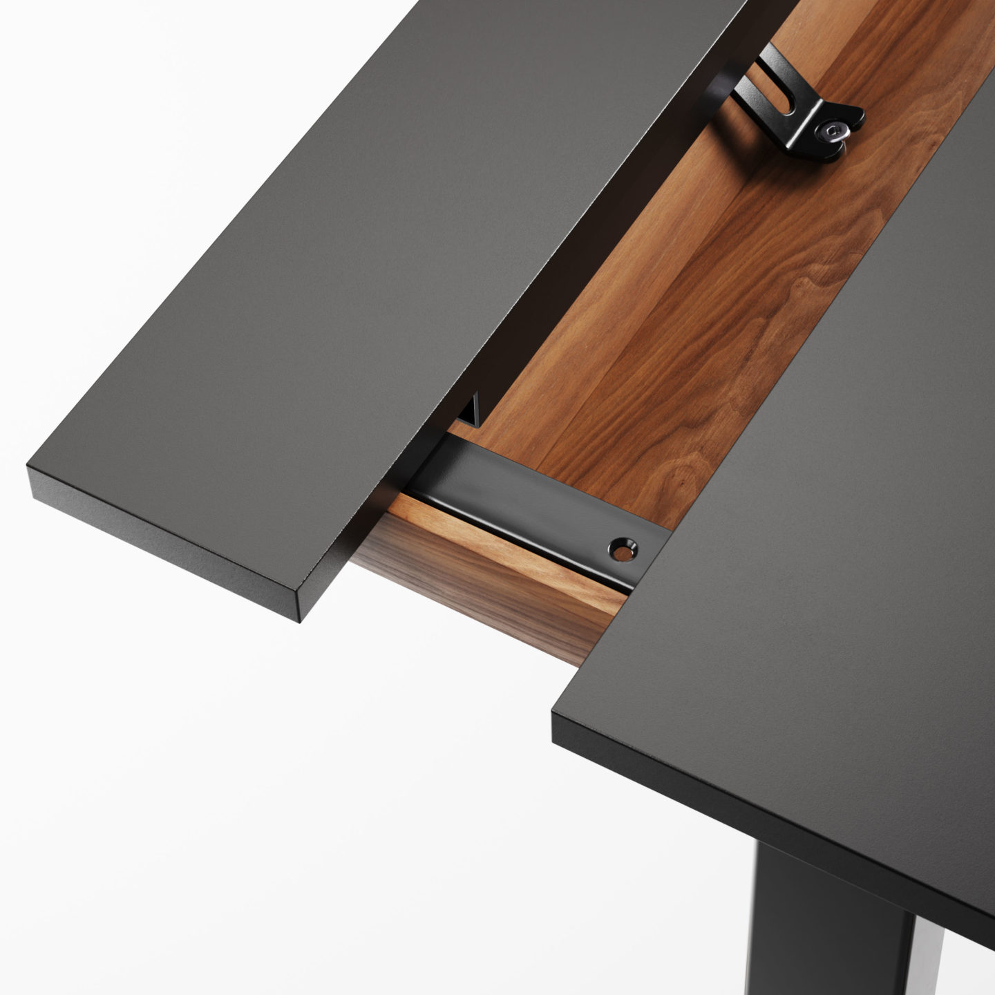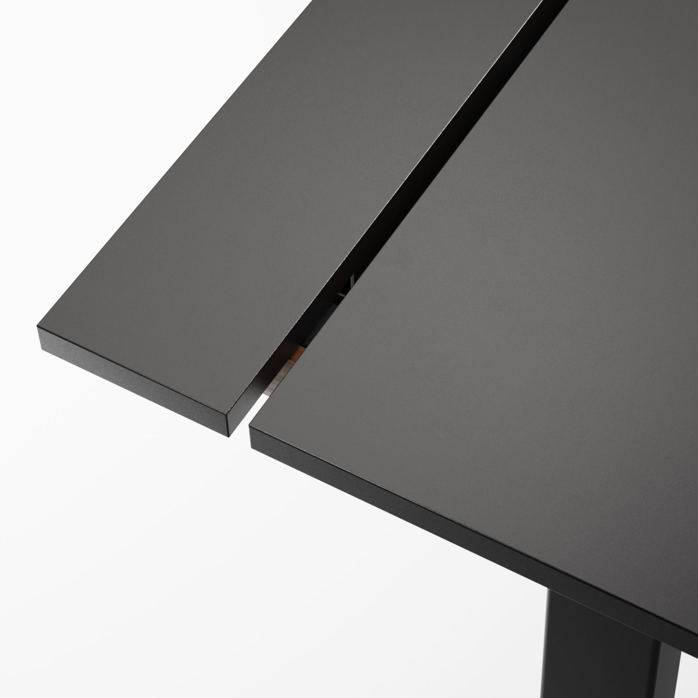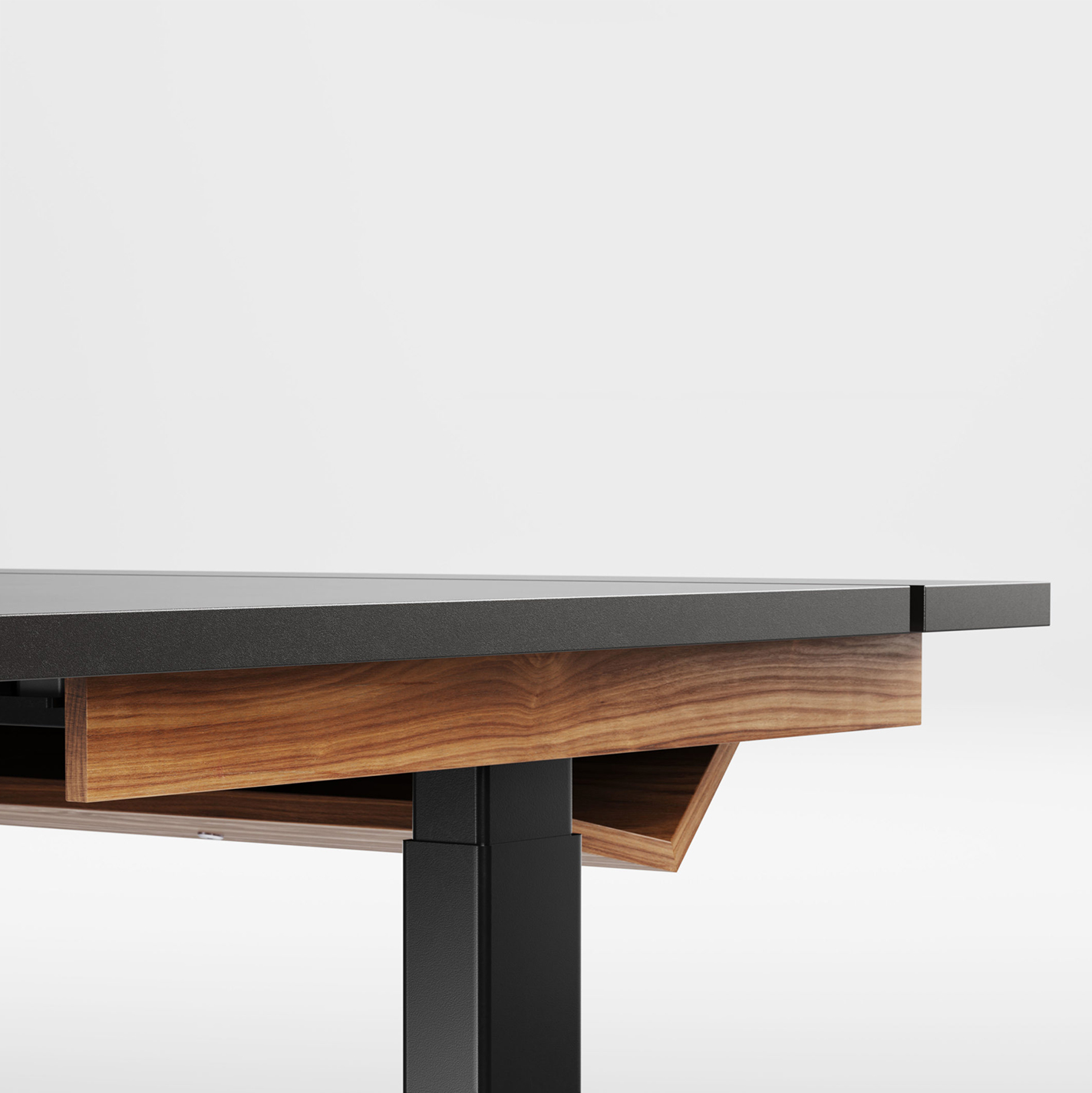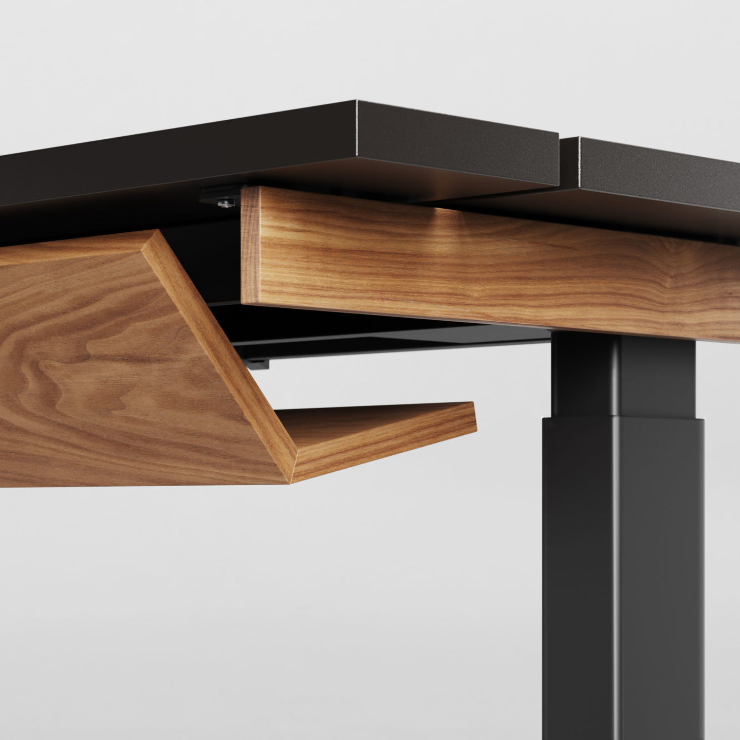 Den delte bordplaten er en stilig, enkel og praktisk måte å skjule kabler på, men også en enkel måte å tilgang til kablene ved behov. Det vakre designet til kabelrennen i tre eller Valchromat legger til prikken over i’en på bordet.