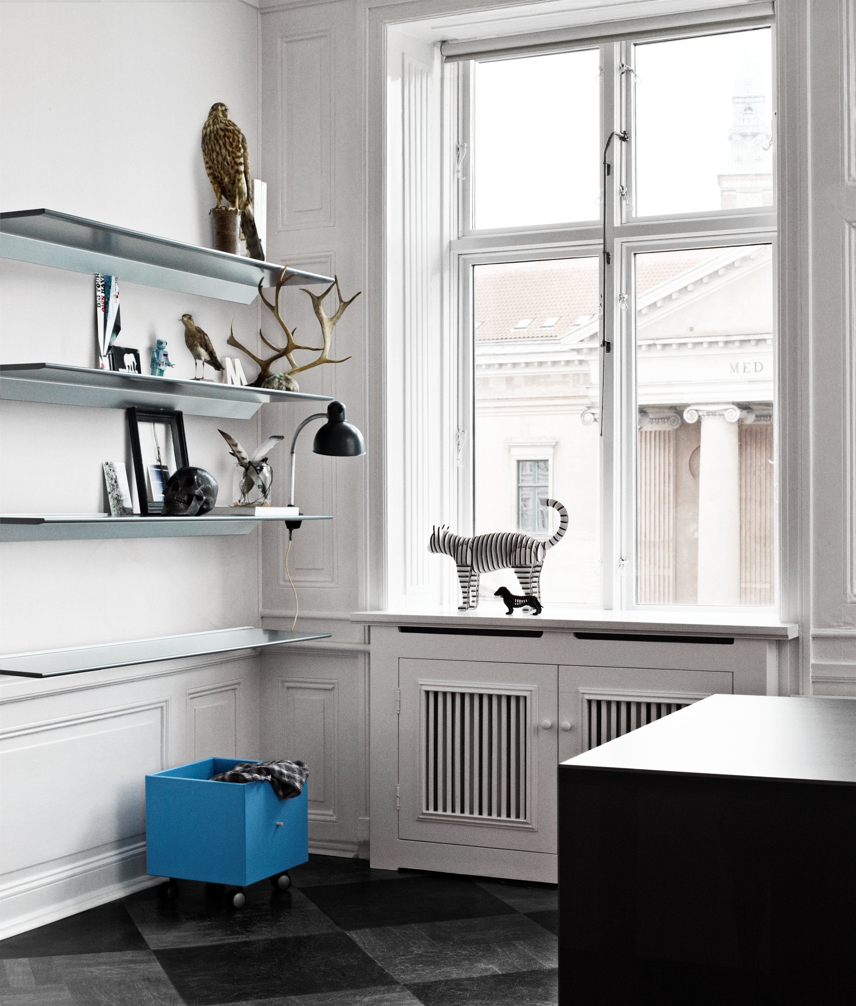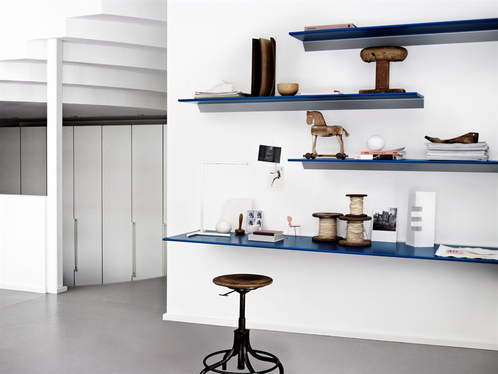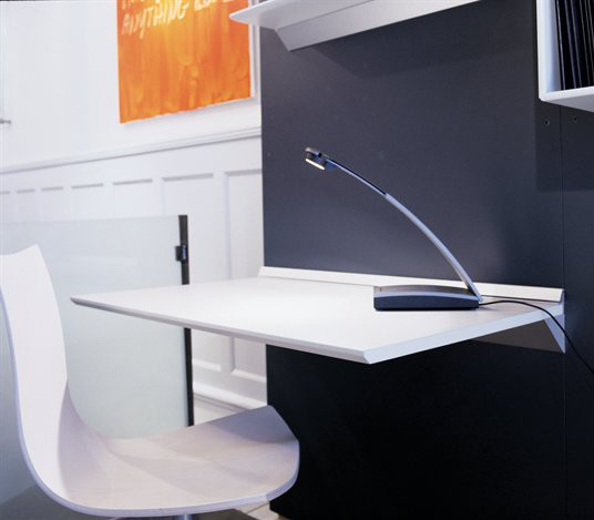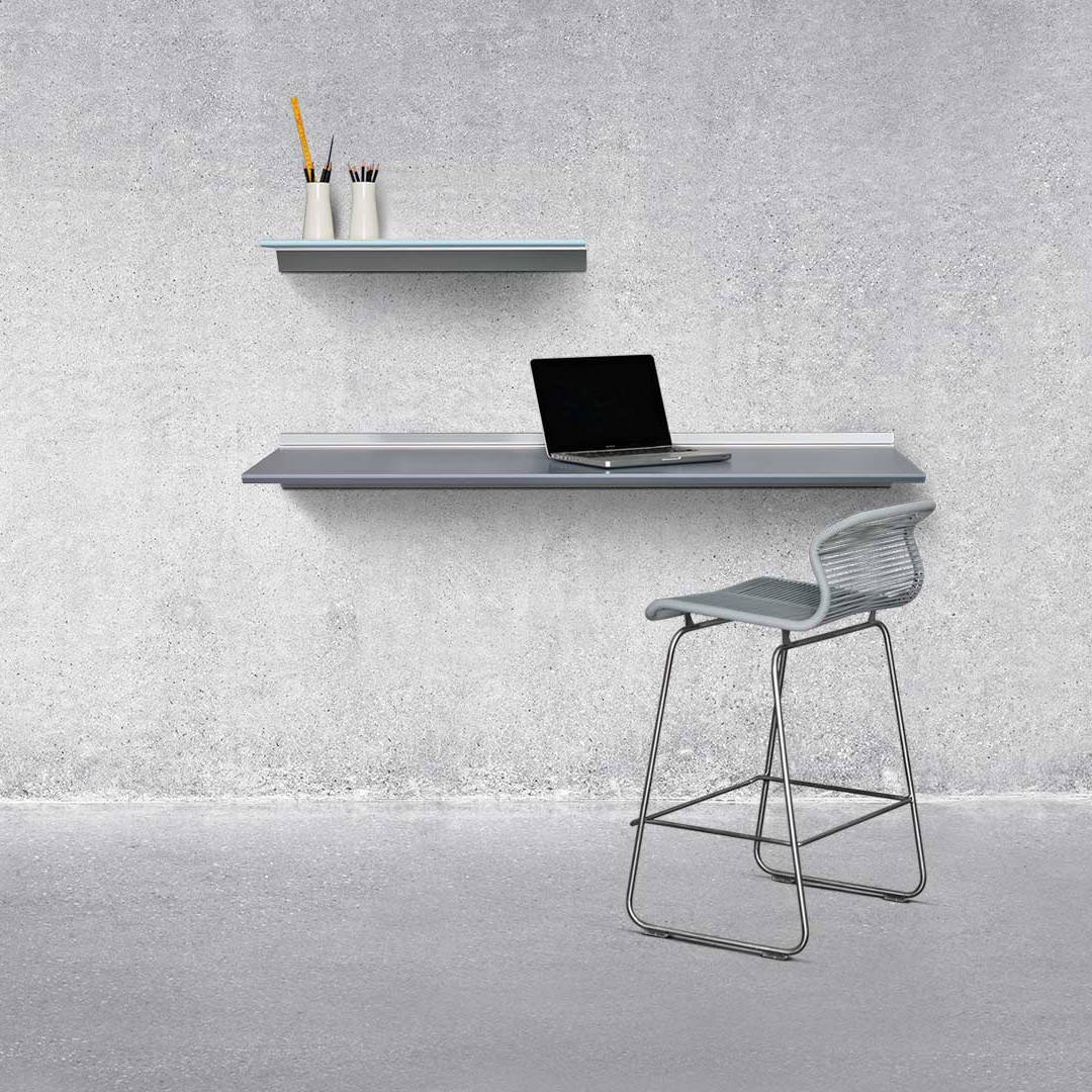 Skyline bord, i 19 mm MDF plate, leveres i 7 Compo lakker og 8 laminatfarger. Bordet monteres direkte i betongvegg. Tåler da en belastning på opptil 90 kg.