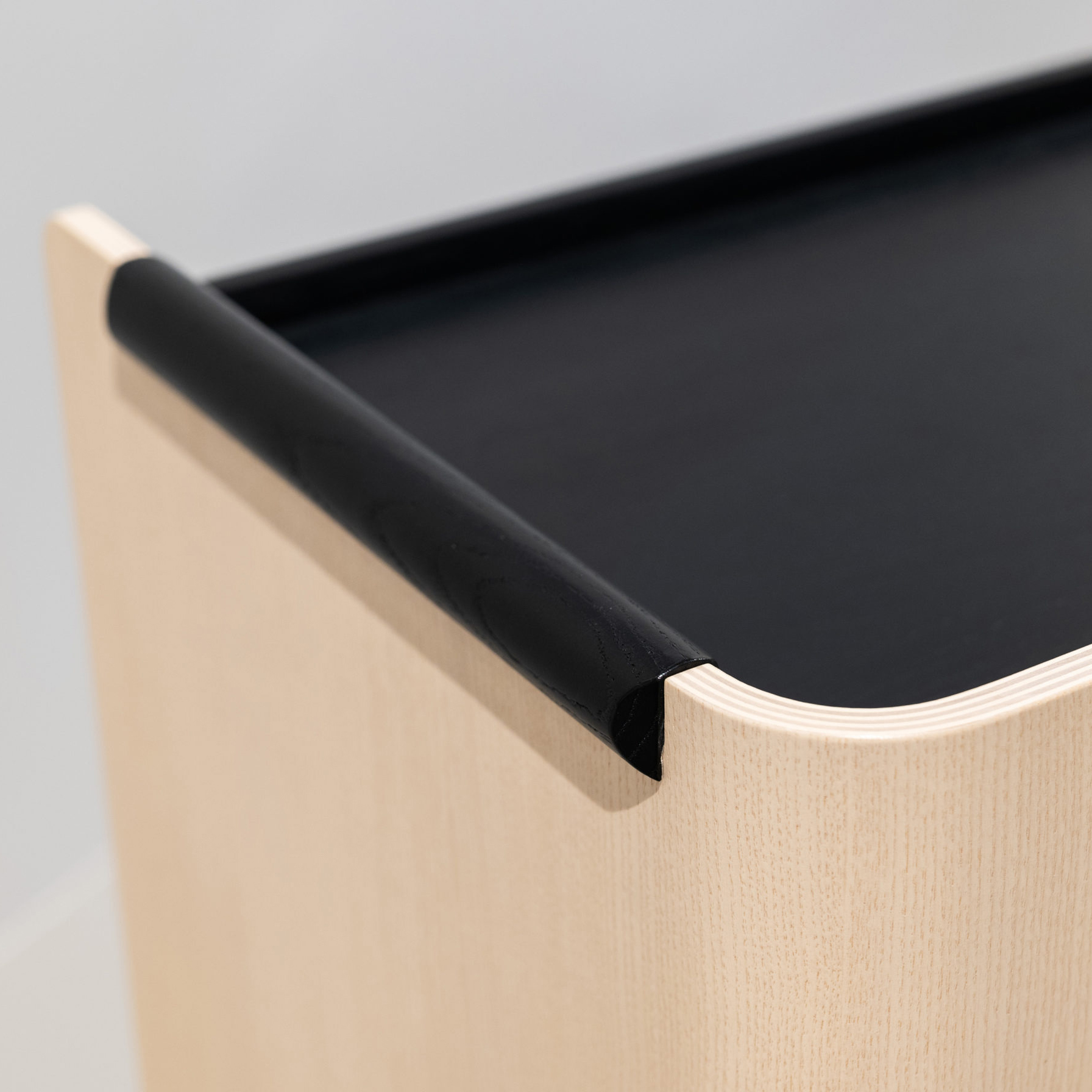 Støpt bjørkefiner med eik eller ask som ytre lag, produsert i Sverige.