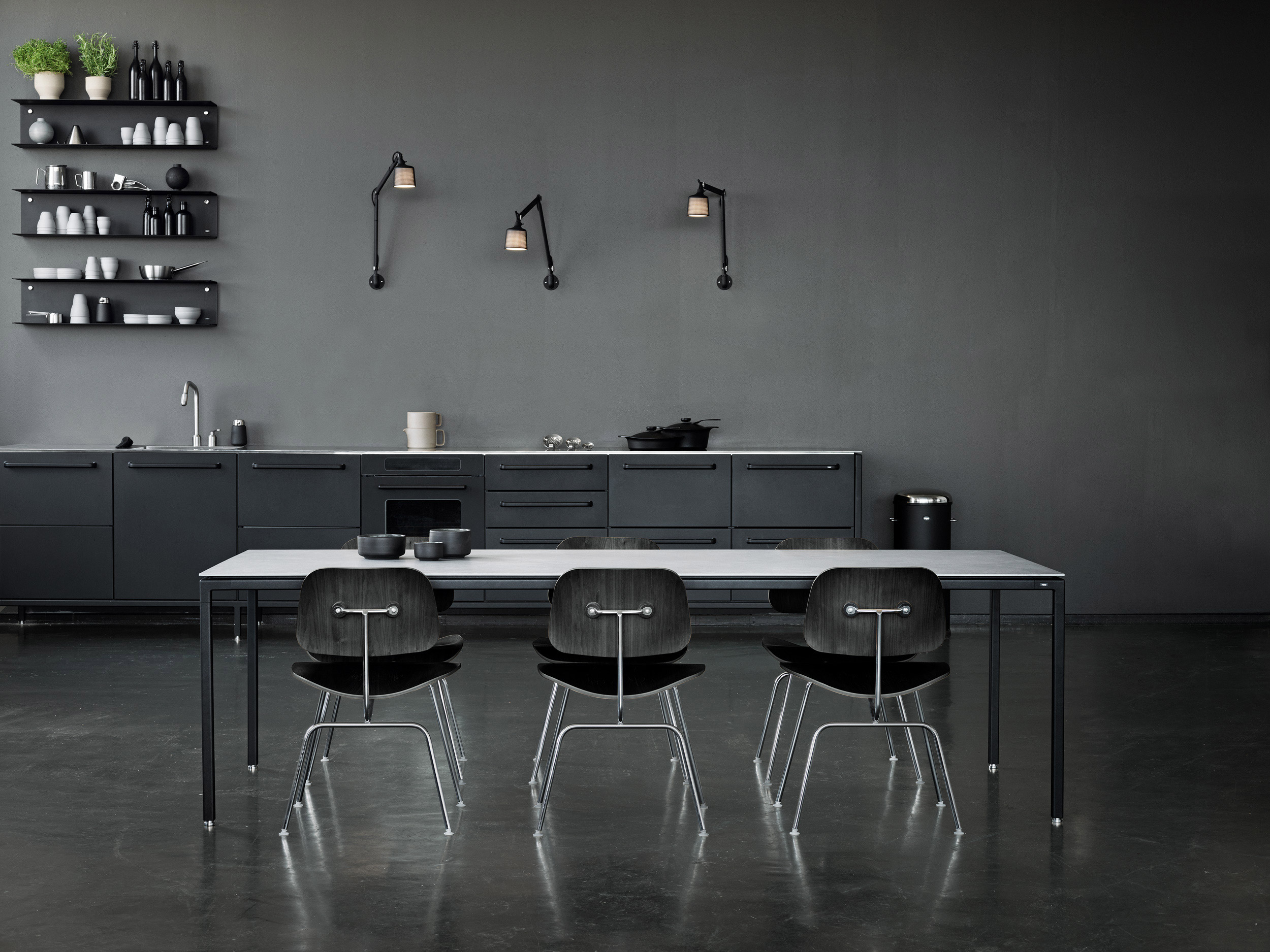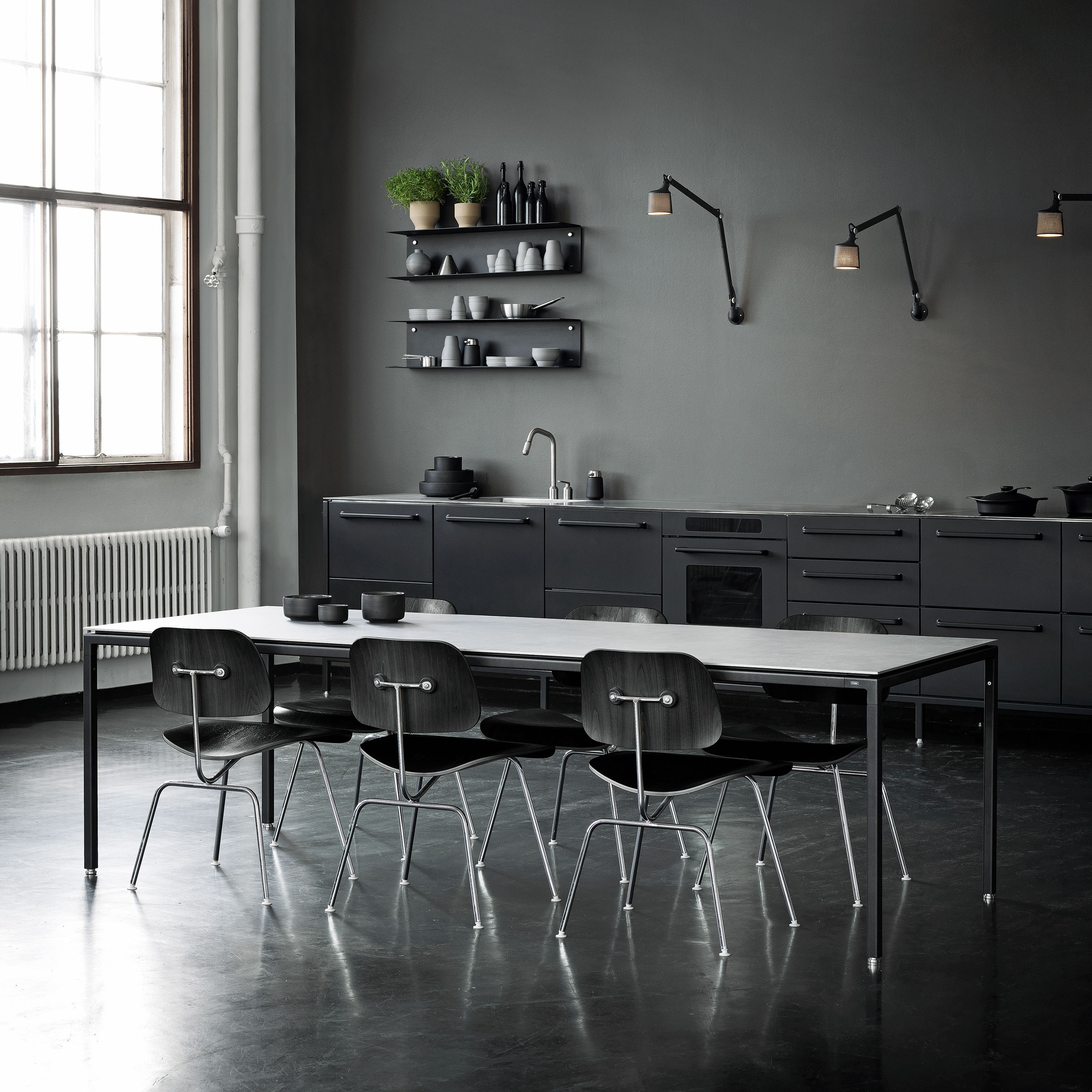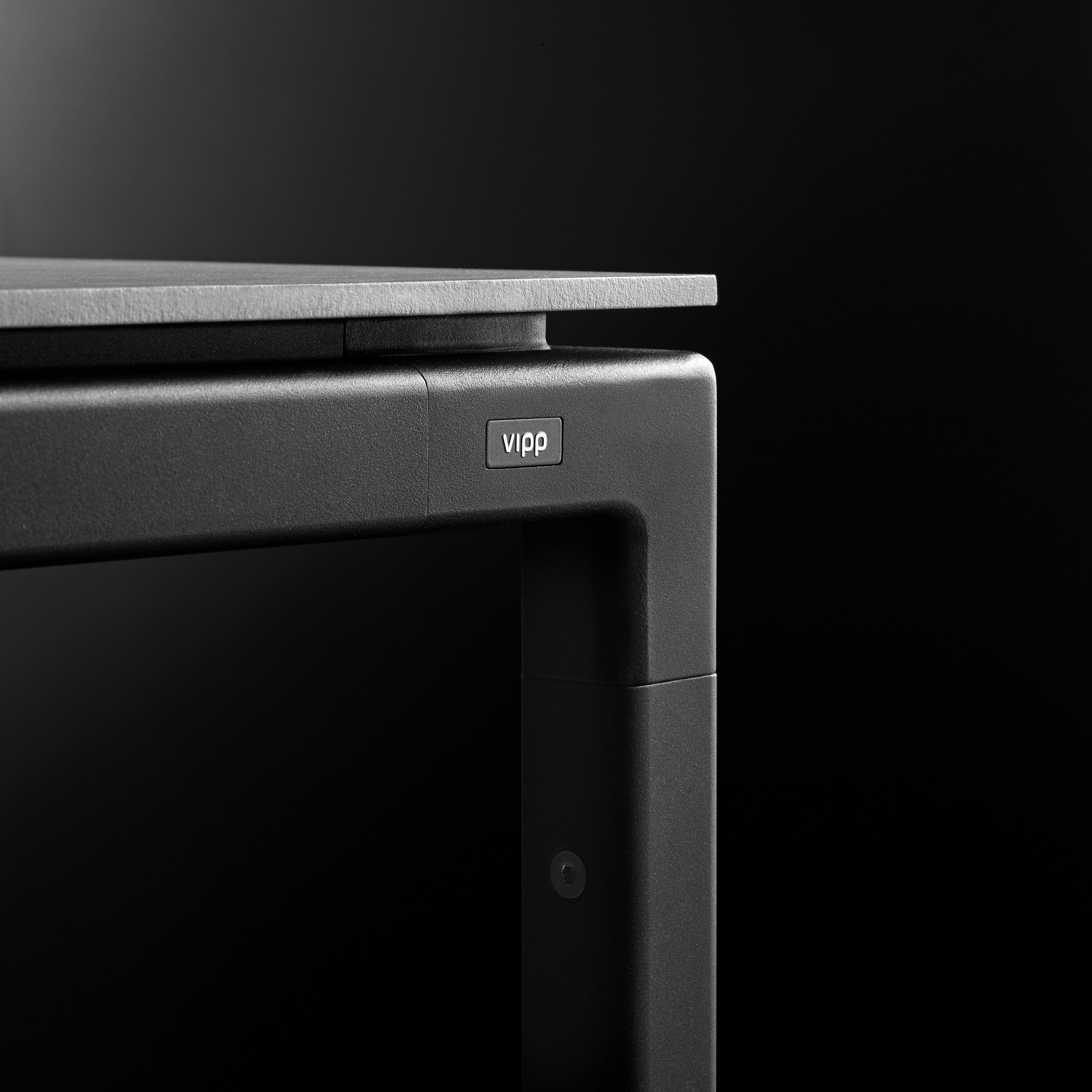 Vipp spisebord er et stort bord for spisestuen eller kjøkkenet. Bordet er tilgjengelig i 2 ulike lengder og er svært bestandig. Det er utstyrt med en keramisk bordplate som motvirker flekker og slitasje fra hverdagsbruk. Rammen på stålbordet henter inspirasjon fra Vipp-kjøkkenet og bærer bordplaten på en elegant måte, og sammen med de myke, avrundede hjørnene skapes det et lett uttrykk til de robuste komponentene. Ramme med hjørner i støpt aluminium og stålprofiler. Et sett skruer i rustfritt stål gjør det mulig å justere høyden på bordet med 2 cm.