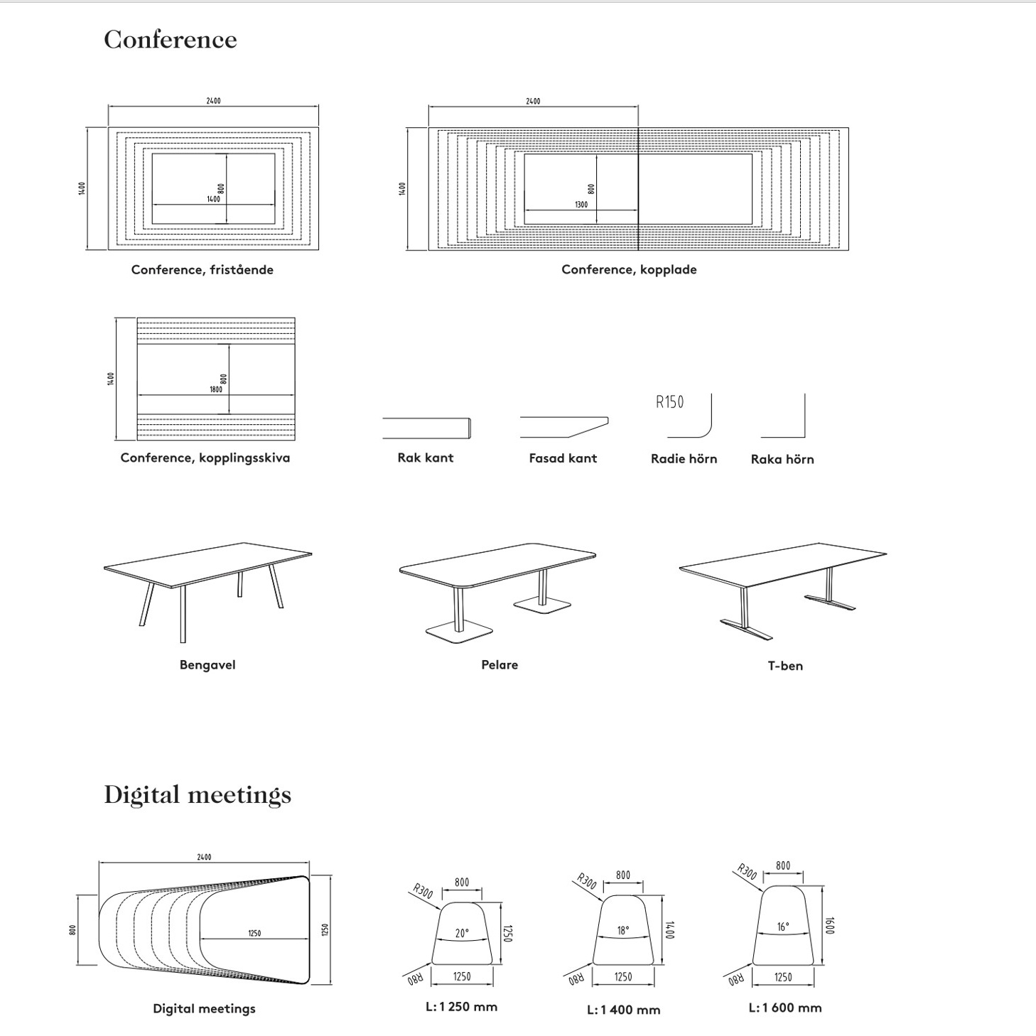 Møtebordet kan fås med rette hjørner eller med hjørneradius 150mm