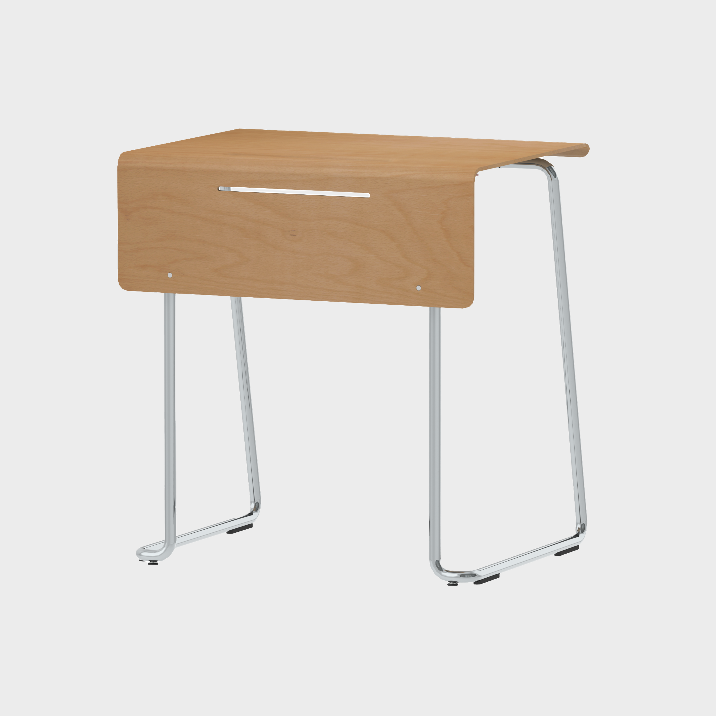 Bordplaten har en presset inn penneskuff og nedtrukket kant.