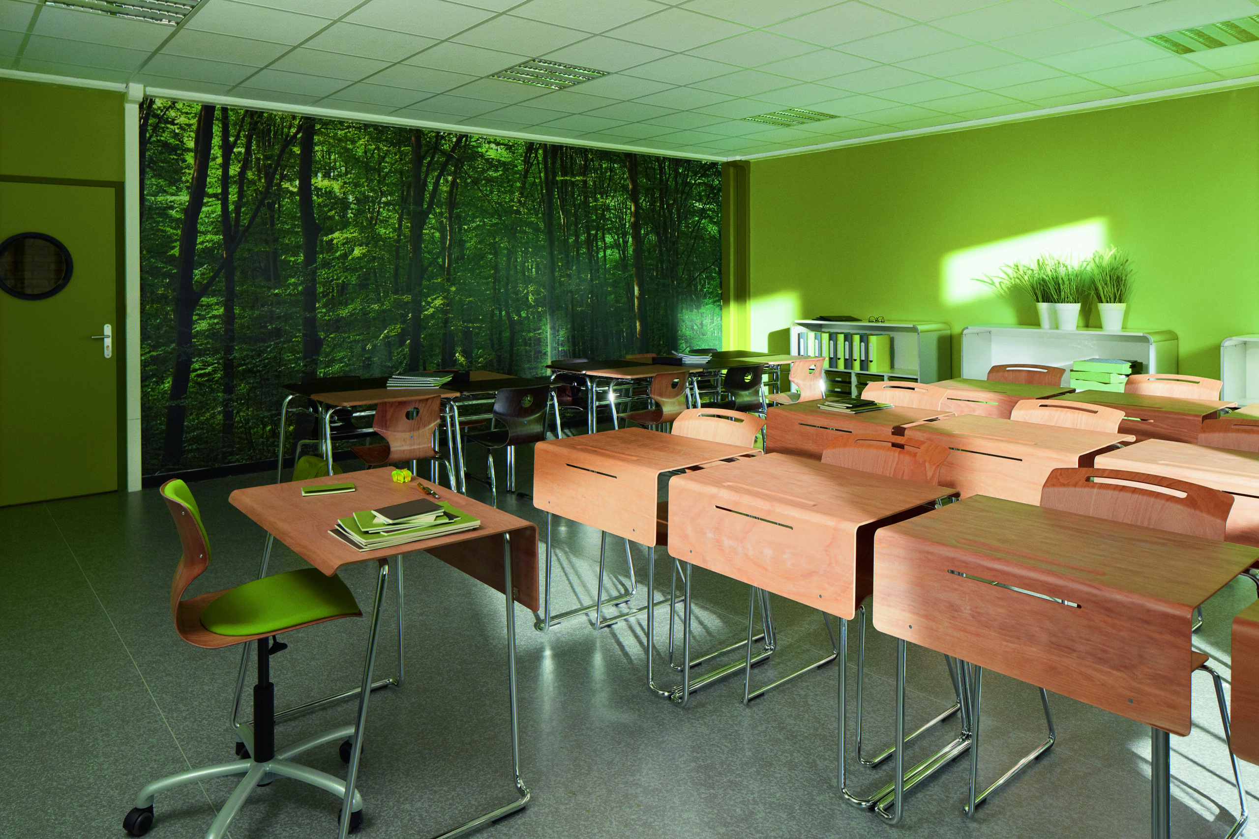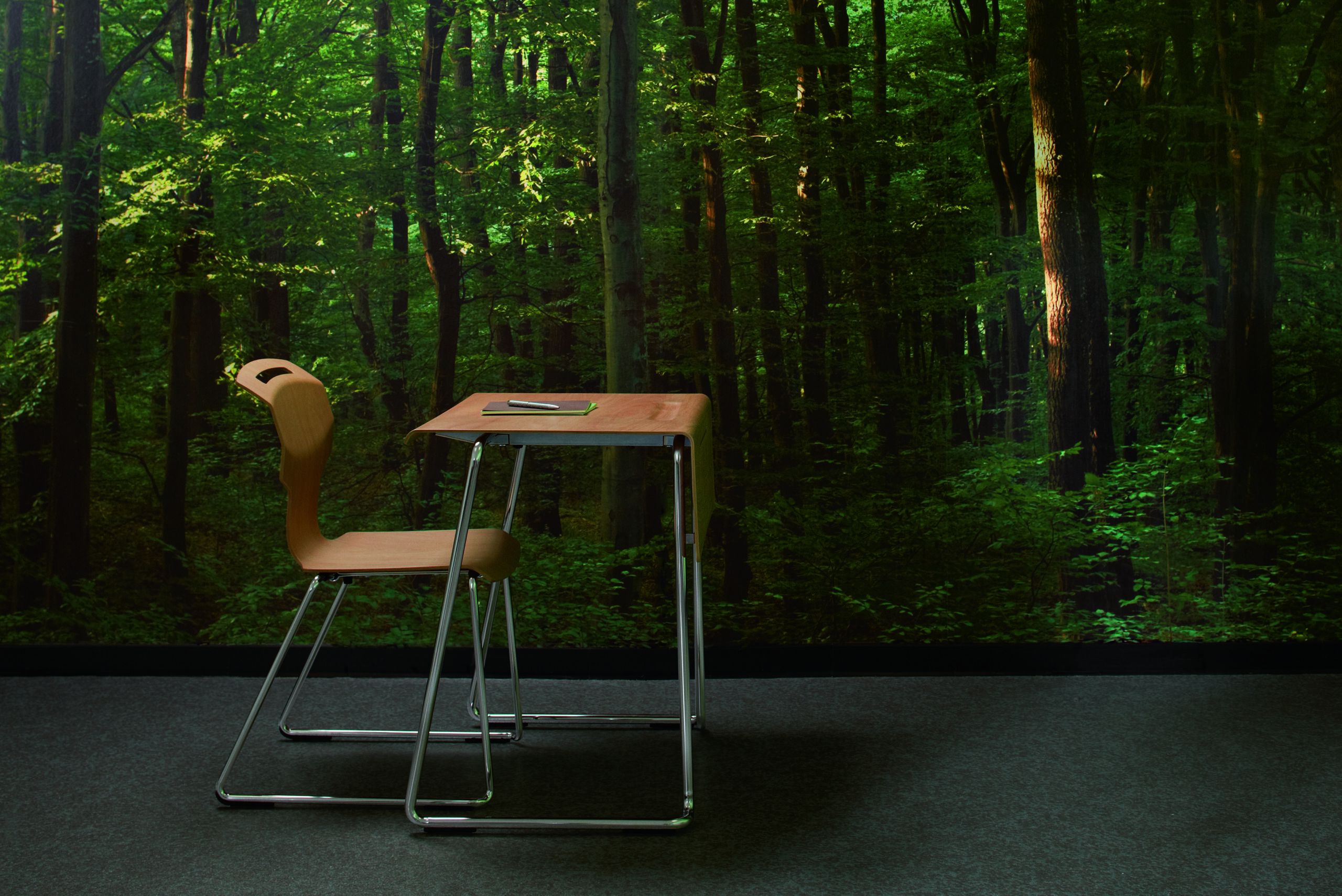 Bordplate laget av PAGHOLZ®, bestående av blokkert, lagdelt bøke-finer (skåret med roterende kniv) med en overflate belagt med melaminharpiks. Lukkede porer, med en ripe-, støt- og slitasjebestandig overflate, produsert i presseprosess. Bordplaten har integrert penneskuff og nedtrukket frontpanel.