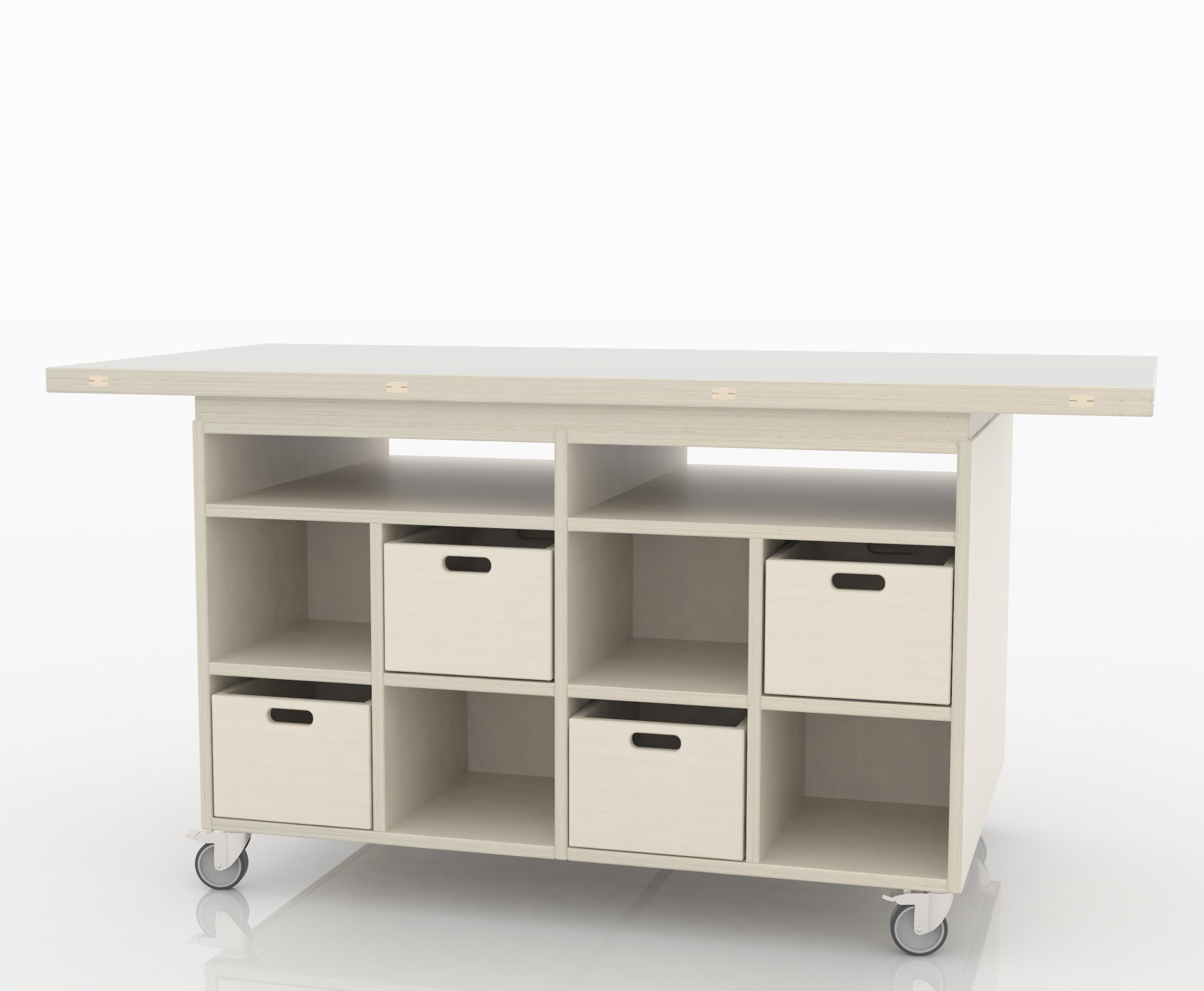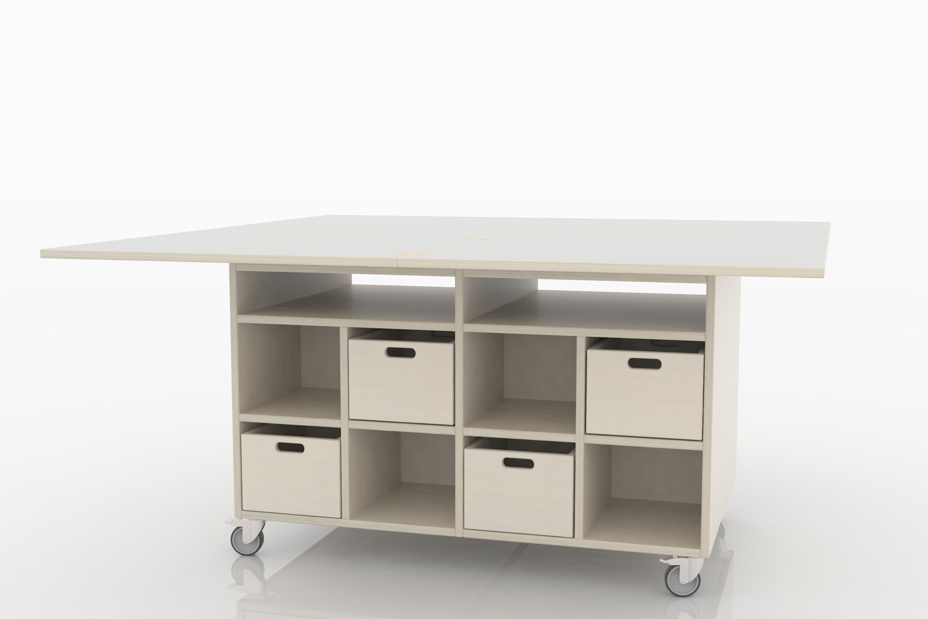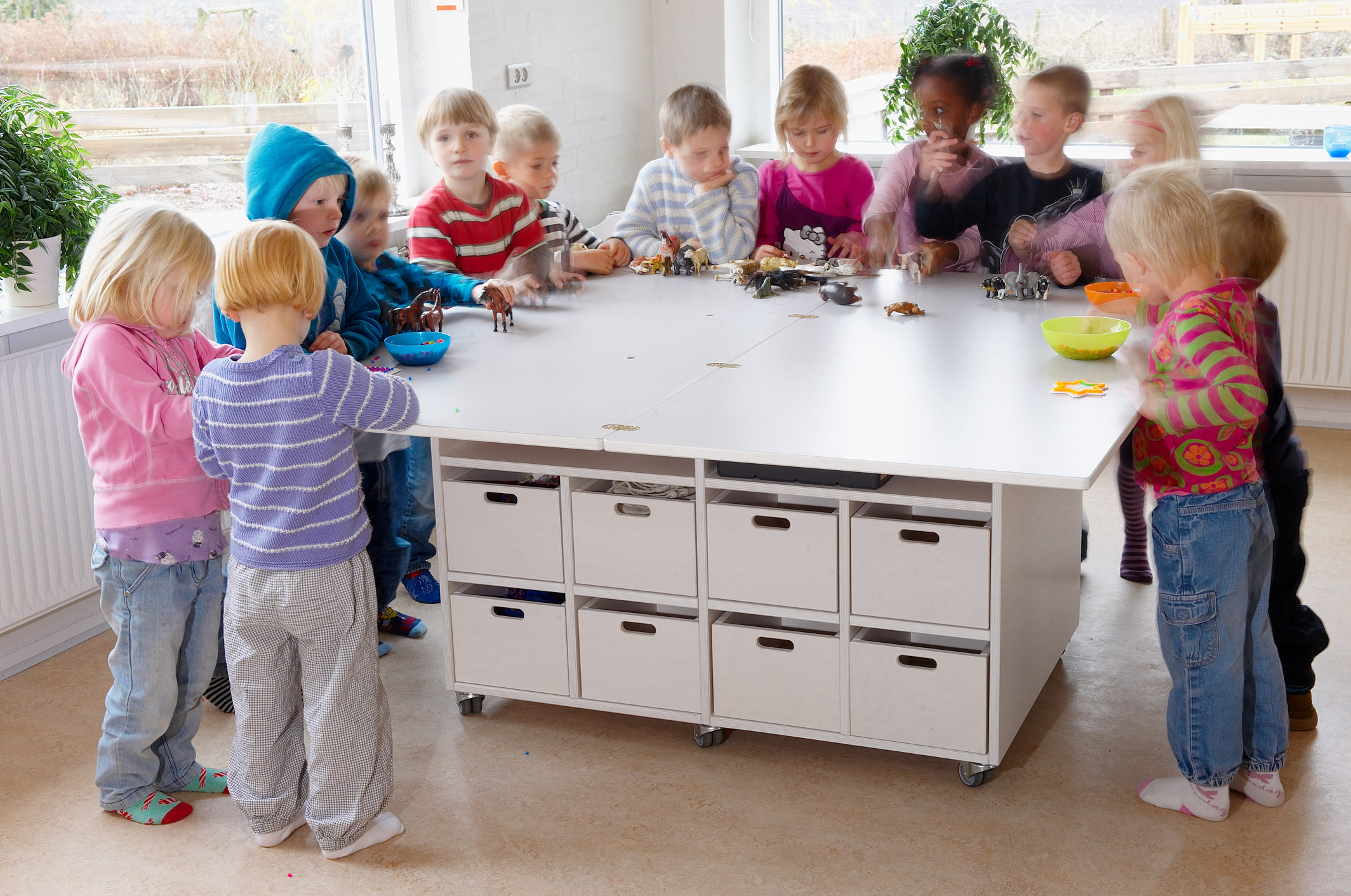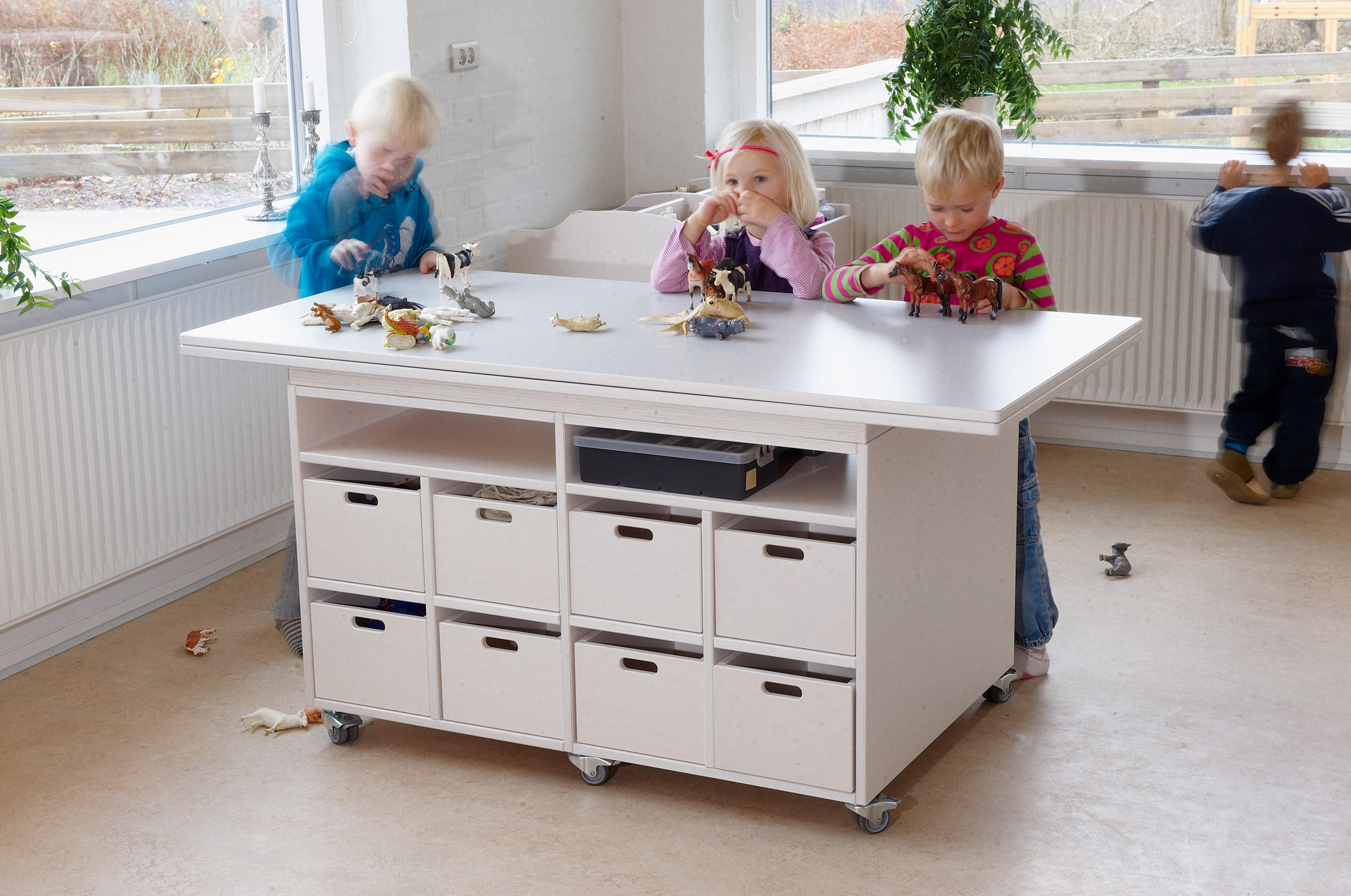 Mobilt arbeidsbord med mulighet for 16 oppbevaringskasser. Bordet kan slås ut til et stort arbeidsbord, så mange kan leke og arbeide rundt det samtidig.
