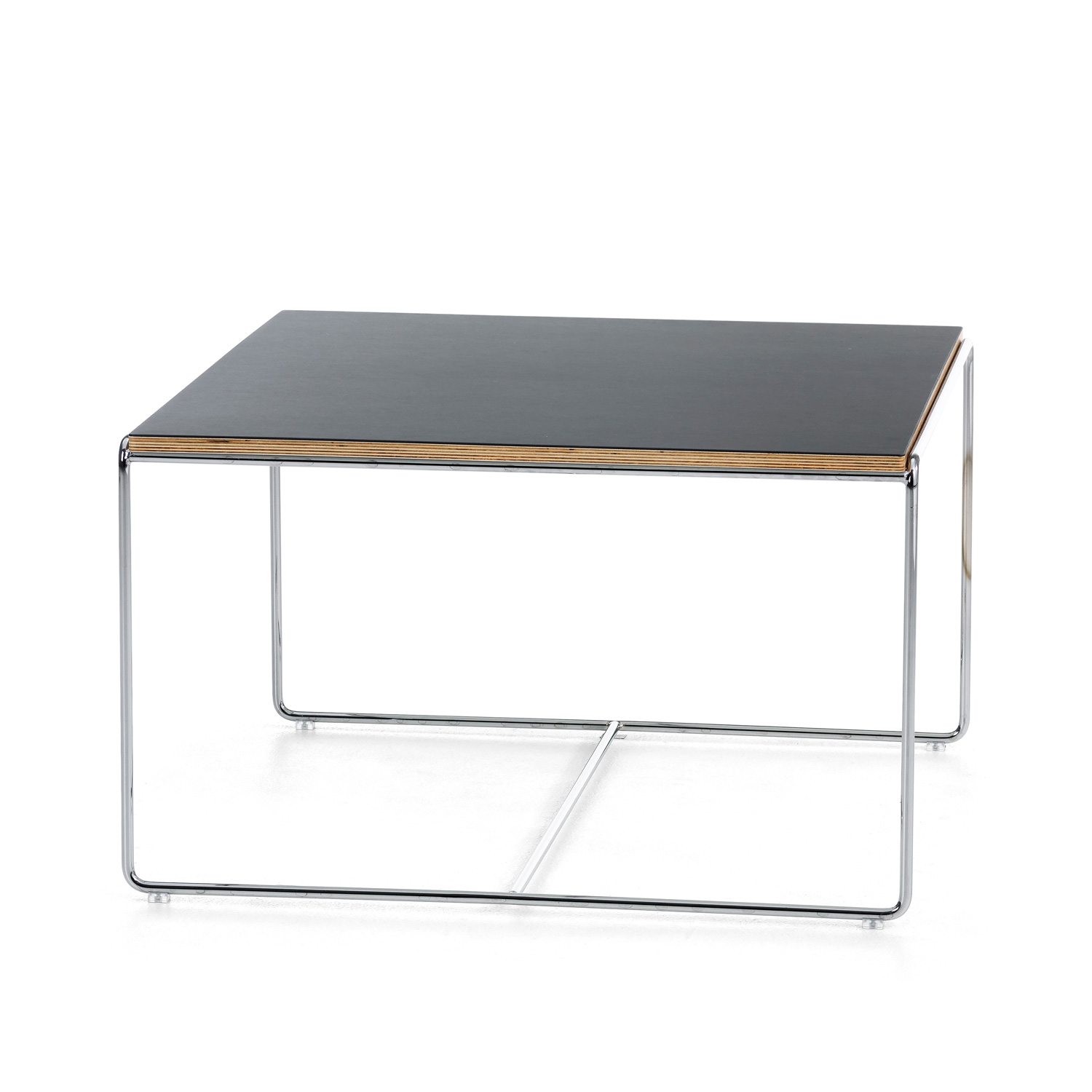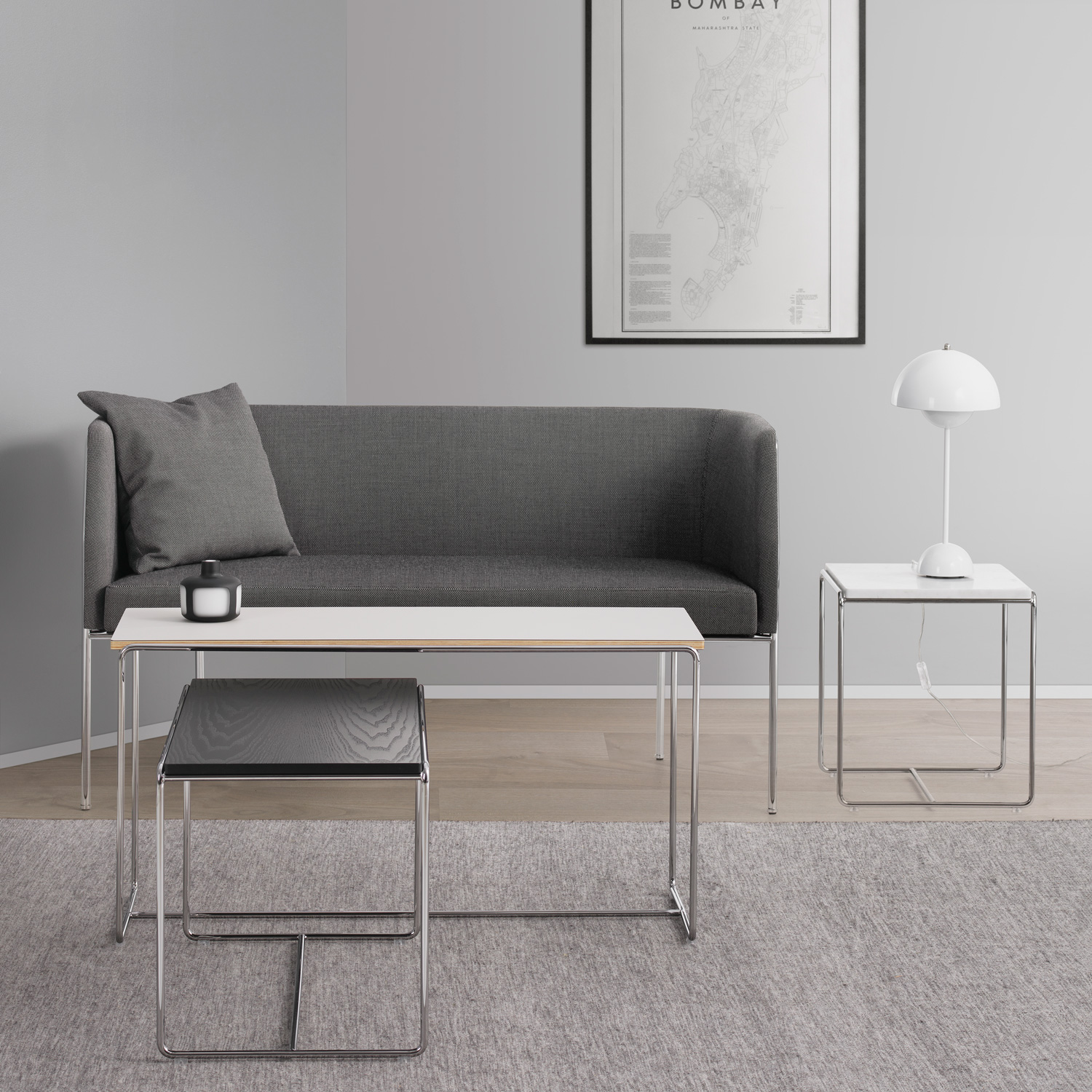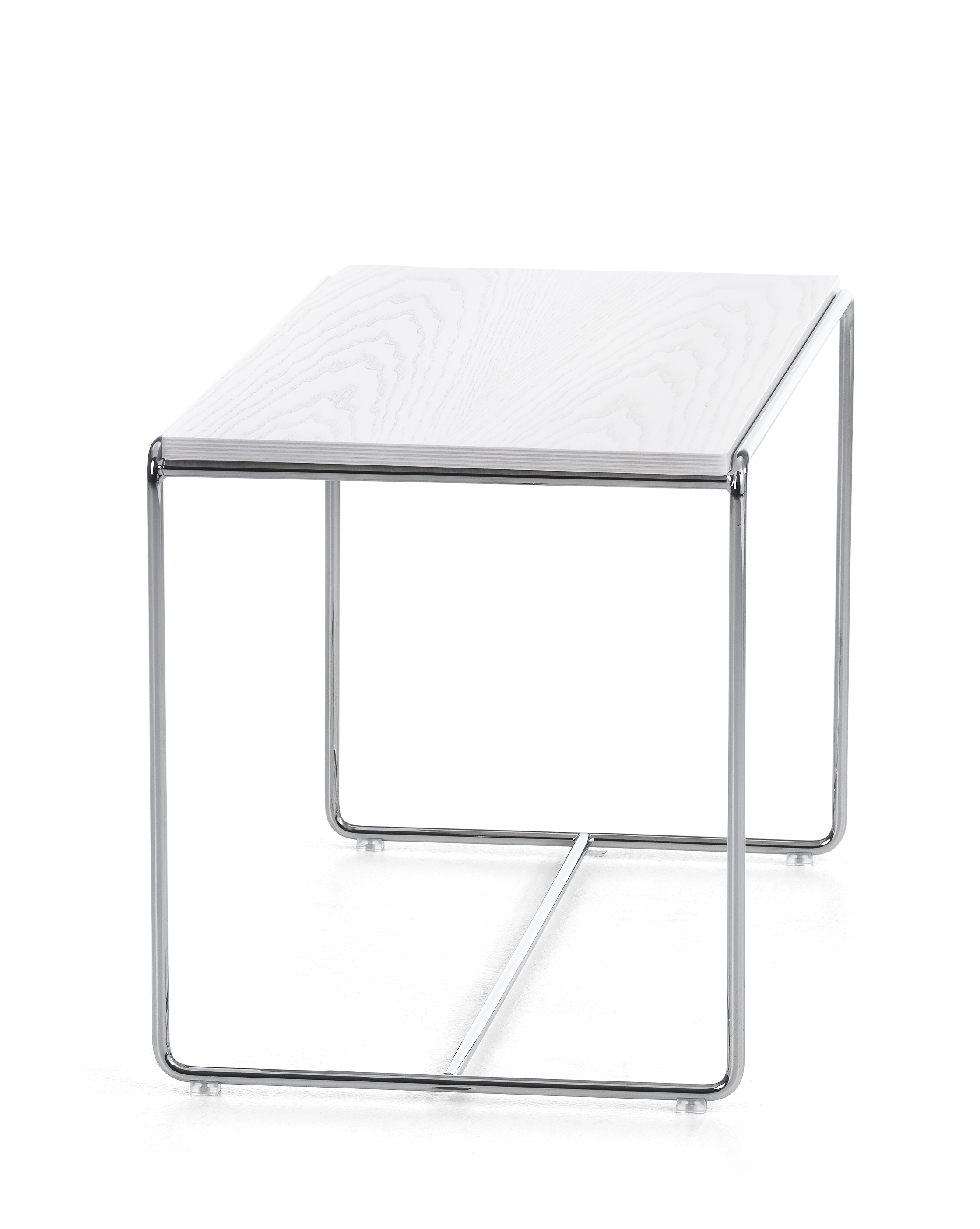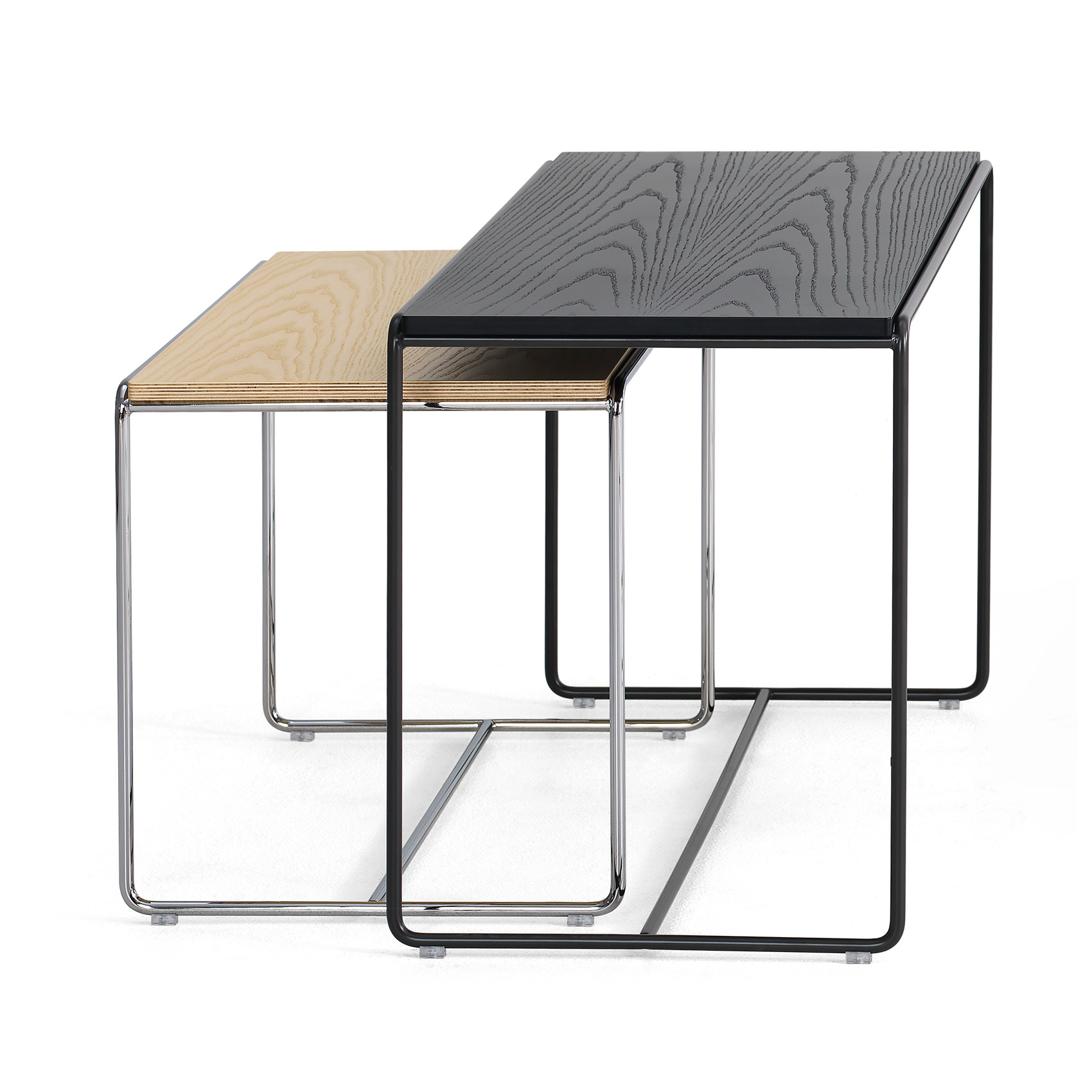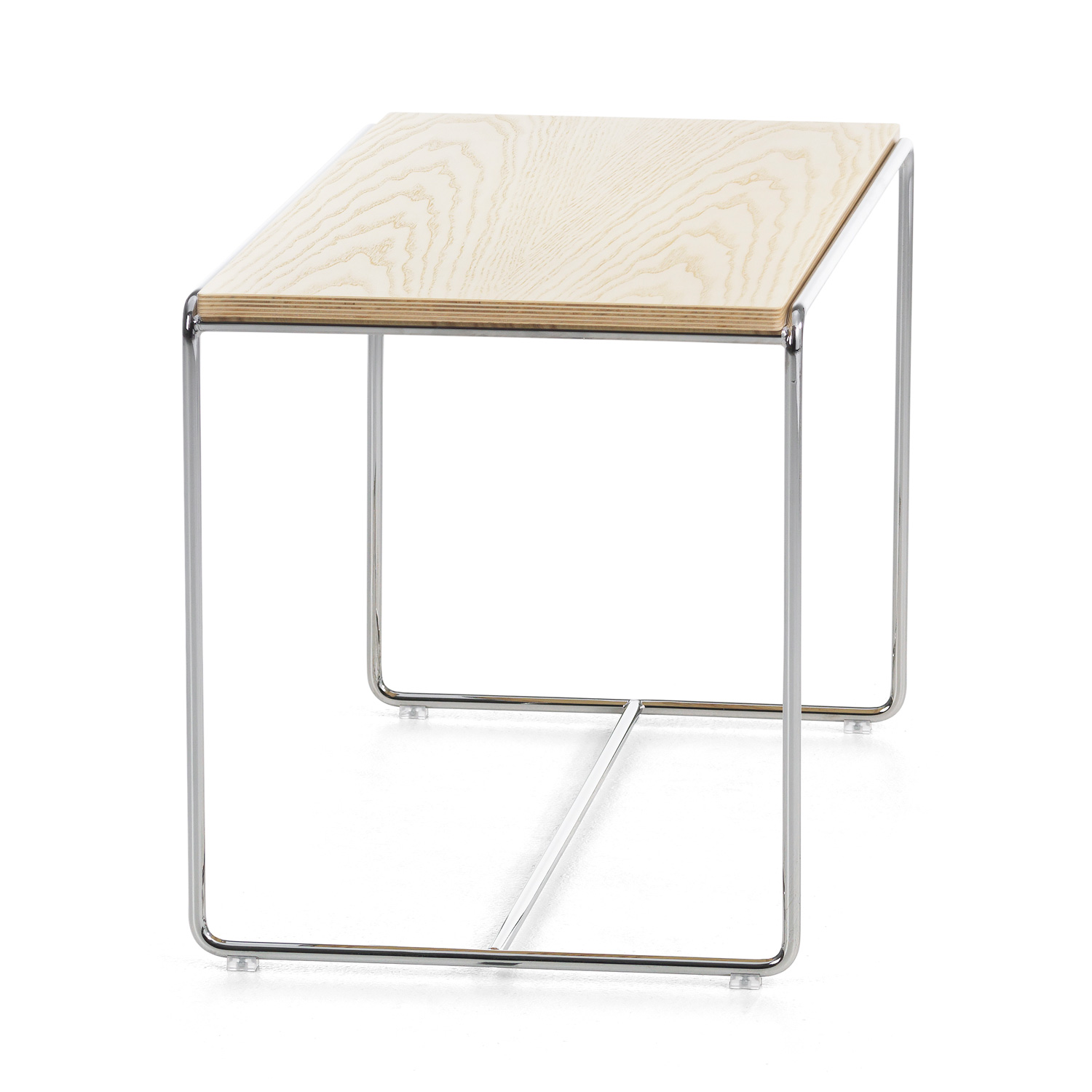 Ramme av Ø12mm pulverlakkert eller forkrommet solid stål. Bordplate av 16mm kryssfiner med natur- eller beiset ask finer alternativt linoleum. Lakkert kant.