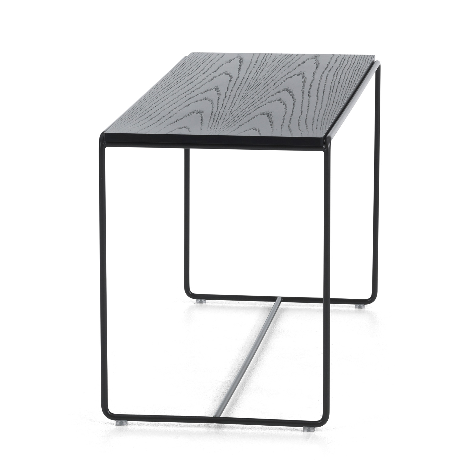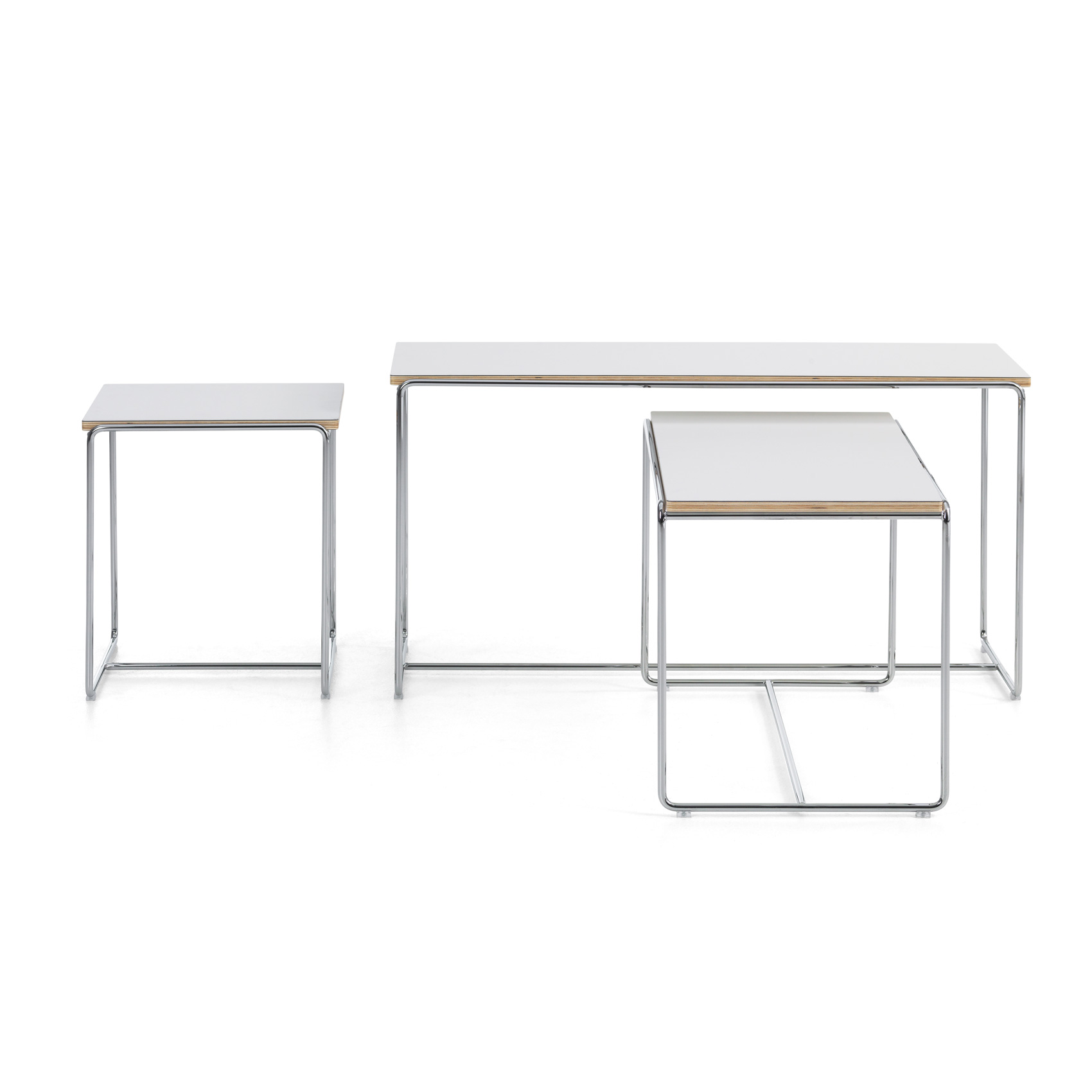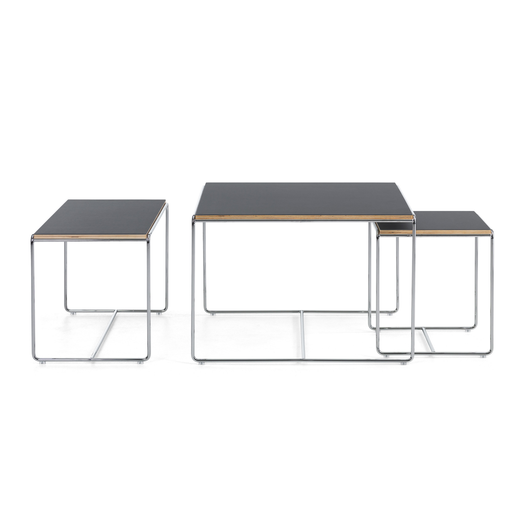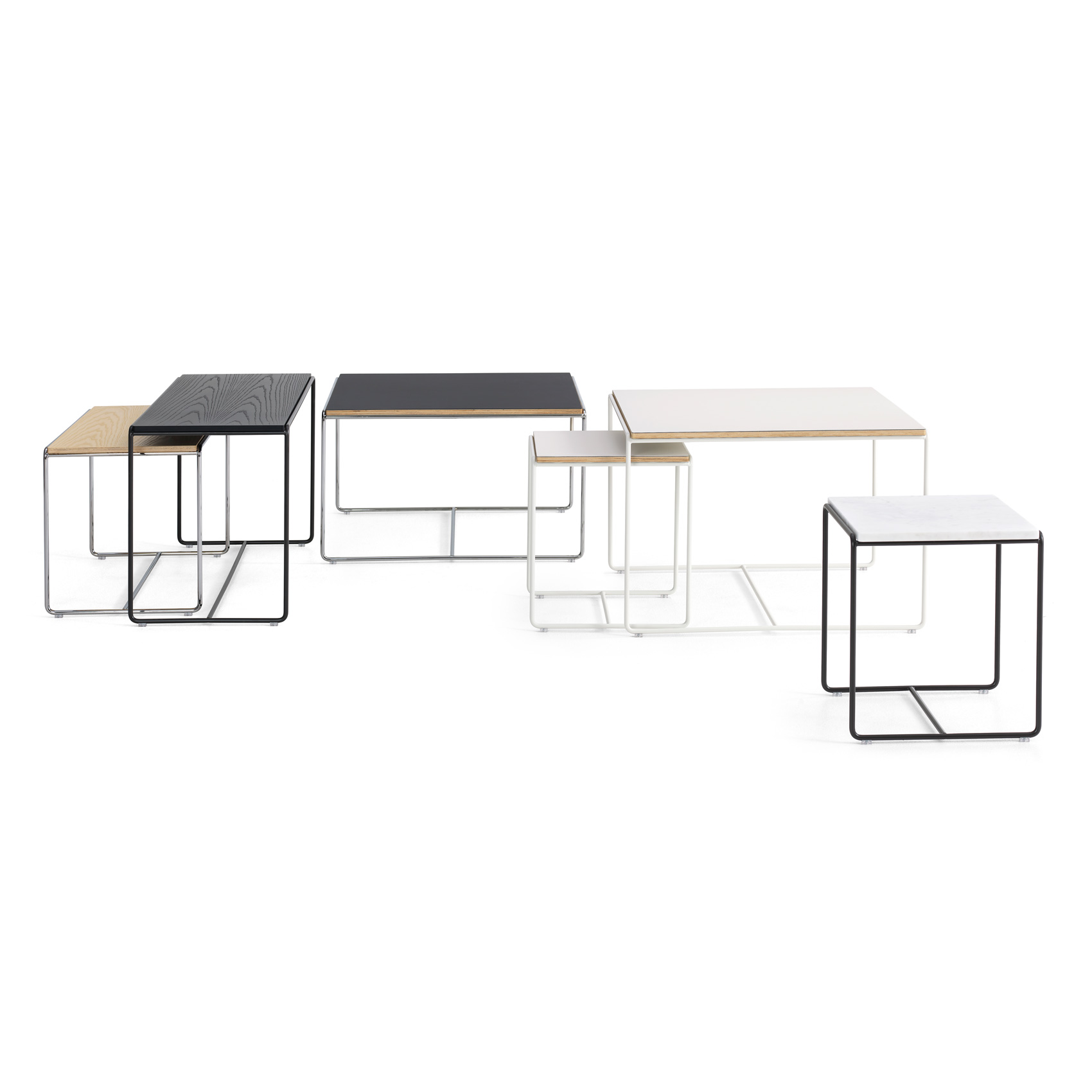 Den tynne, men sterke solide stålrammen gir Cajal bordet et luftig uttrykk og kommer i krom eller pulverlakk. Bordplatene i flere former og størrelser er tilgjengelige i natur- eller beiset ask finer eller linoleum.