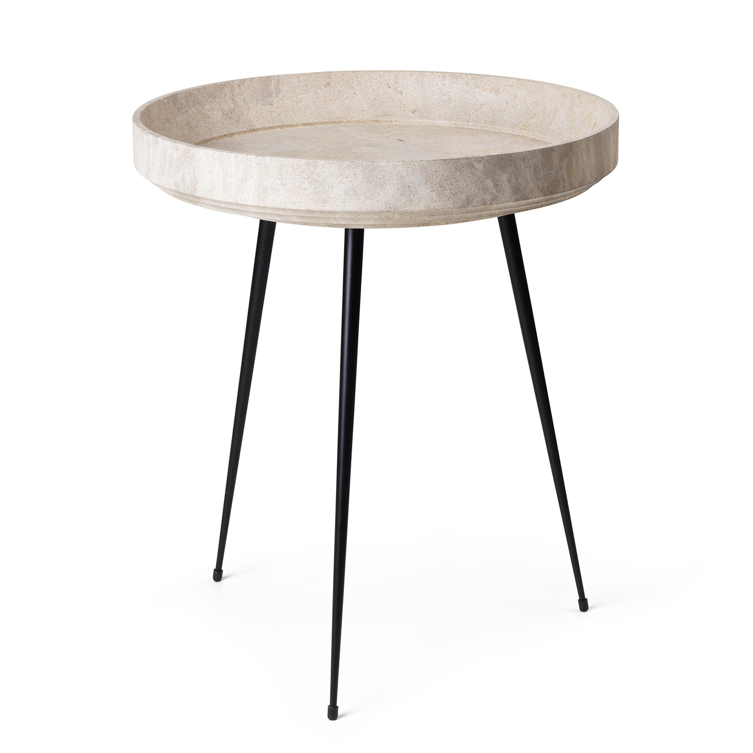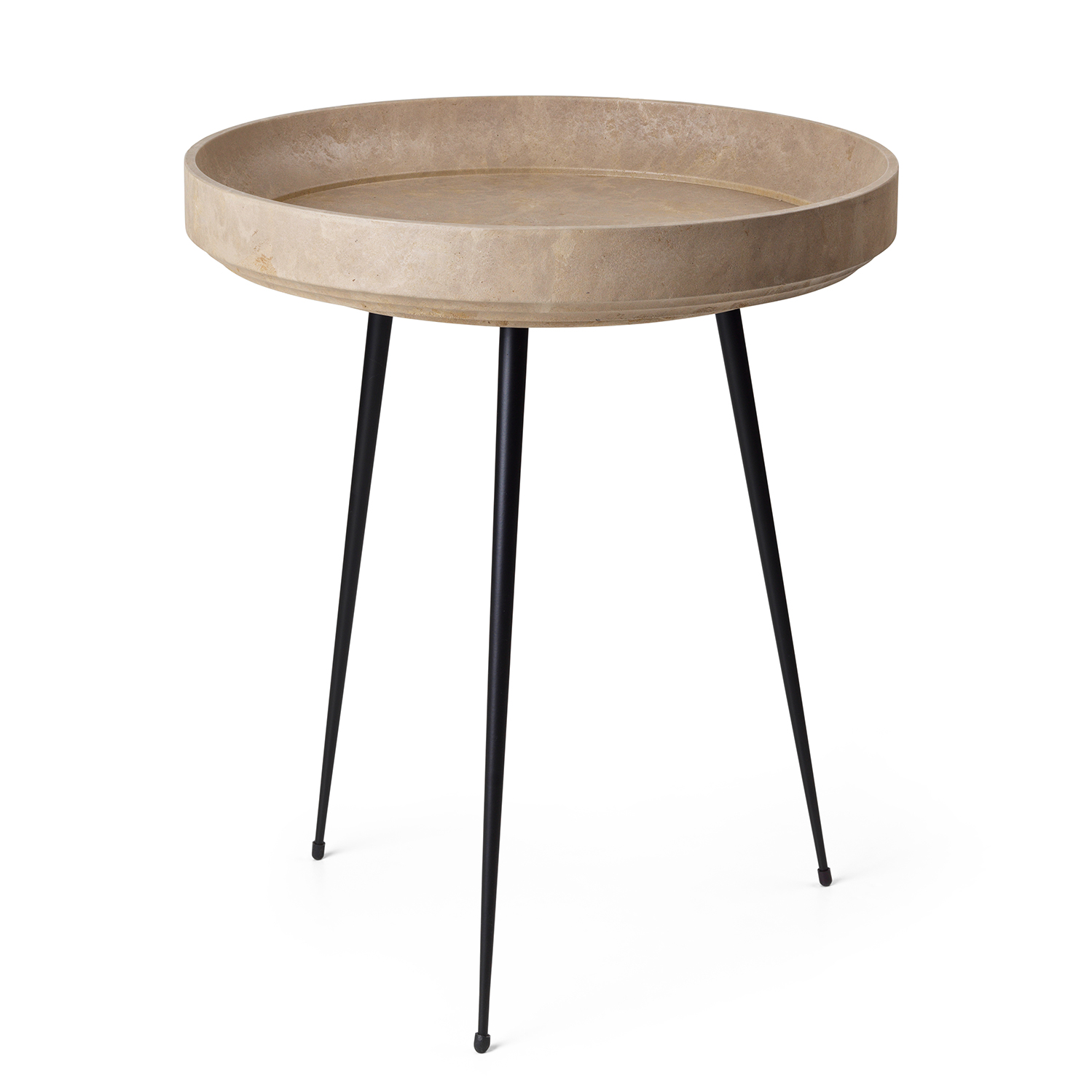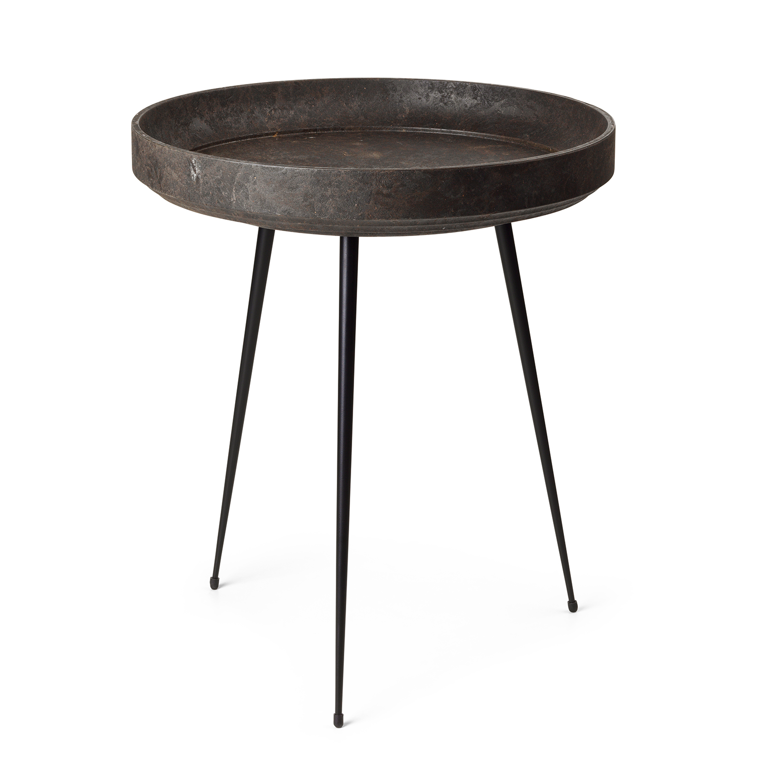 Loungebordet fra Mater har et tidløst, elegant design med tre smale, sorte ben i stål og en rund bordplate i restmateriale med høye kanter.
