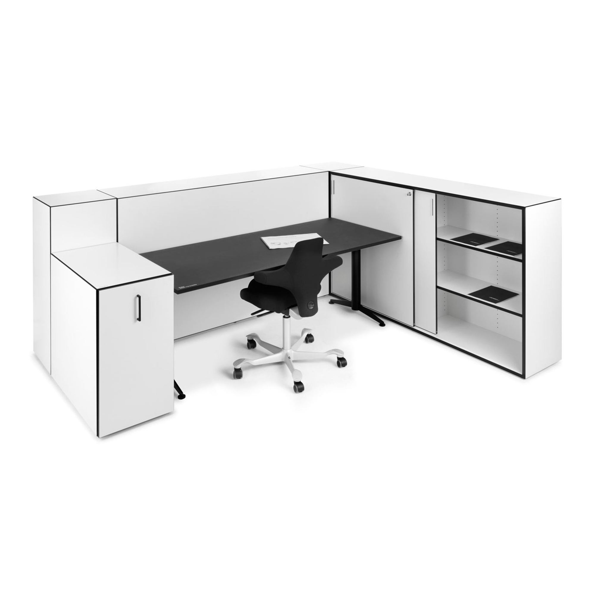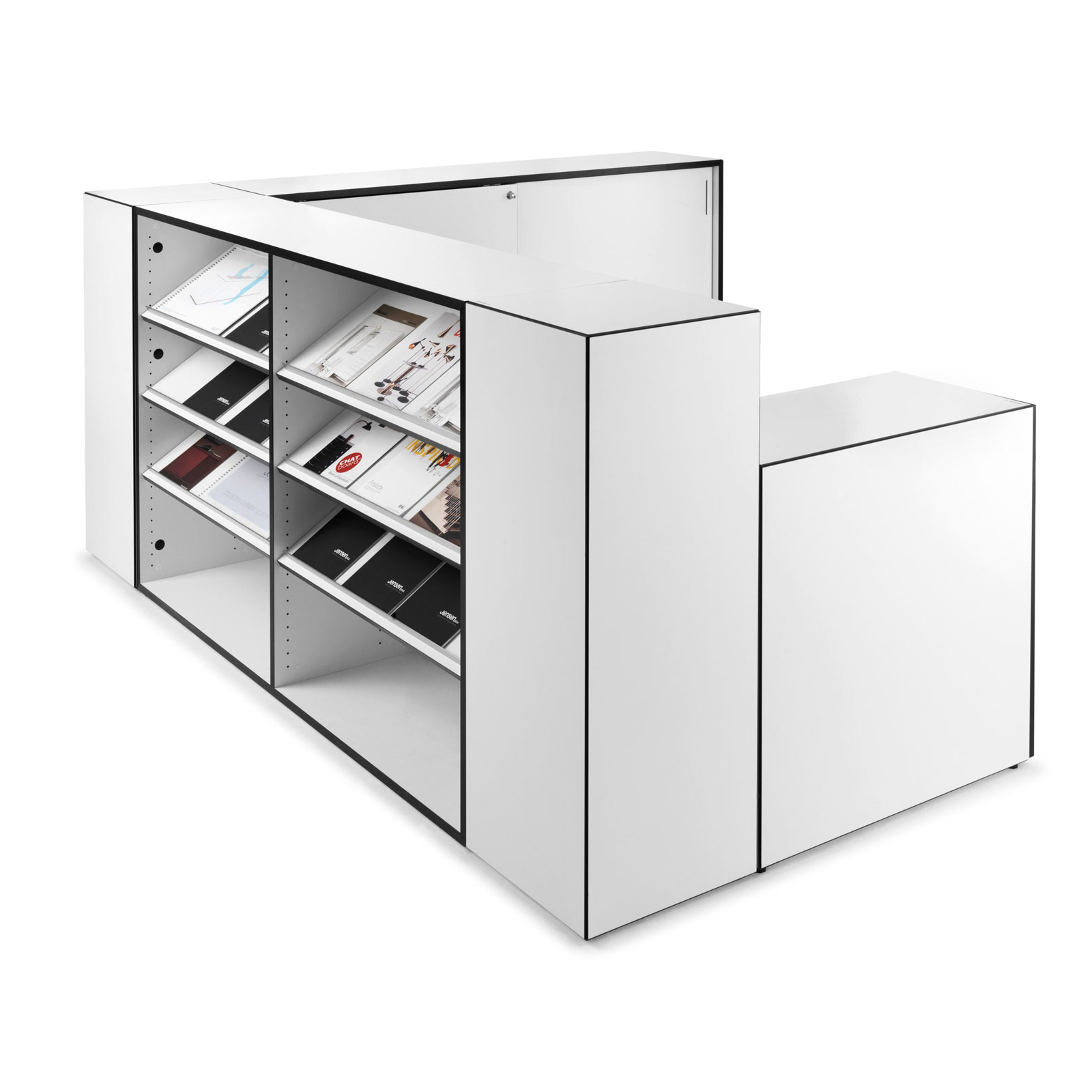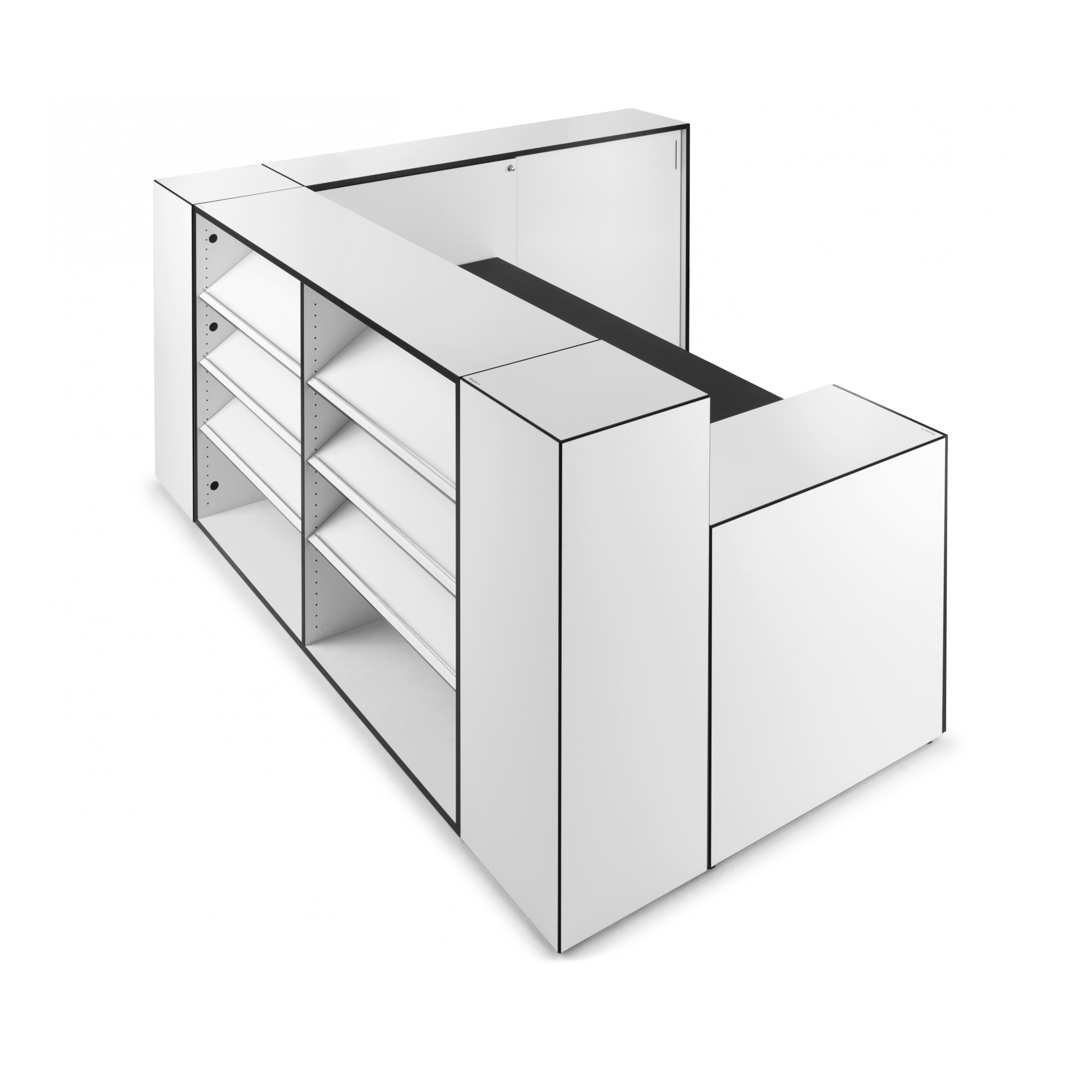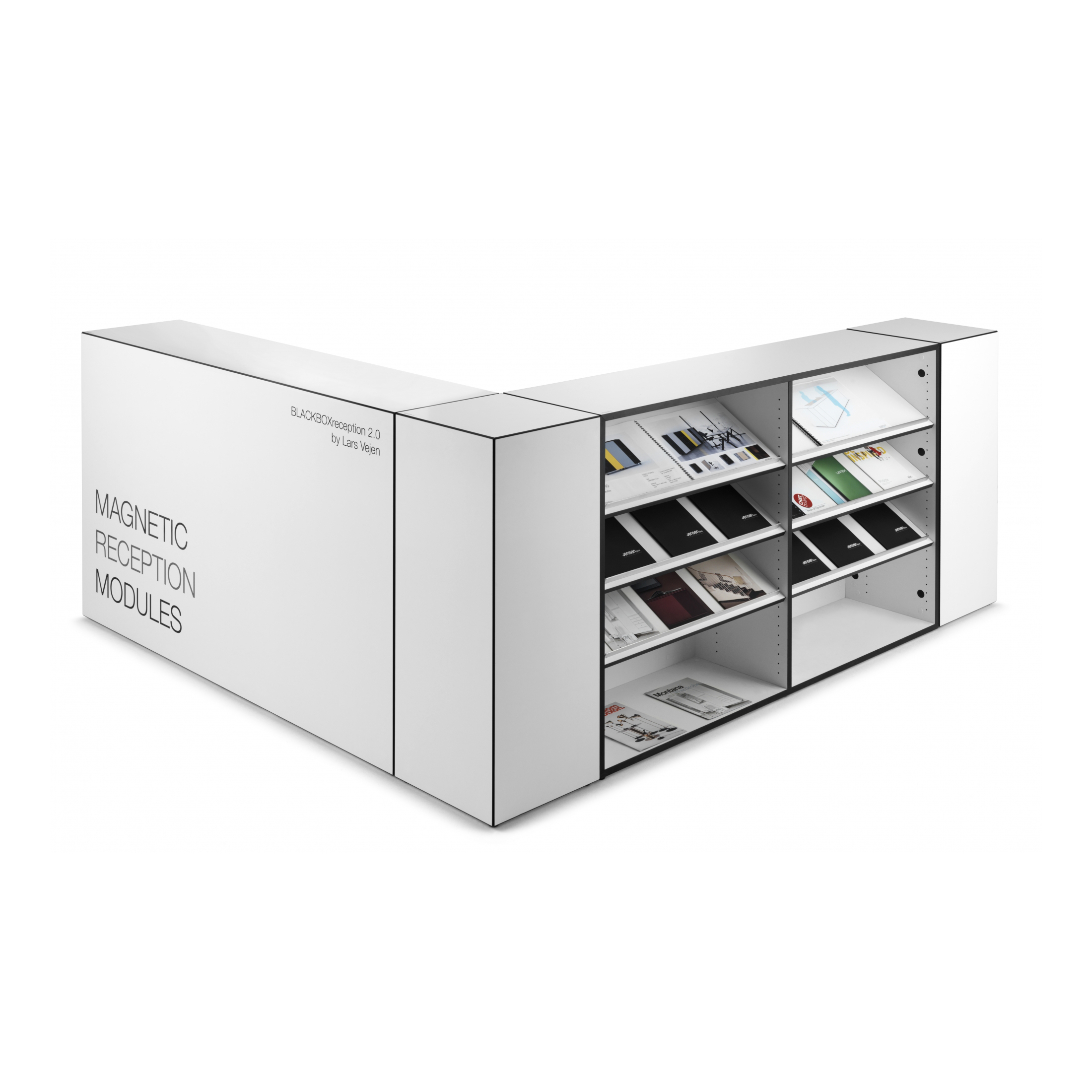 Blackbox er et modulært skrankekonsept montert med usynlige magneter. Med bare 7 moduler kan man skape utallilge former og kombinasjoner av skranker – og oppstilling endres på få minutter, helt uten bruk av verktøy. Alle 7 enheter er samlet med 45graders kanter i sort, og standard er flatene i hvit direktelaminat. Alle moduler har stillesko som kan justeres, og deretter klikkes skranken sammen. Fra å være ufleksible og stationære deler av et fast inventar, er skranken eller resepsjonen nå blitt et dynamisk møbel, som inngår ssom en naturlig del av innredningen. BLACKBOX resepsjonen kan endres, flyttes, utvides, deles – altså utallige formasjoner, hvor kun fantasien setter grenser.