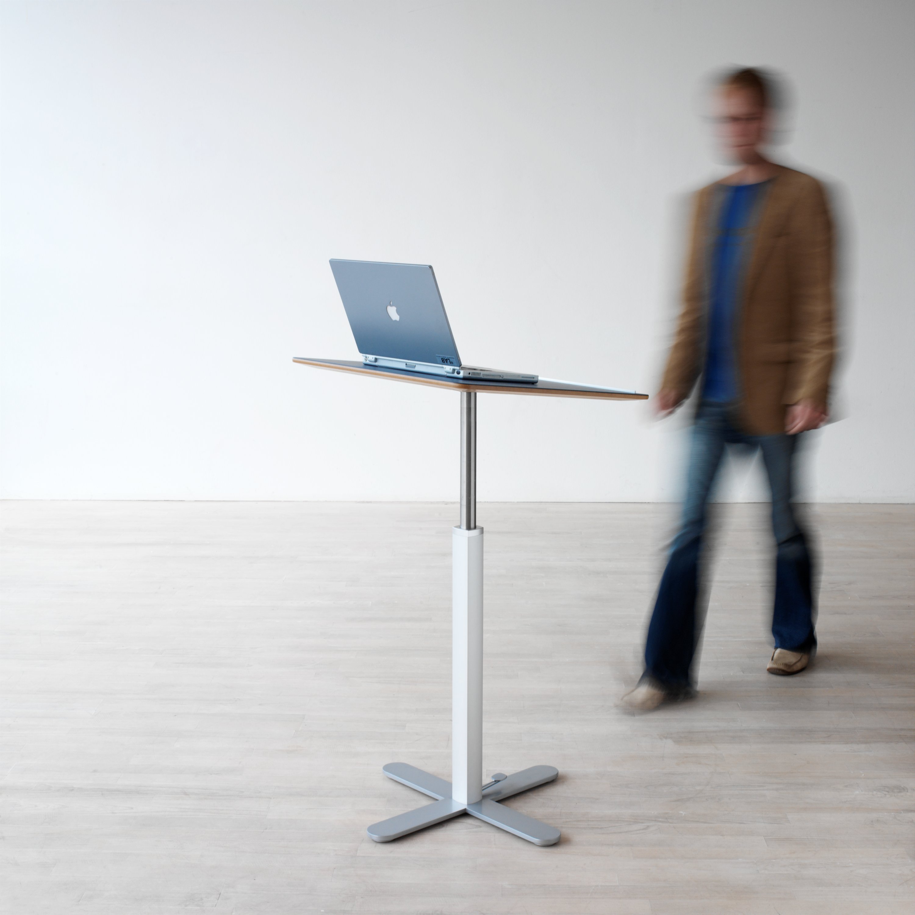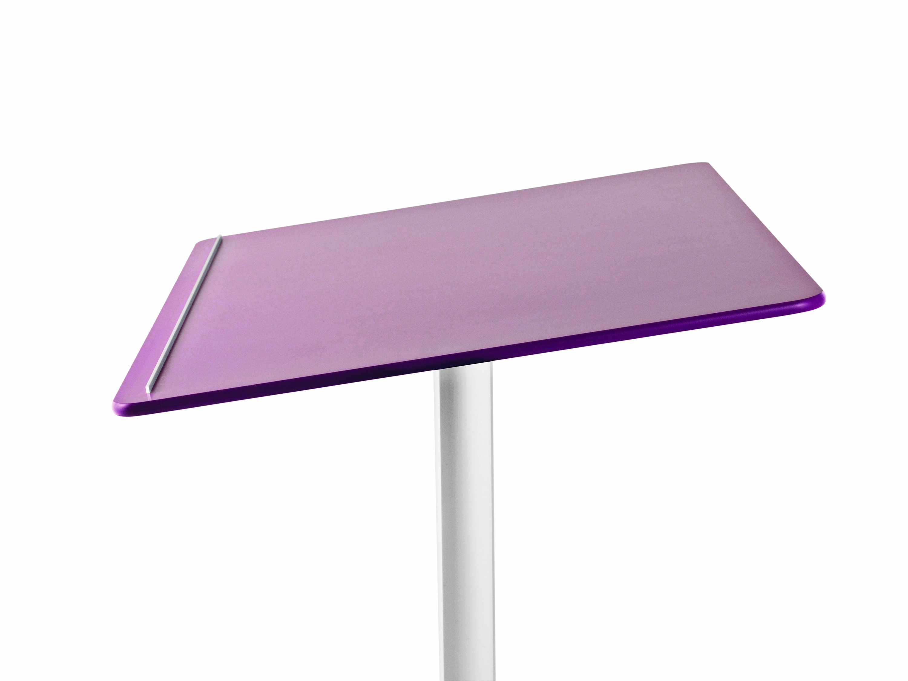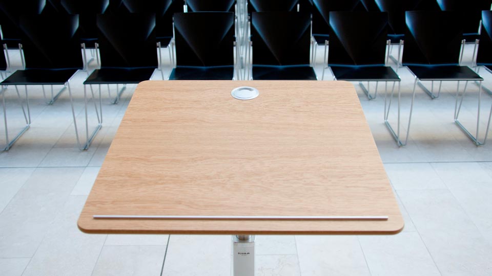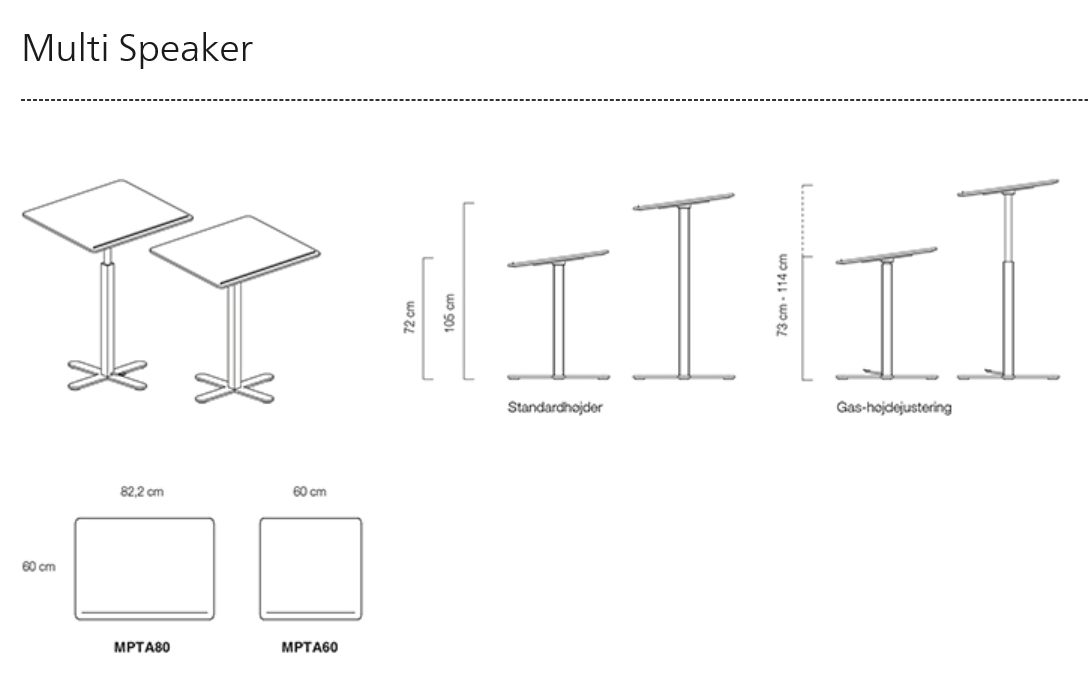 Multi Speaker er velegnet for konferanserom og større møte- og undervisningslokaler. Talerstolen gir mulighet for å plassere papirer eller bærbar PC i god, stående arbeidshøyde. Multi Speaker fås i 2 faste høyder, samt med gasslift. Benprofil i eloksert aluminium og føtter i pulverlakkert stål. Fås i 6 forskjellige farger. Fås også i matt krom mot tillegg. Bordplate leveres i laminat, silk laminat, kompaktlaminat med sort kjerne, linoleum, finér, nano laminat og 0,8 mm aluminium. Bordplatene fås som standard med lakkerte kanter, som matcher overflaten. Bord i finér har kant beiset i en matchende lakk.