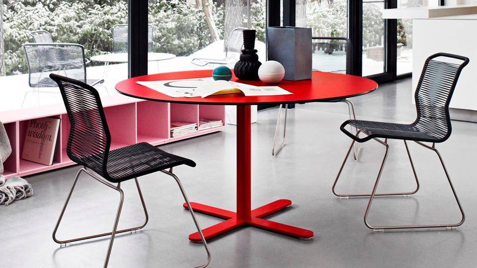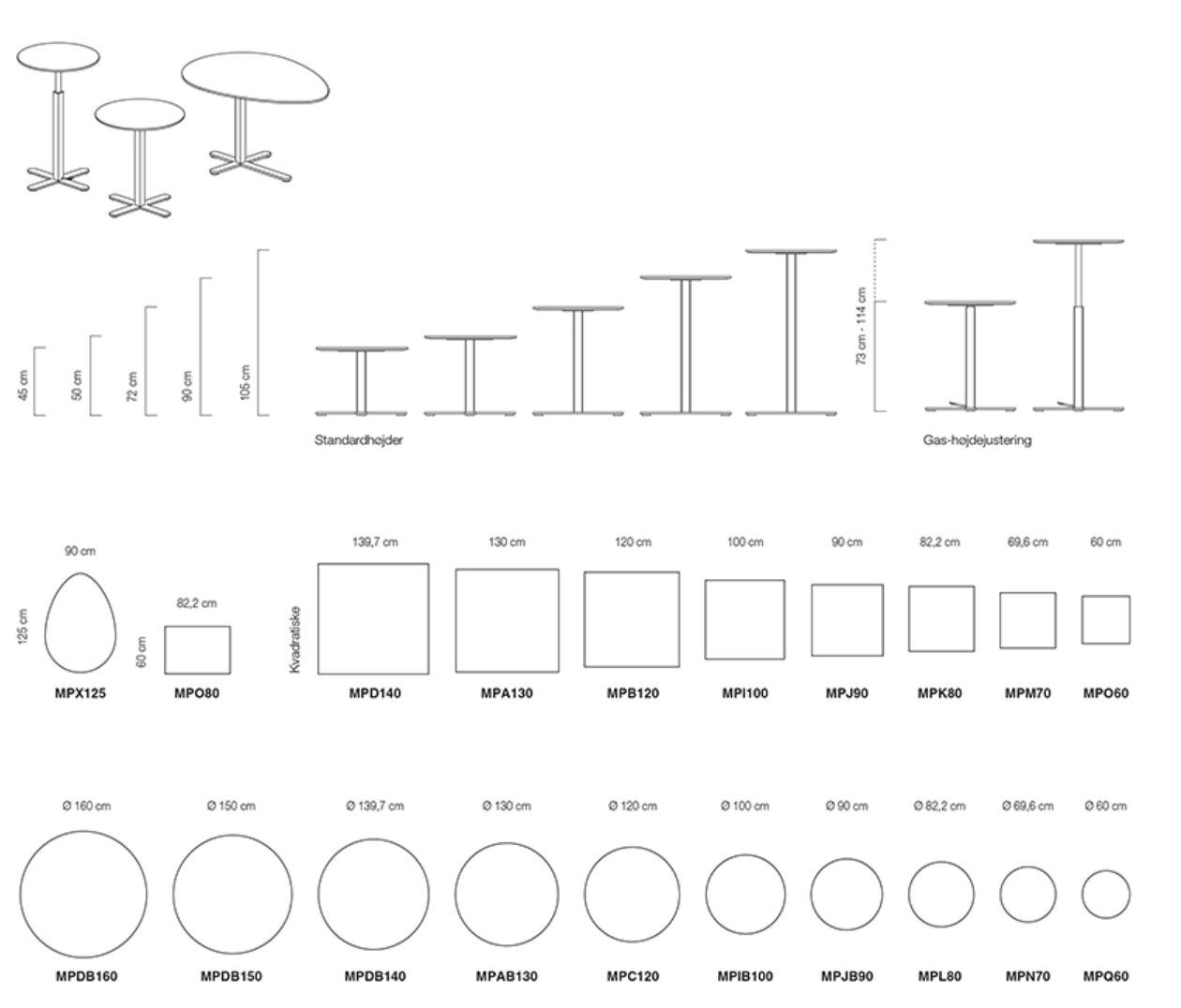 Det fleksible Multi Café bordet kan anvendes på kontoret, kantinen, møterommet, i sosialsoner og til og med utendørs. Bordet fås i 5 standard høyder, samt med gasslift. Bordplatene fås i tre former, mange størrelser og et stort utvalg overflater og farger. Føtter i pulverlakkert stål, og benprofil i eloxert aluminium som fås i 6 forskjellige farger. Føtter fås også i matt krom mot tillegg. Bordplate fås i laminat, silk laminat, kompaktlaminat med sort kjerne, nano laminat, linoleum og finér. Bordplatene fås som standard med lakkerte kanter, som matcher overflaten. Bord med finéroverflater har kanten beidset i matchende farger. Tåler en belastning på opptil 20 kg.
