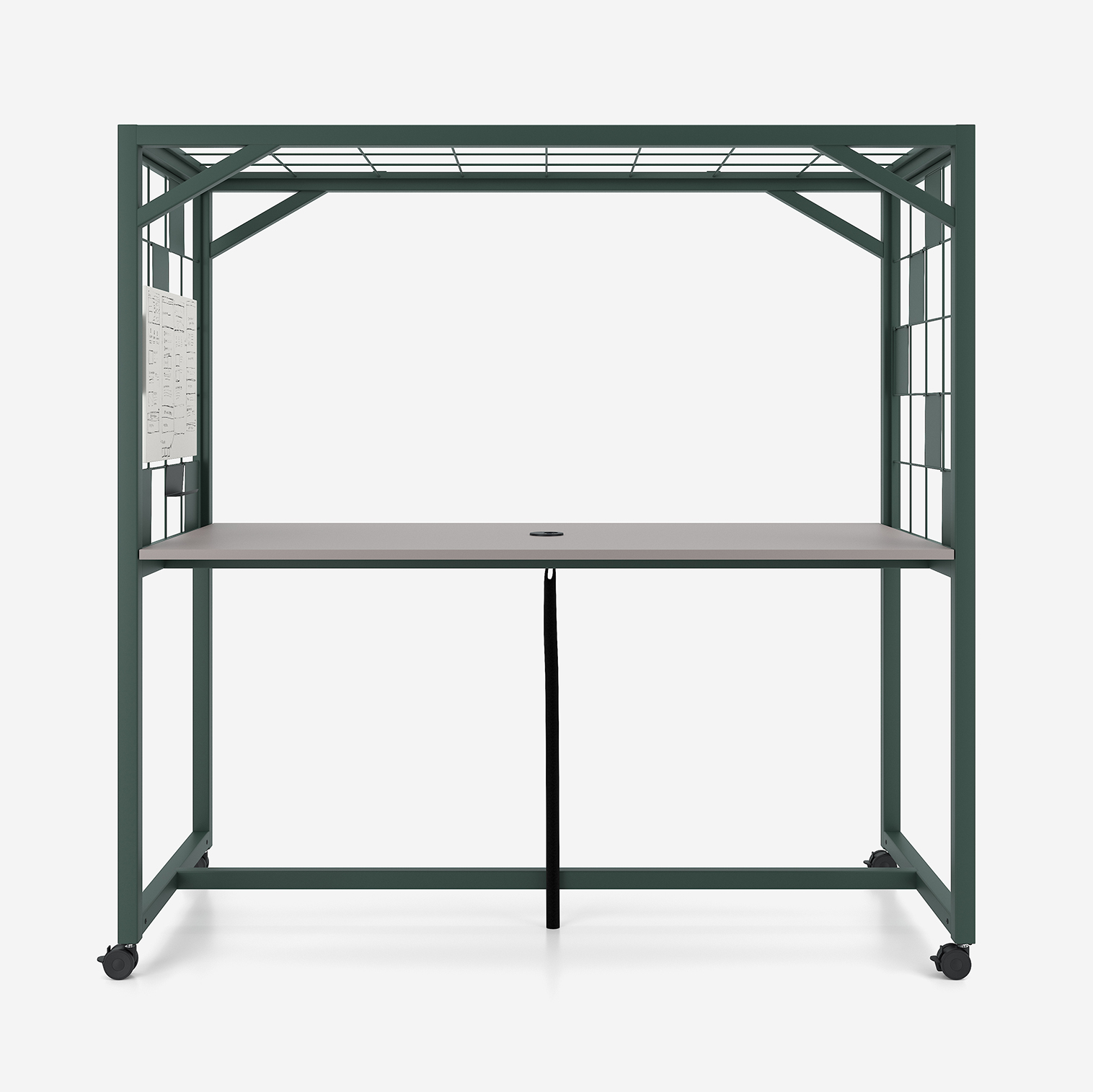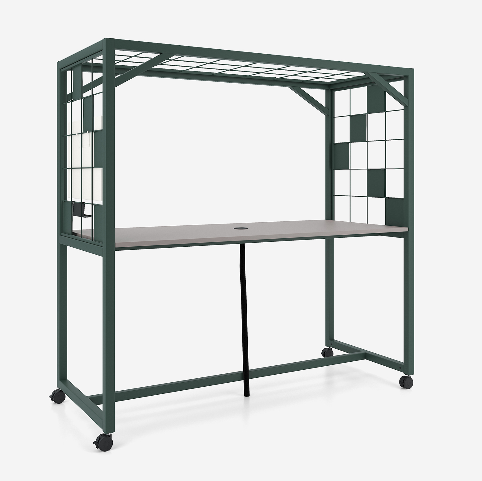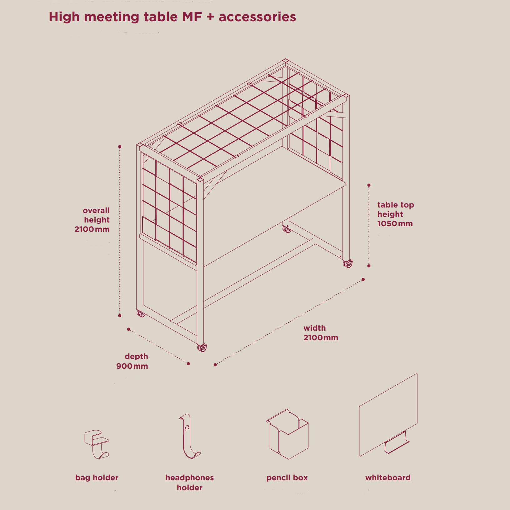Offa høyt møtebord med stålramme fås med eller uten ulike kabelløsninger og tilbehør som whiteboard, veskekrok, hodetelefonholder og penneboks til kan henges på metallgrid.