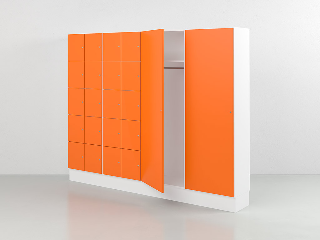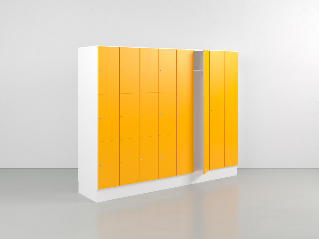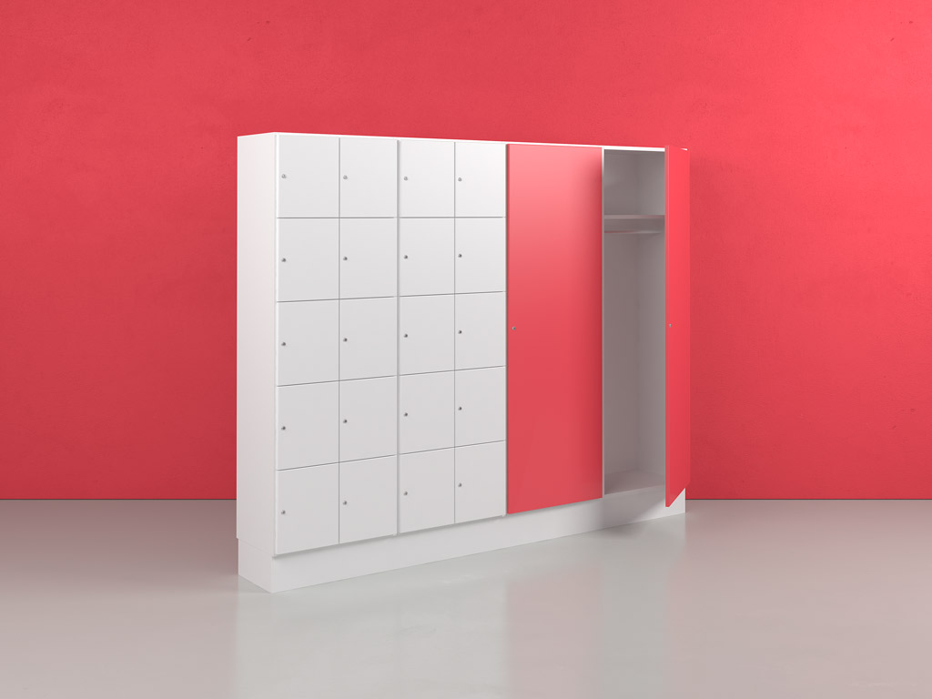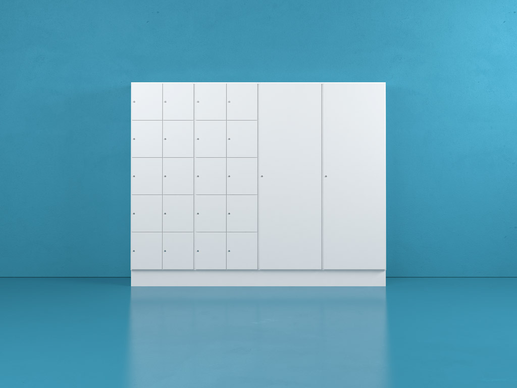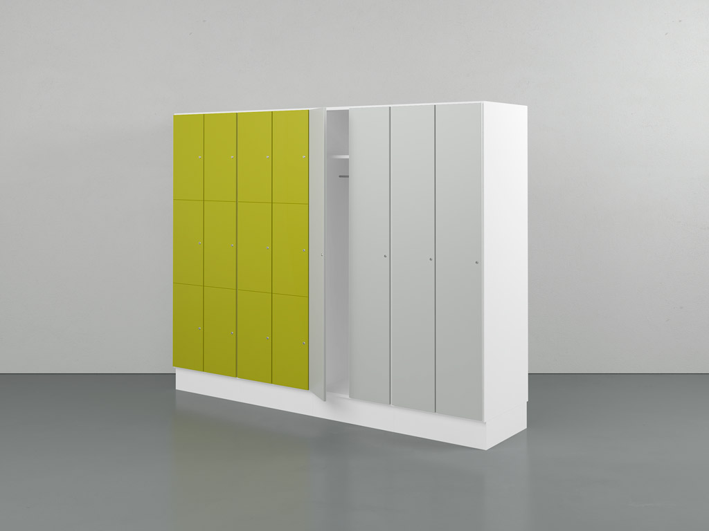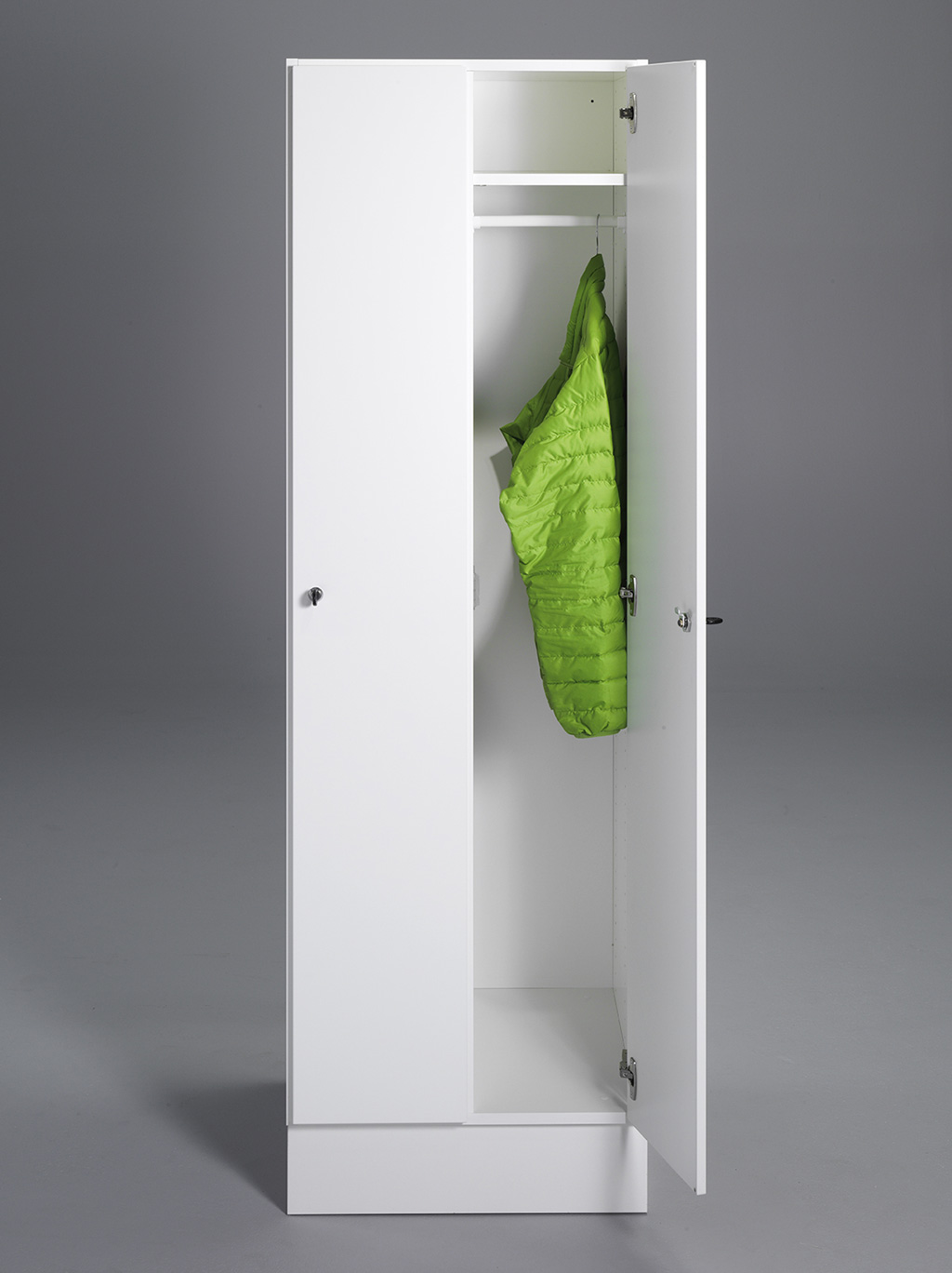 CombiLine – Klesskap. Plassbesparende låsbart klesskap designet for å gli inn i arbeidsmiljøet. Garderobestang og hattehylle er inkludert som standard. Hovednøkkel for alle låsene kan bestilles separat. Vi kan også tilby andre låssystemer som hengelås, kodelås og RFID-låser. Standard høyde er 193,6 cm.