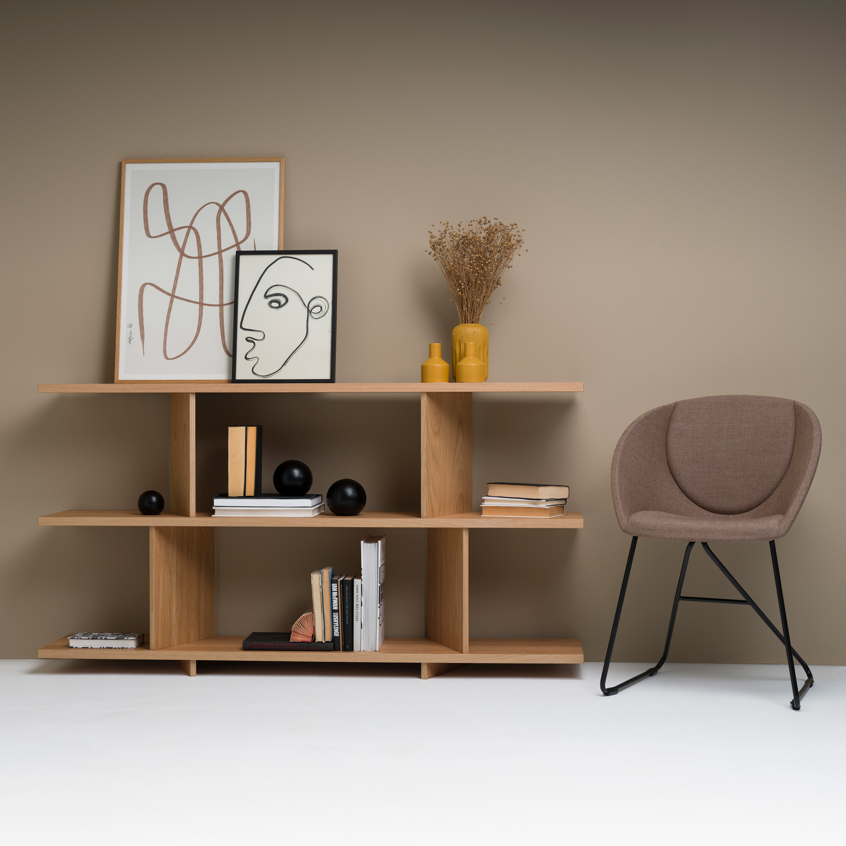 - Hyller i 26 mm MDF med eik finer og 17 mm profilert hylledeler