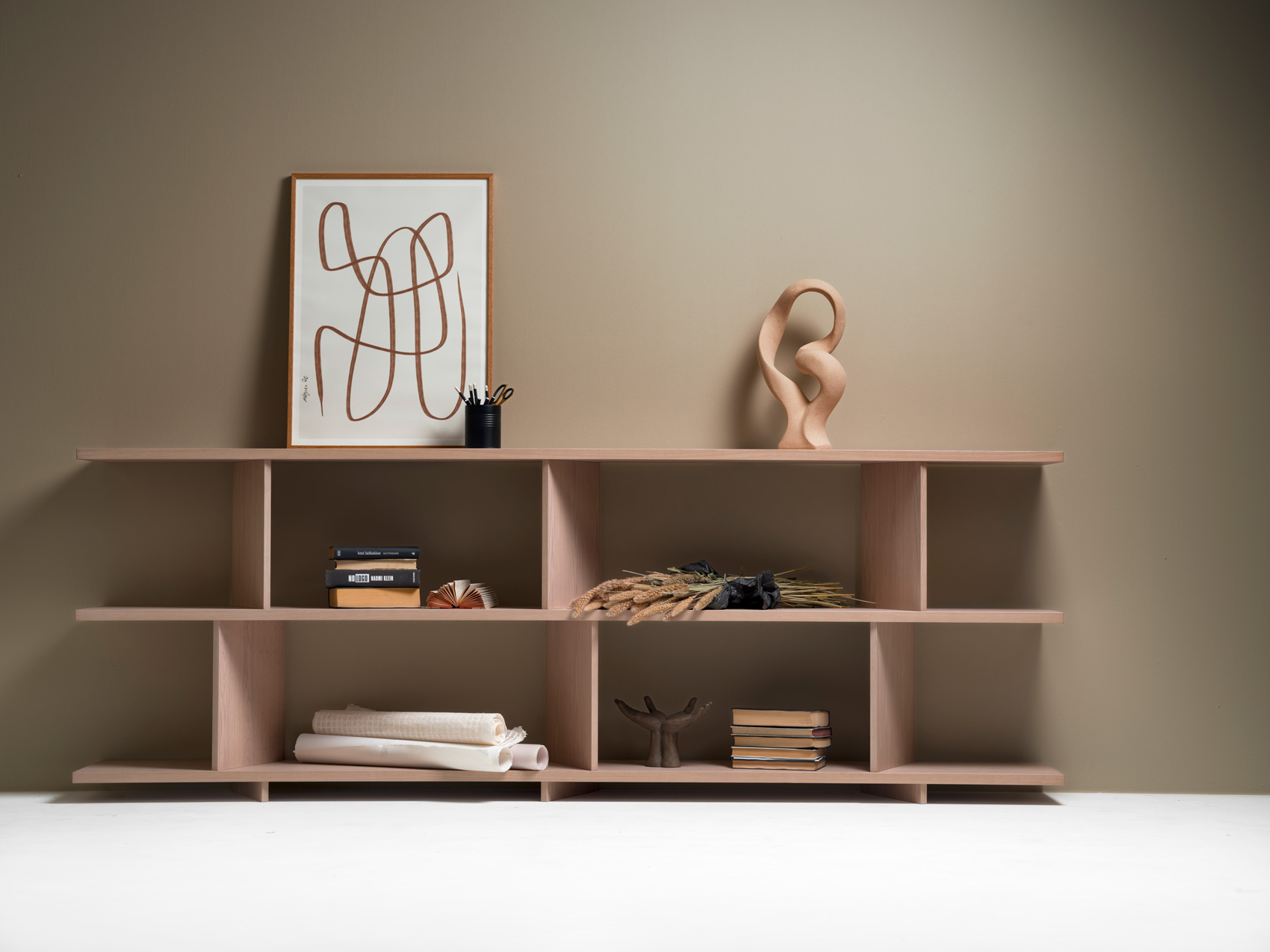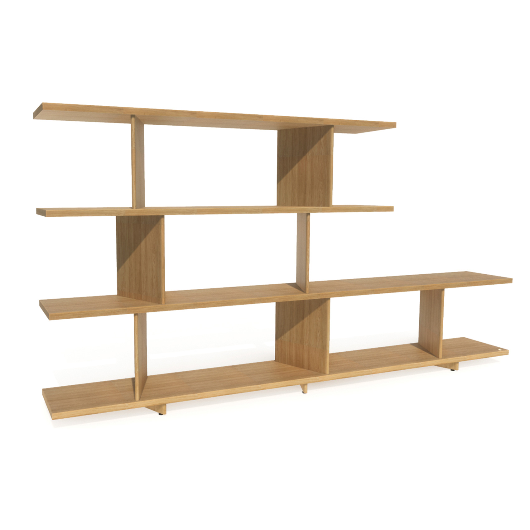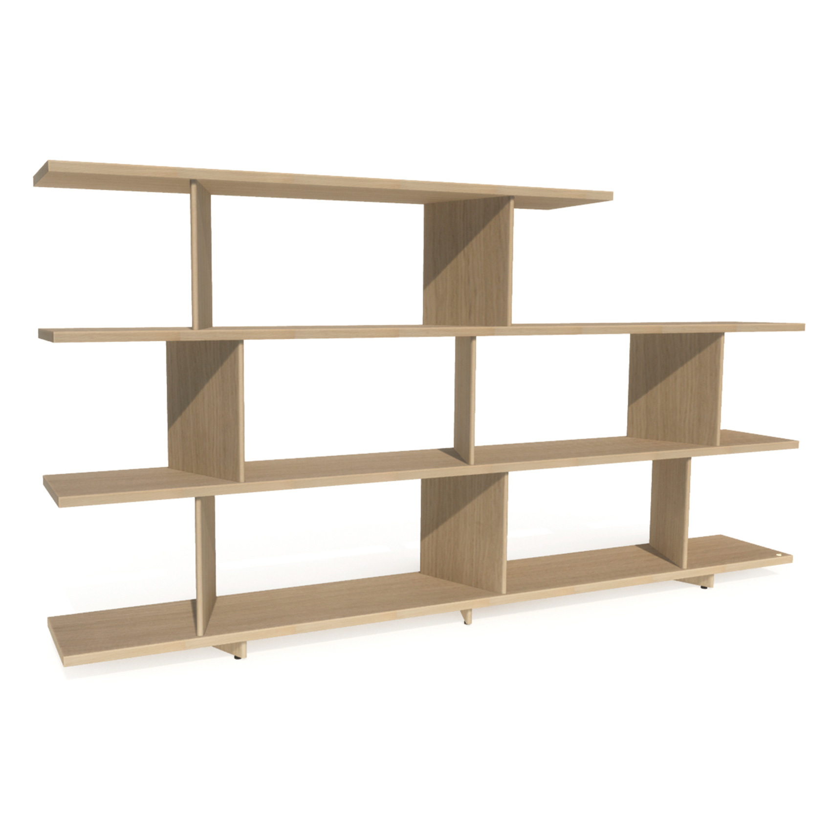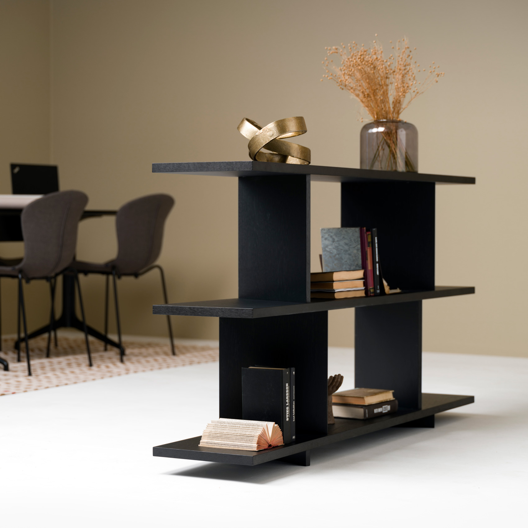Et effektivt og visuelt spennende hyllesystem med overraskende vinkler, designet for å definere soner i åpne landskap.