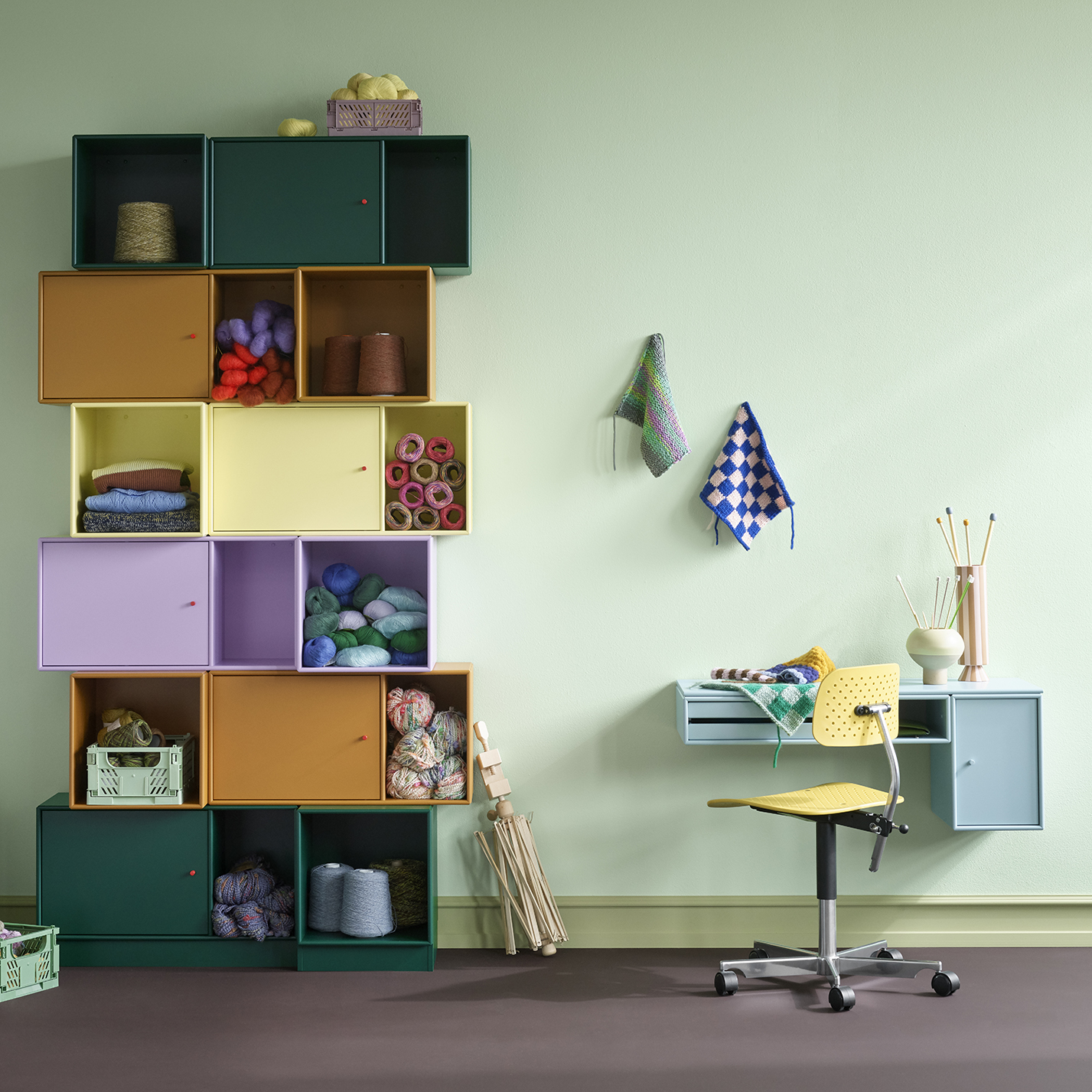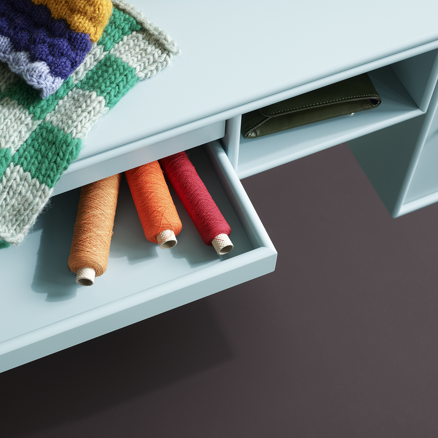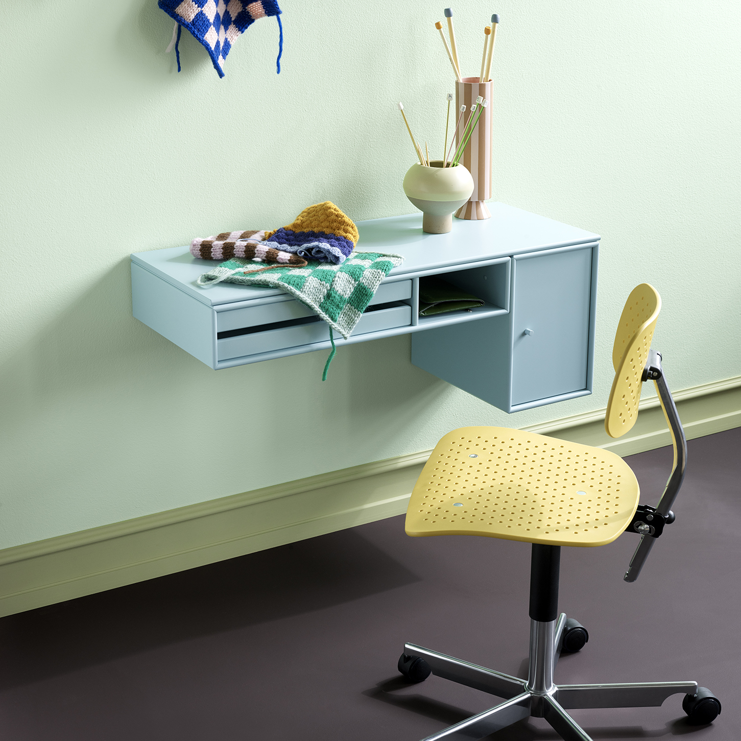 BUREAU veggmontert skrivebord fra Montana med et ryddig, funksjonelt design perfekt til den lille arbeidsplassen. Skrivebordet har to brett som kan tas helt ut av modulet på en side og et romslig skap på den andre siden.
