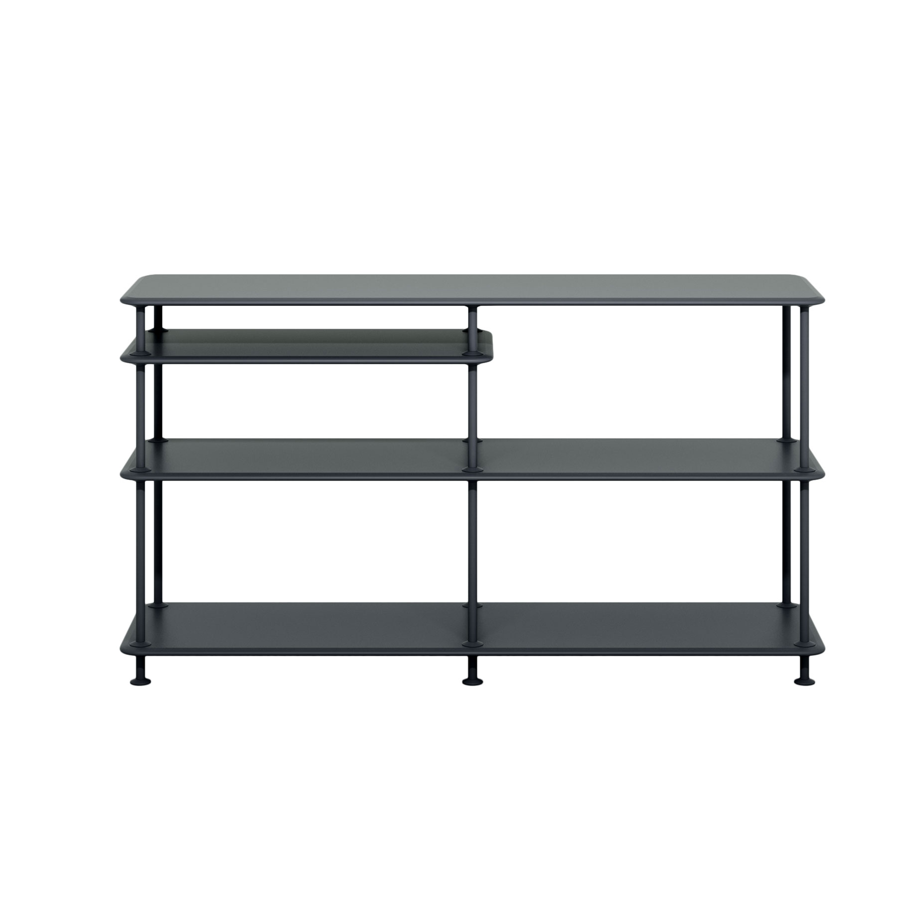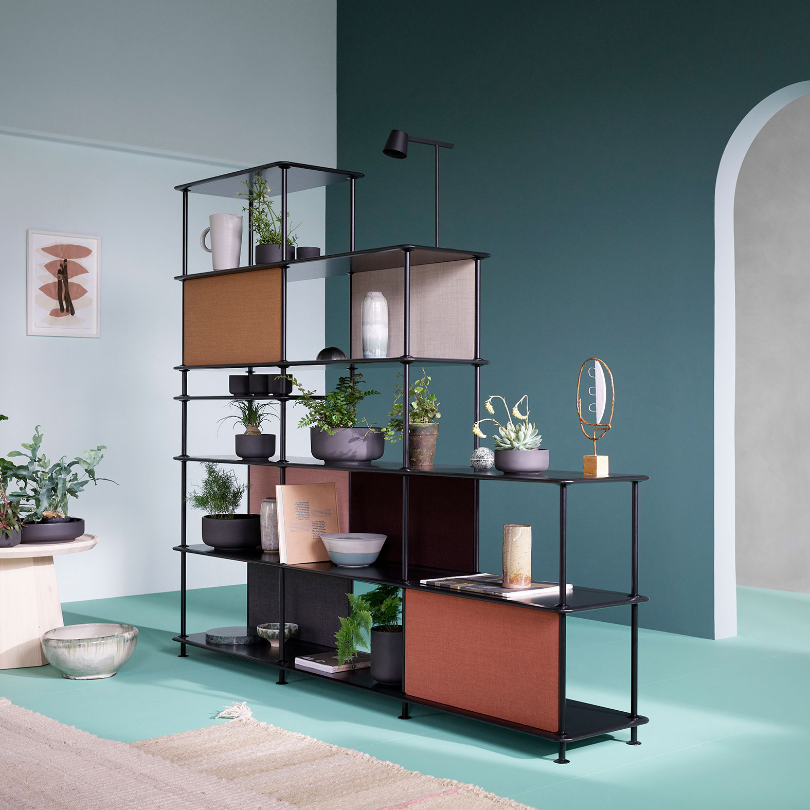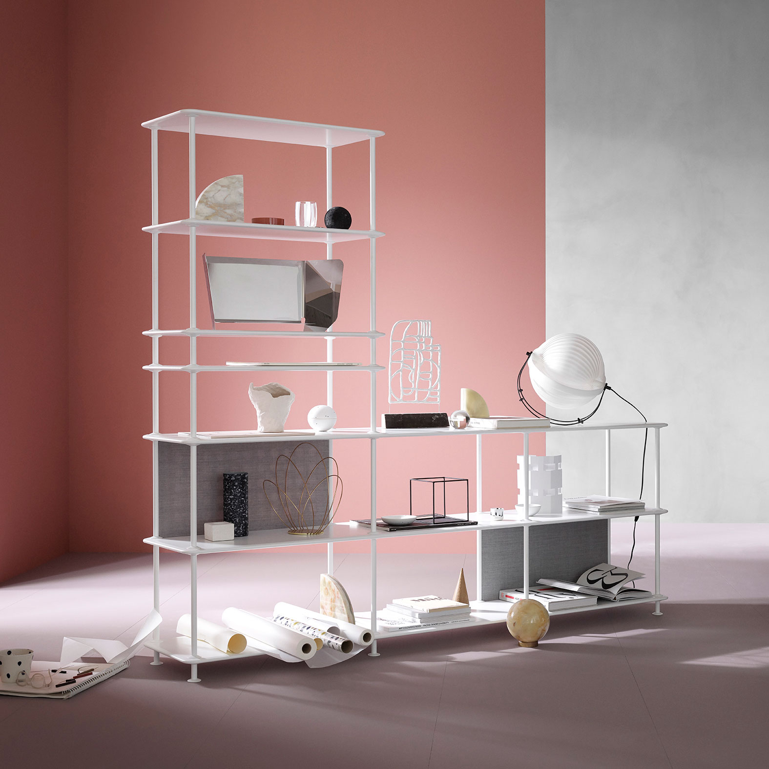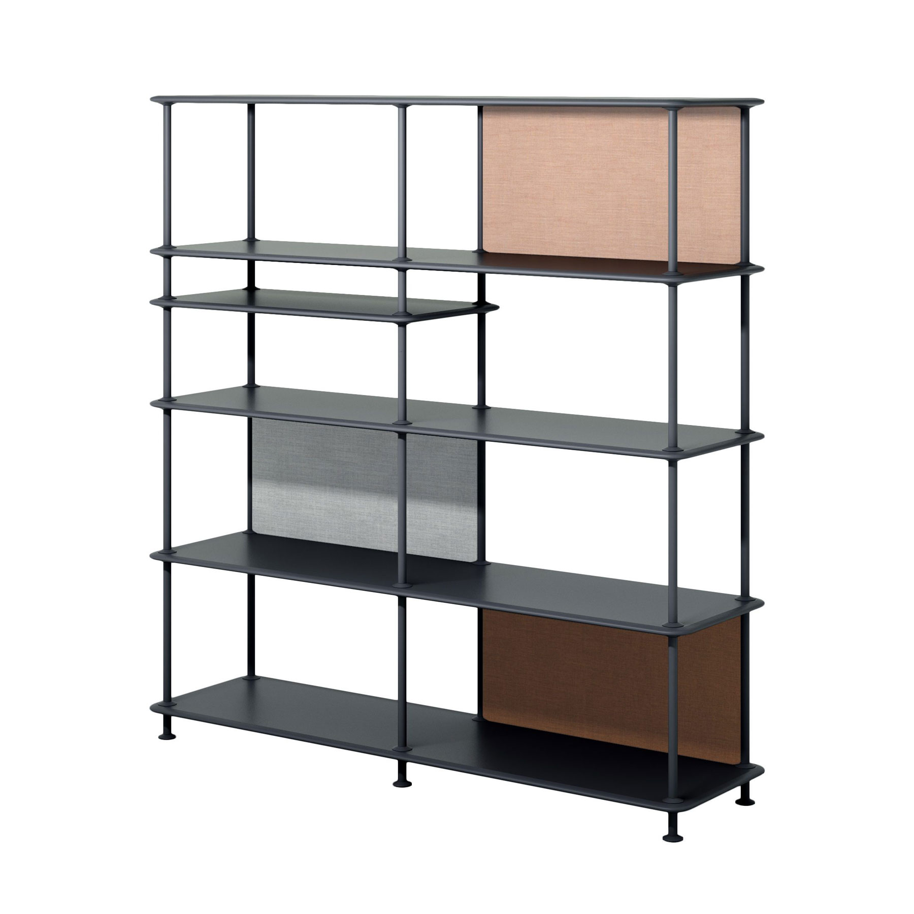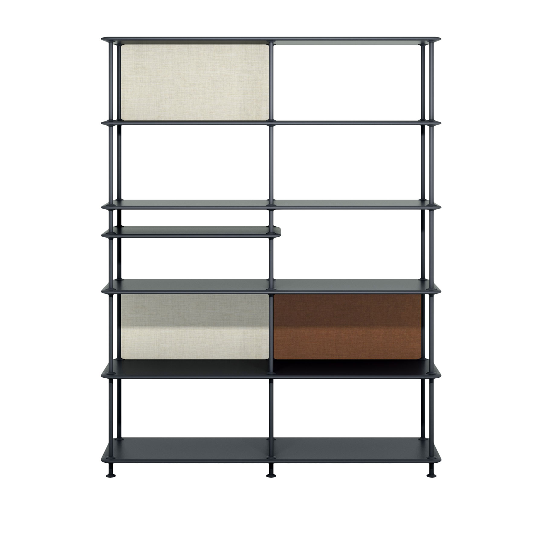Montana Free kan fås i 12 standard oppstillinger, uten eller med ekstra hylle. Mulighetene er mange når det gjelder størrelse og farger; velg den enkle benken med to hyller til sko i entreen eller oppbevaring under et vindu, eller en av de store oppstillingene med seks hyller som romdeler eller reol langs en vegg. Velger du i tillegg de lette stoffpanelene kan du leke med uttrykk og farger og skape flere mindre rom i oppstillingen.