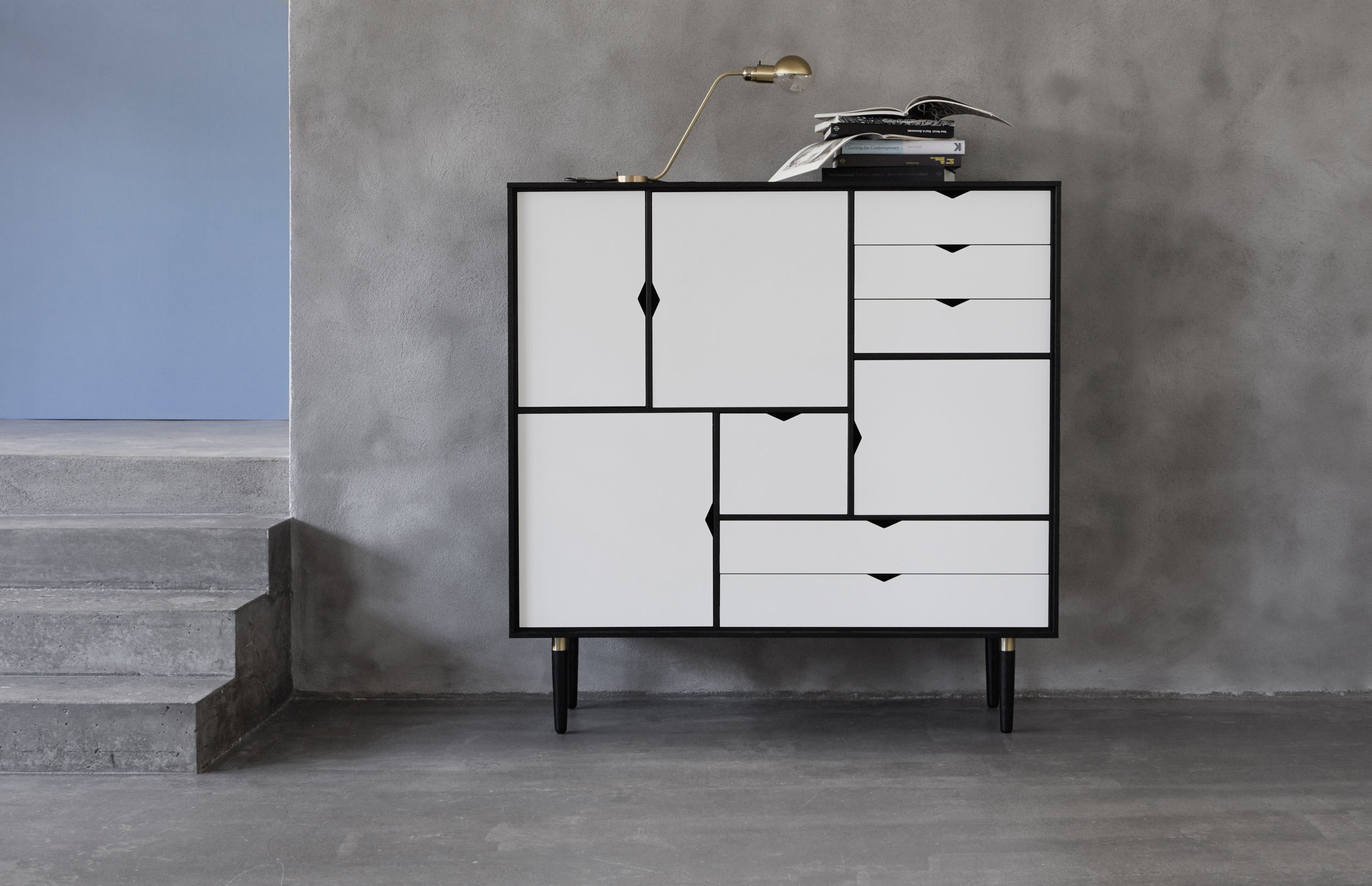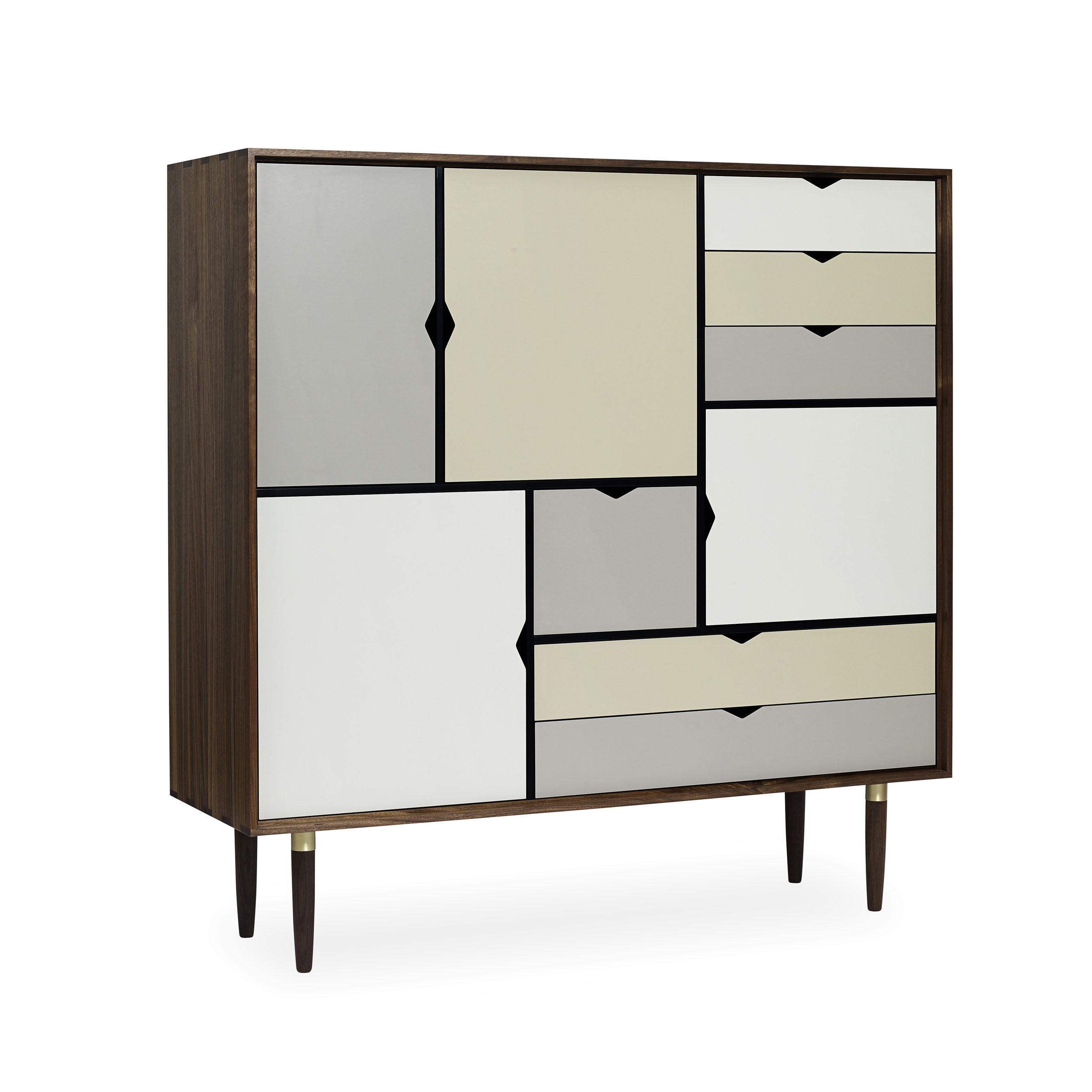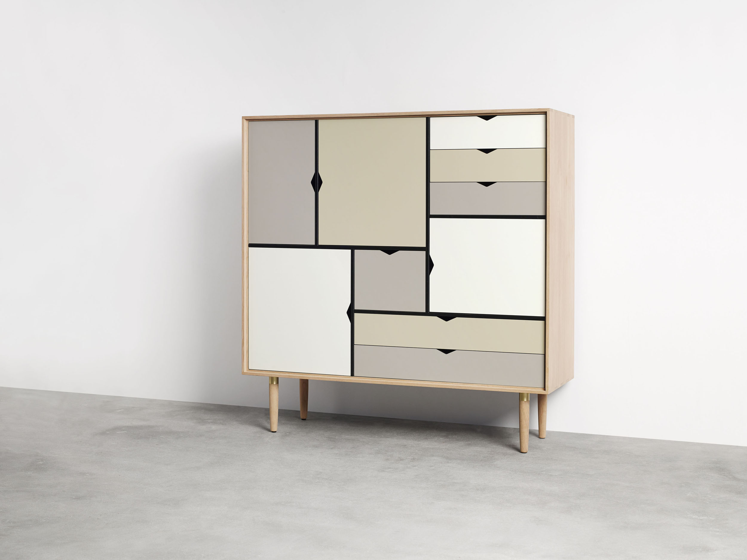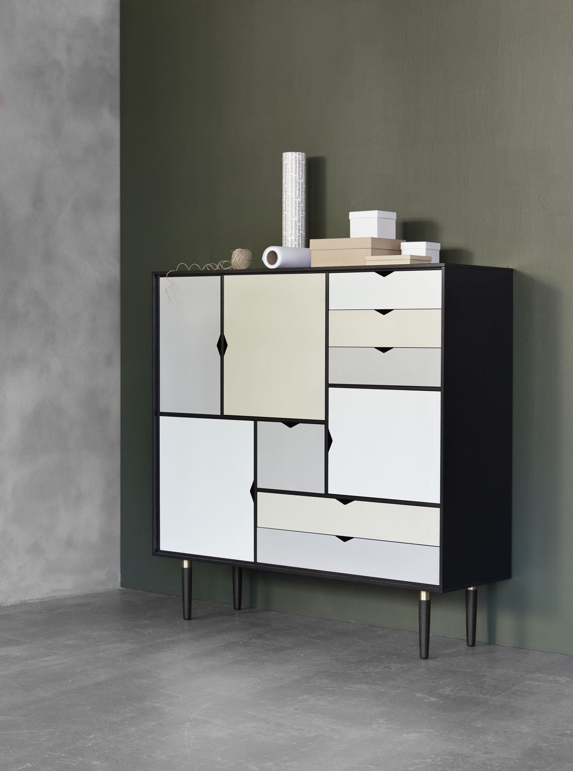 S3 er en kombinasjon av skjenk, klassisk skatoll og skap. Her kan man bruke kreativiteten og kombinere skuffer og dører for å skape en personlig oppbevaring. S3 er også en kombinasjon av det klassiske og moderne. Velg mellom skrog i heltre eik, valnøtt eller sort og med fronter i laminat i enten hvit eller en smakfull kombinasjon av 3 pastellfarger i beige og grålige nyanser.