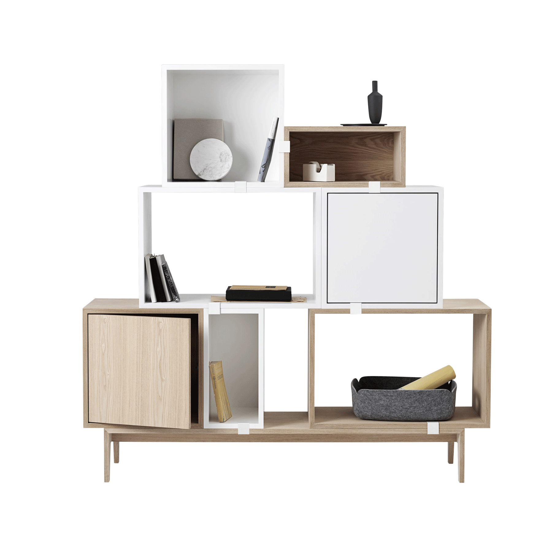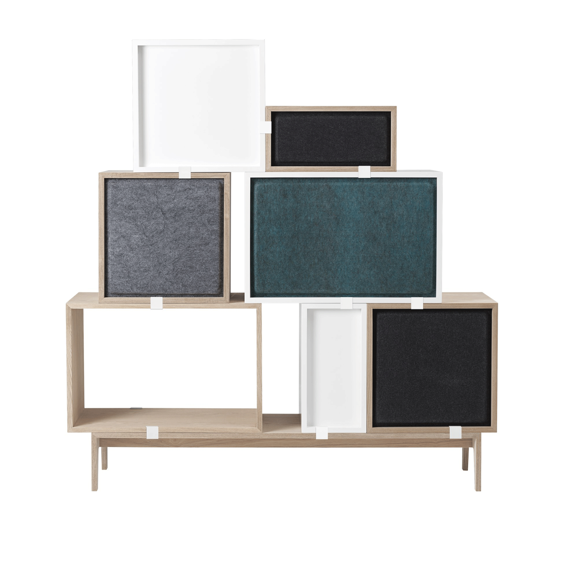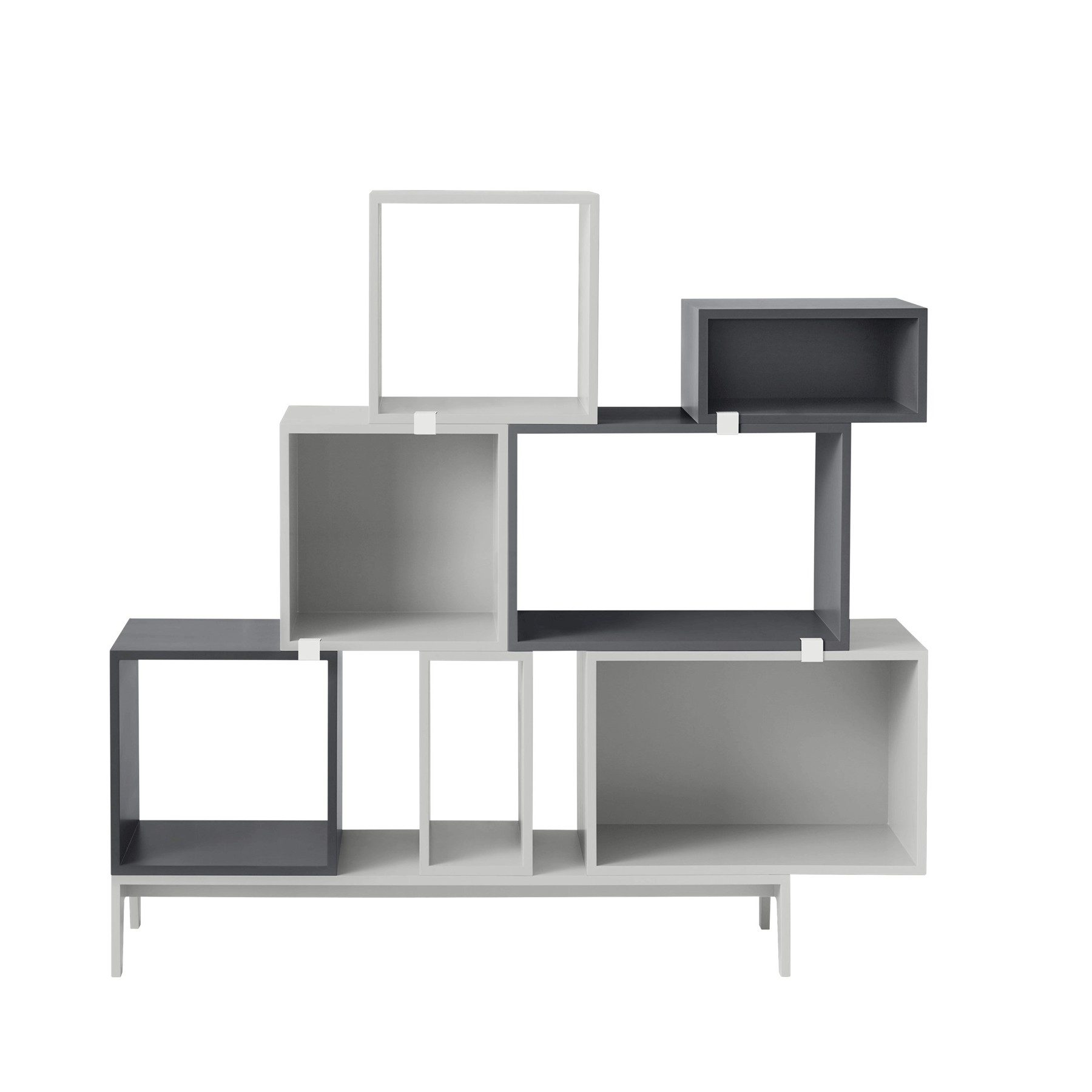 Stacked er et modulbasert hyllesystem fra Muuto. Modulene består av kuber i tre forskjellige størrelser, og kan kombineres helt etter eget ønske. Du kan tilpasse hyllen etter dine behov, stable dem tilfeldig eller symmetrisk, henges opp eller settes på en modul med ben. De forskjellige modulene settes sammen med klips, og du trenger ingen skruer.