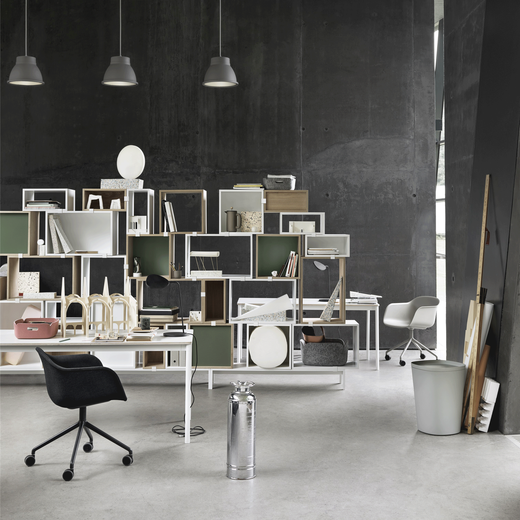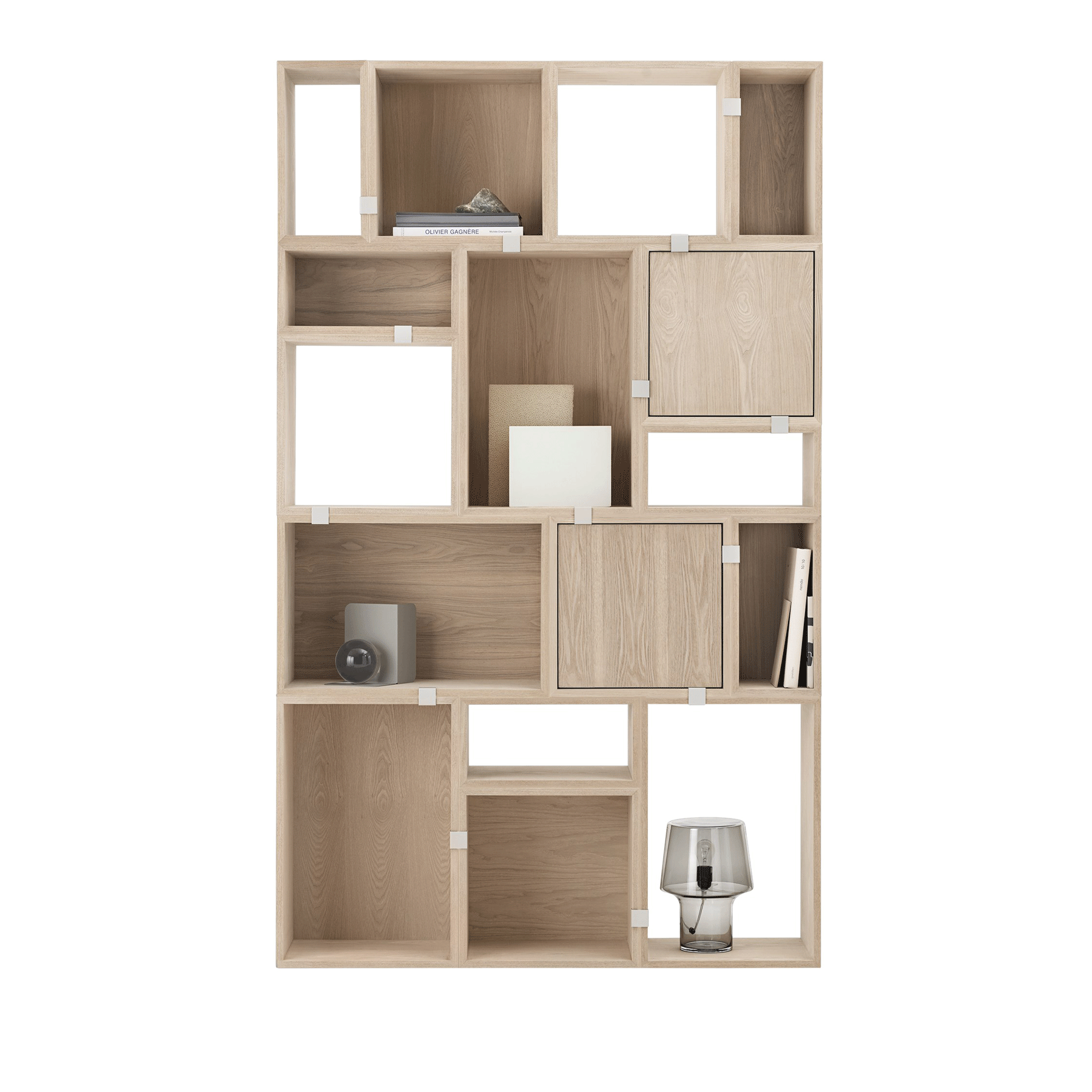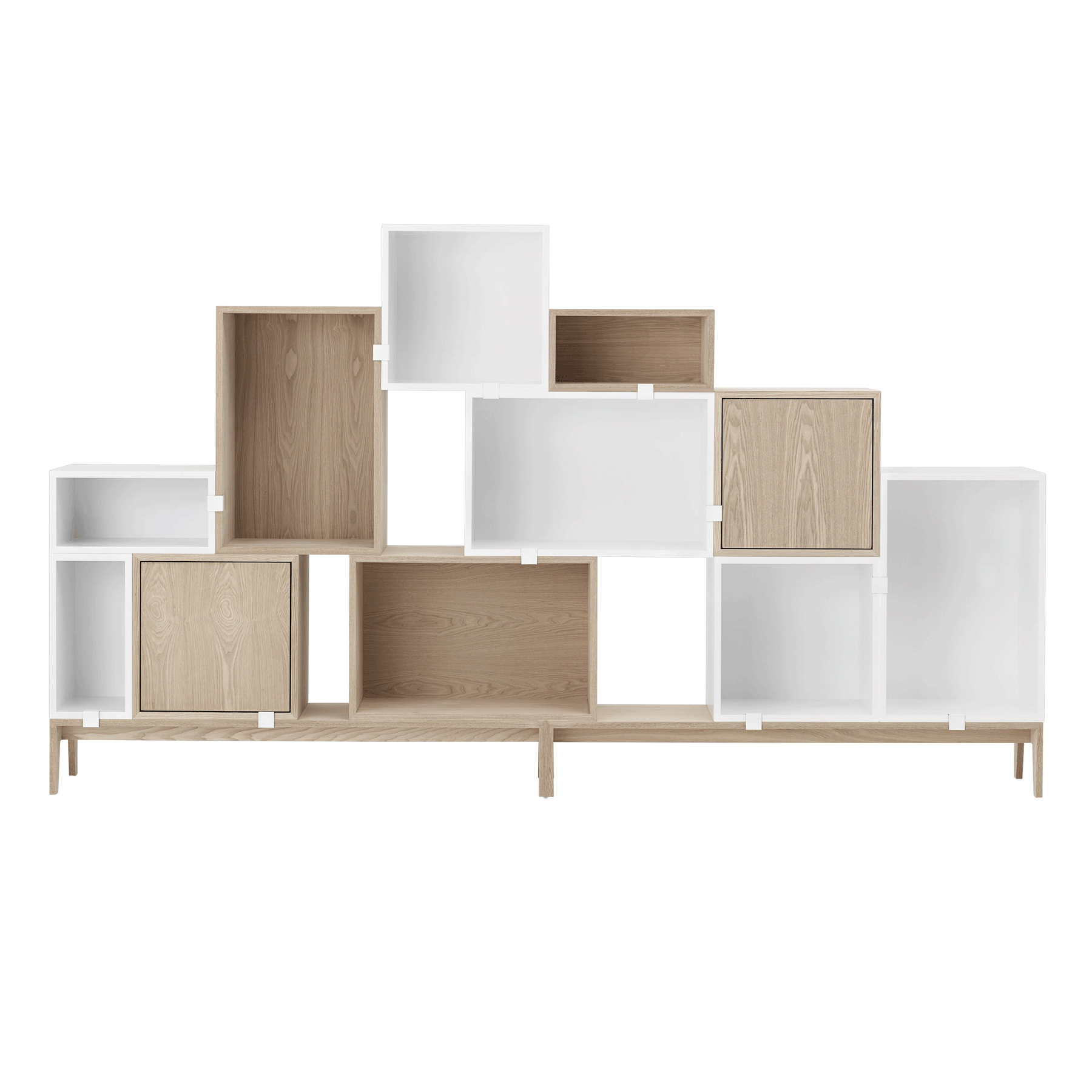 Stacked er et modulbasert hyllesystem fra Muuto. Modulene består av kuber i tre forskjellige størrelser, og kan kombineres helt etter eget ønske. Du kan tilpasse hyllen etter dine behov, stable dem tilfeldig eller symmetrisk, henges opp eller settes på en modul med ben. De forskjellige modulene settes sammen med klips, og du trenger ingen skruer.