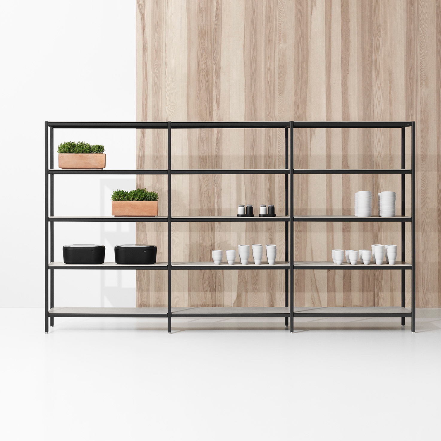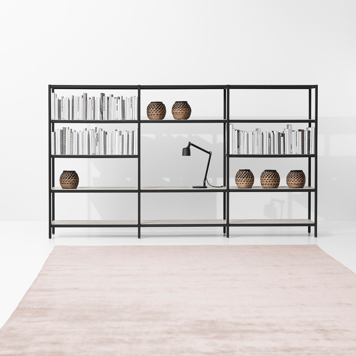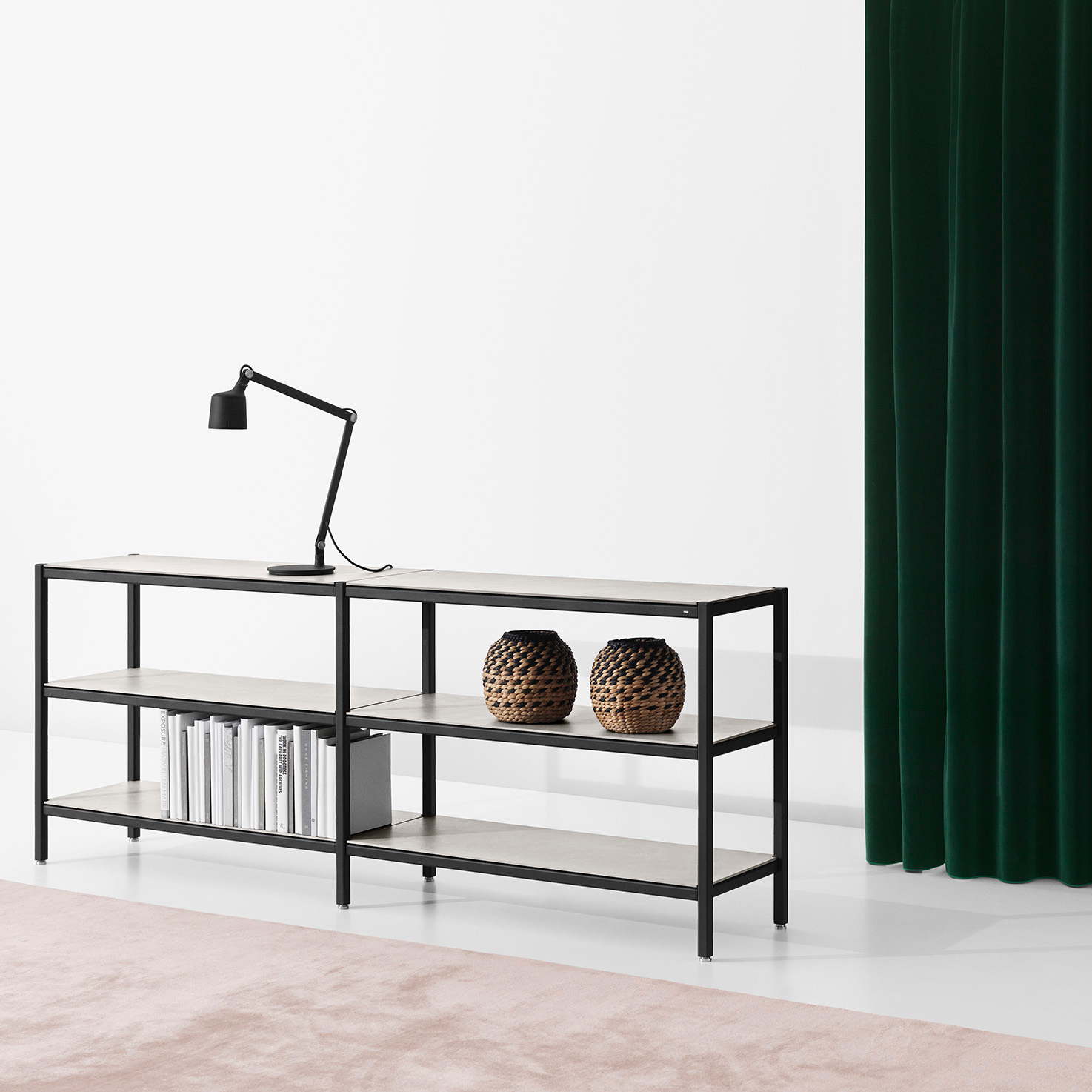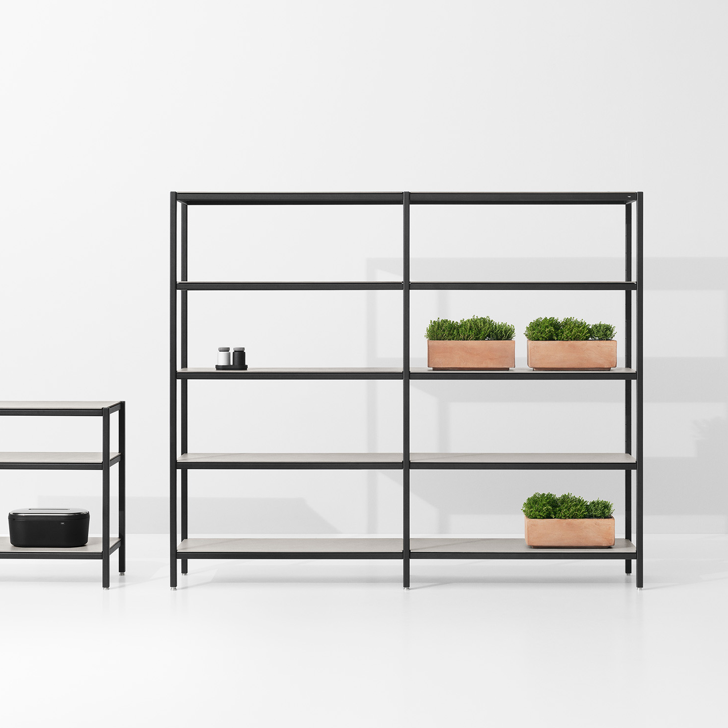 Vipp rack er et modulært reolsystem for kjøkkenet, stuen eller kontoret som er tilgjengelig i fire konfigurasjoner, med 3 eller 5 hyller i høyden. Bein i pulverlakkert stål, hyller i pulverlakkerte aluminiumprofiler med en keramisk hylletopp. Reolens høyde kan justeres med justeringsskruer i rustfritt stål.