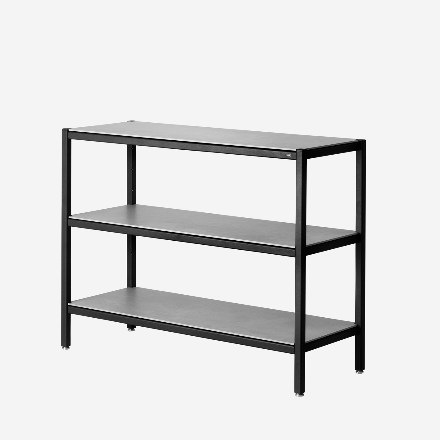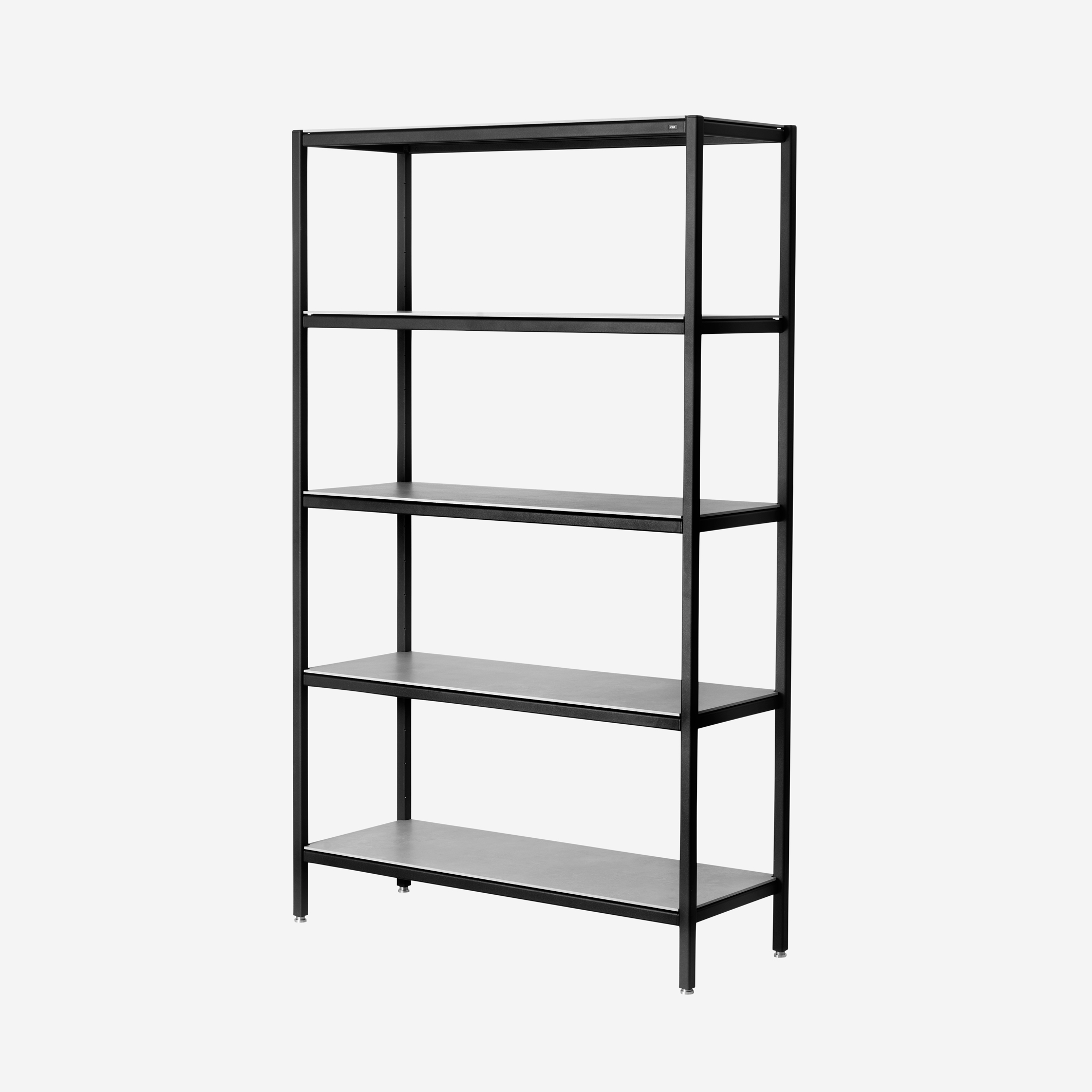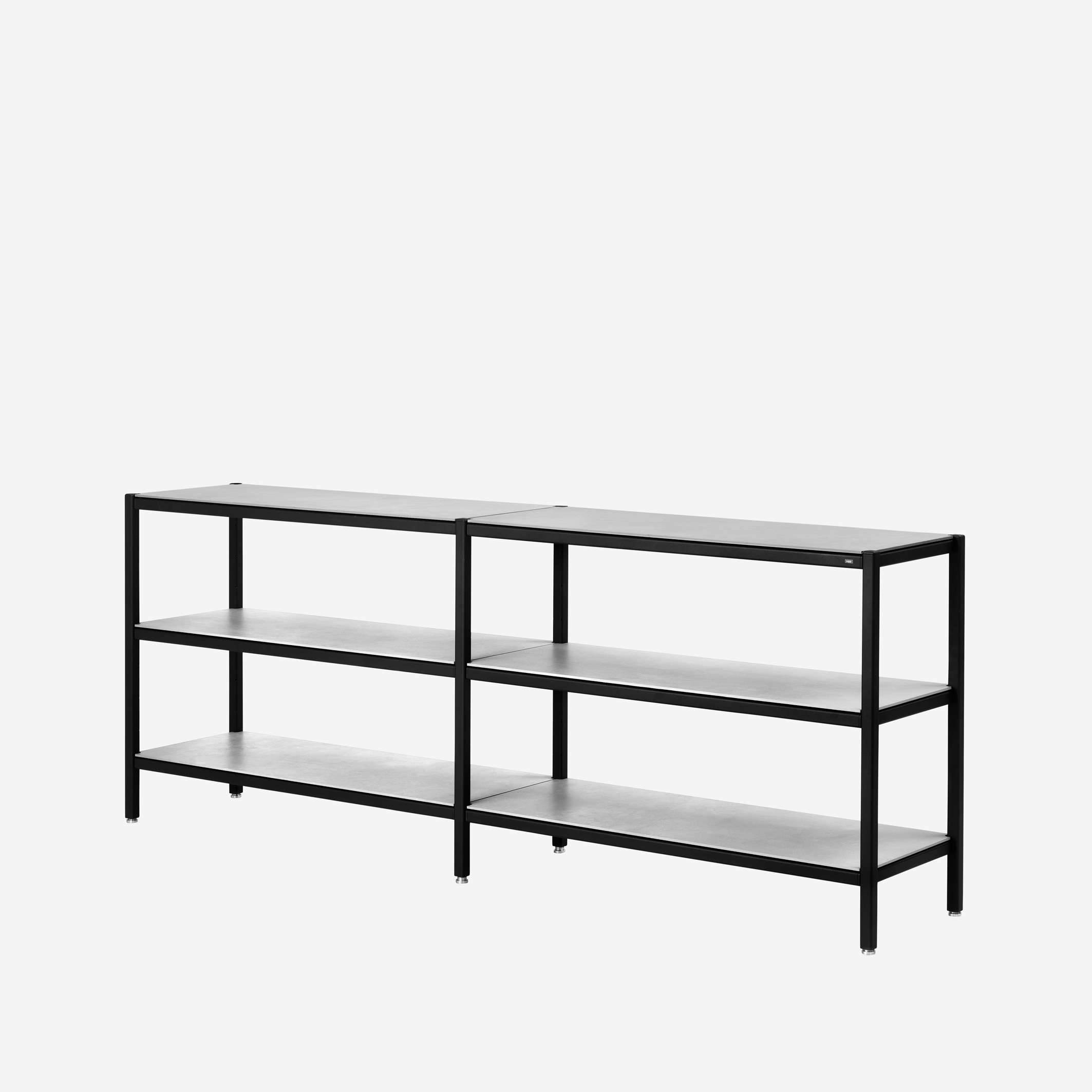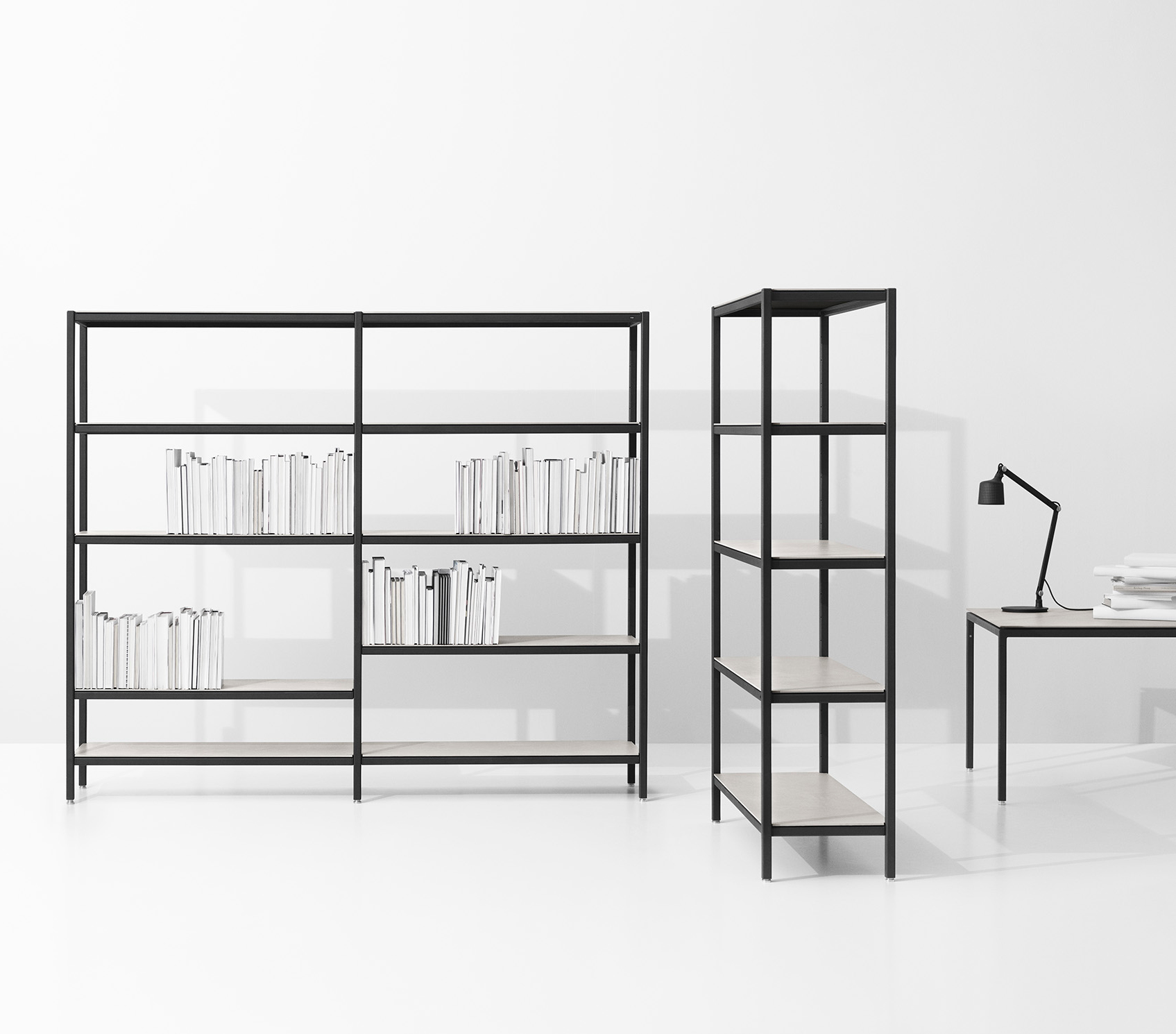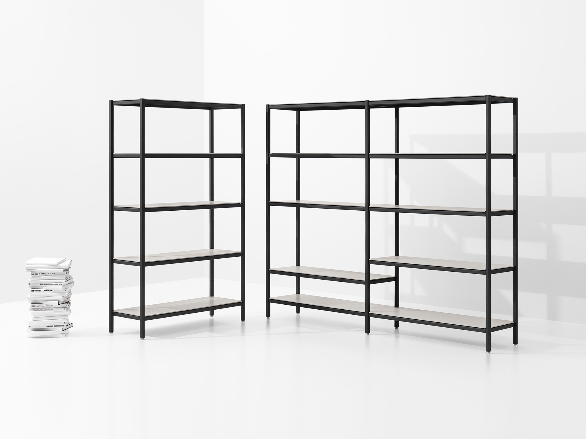 Vipp rack er et modulært reolsystem for kjøkkenet, stuen eller kontoret som er tilgjengelig i fire konfigurasjoner, med 3 eller 5 hyller i høyden. Bein i pulverlakkert stål, hyller i pulverlakkerte aluminiumprofiler med en keramisk hylletopp. Reolens høyde kan justeres med justeringsskruer i rustfritt stål.