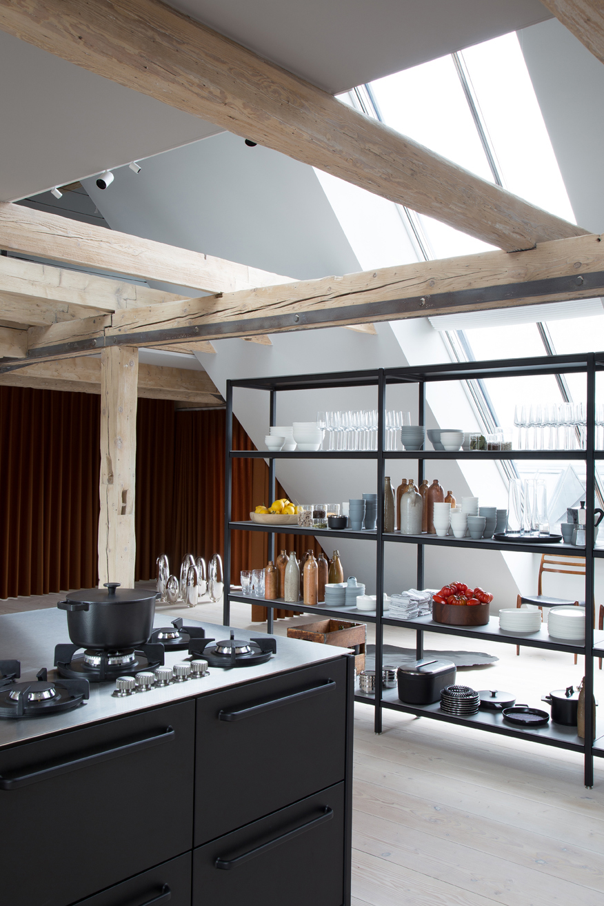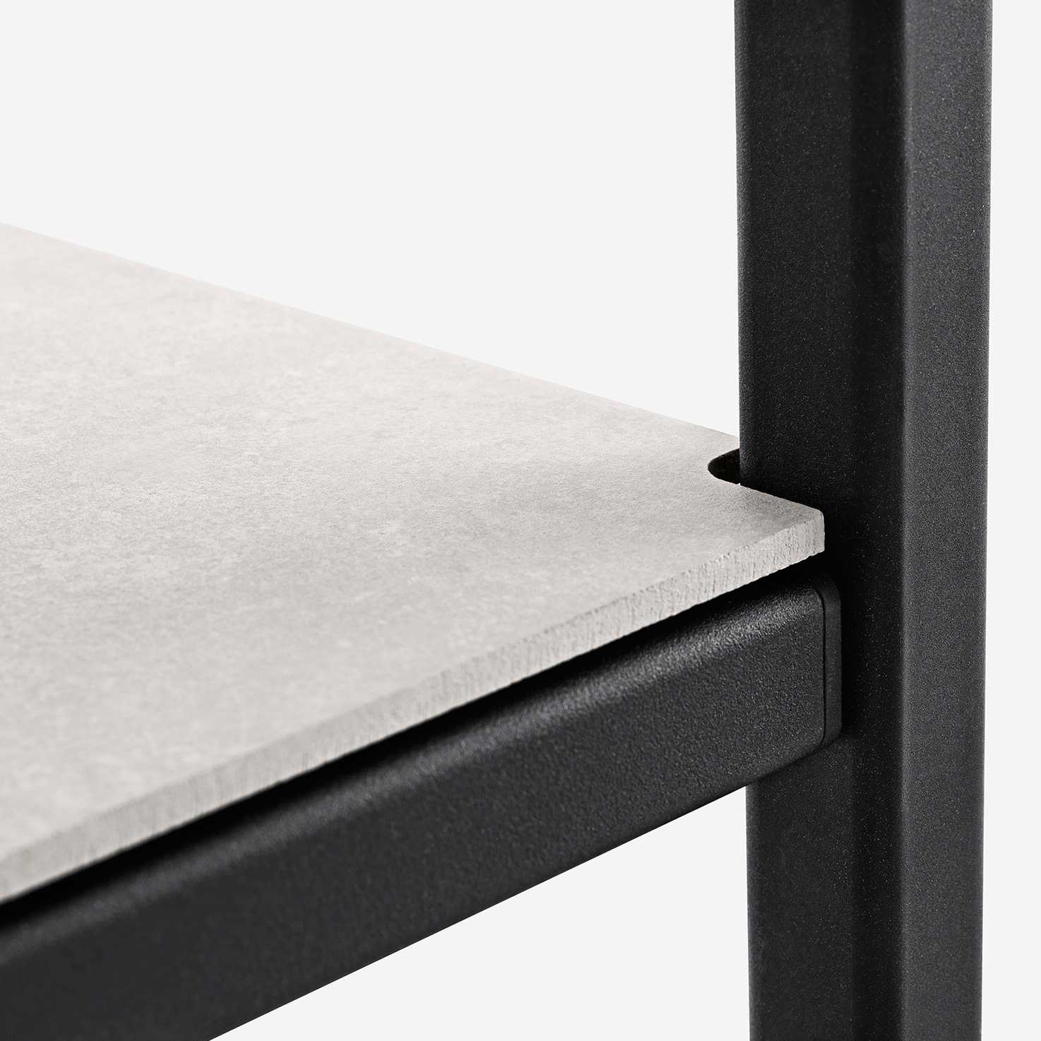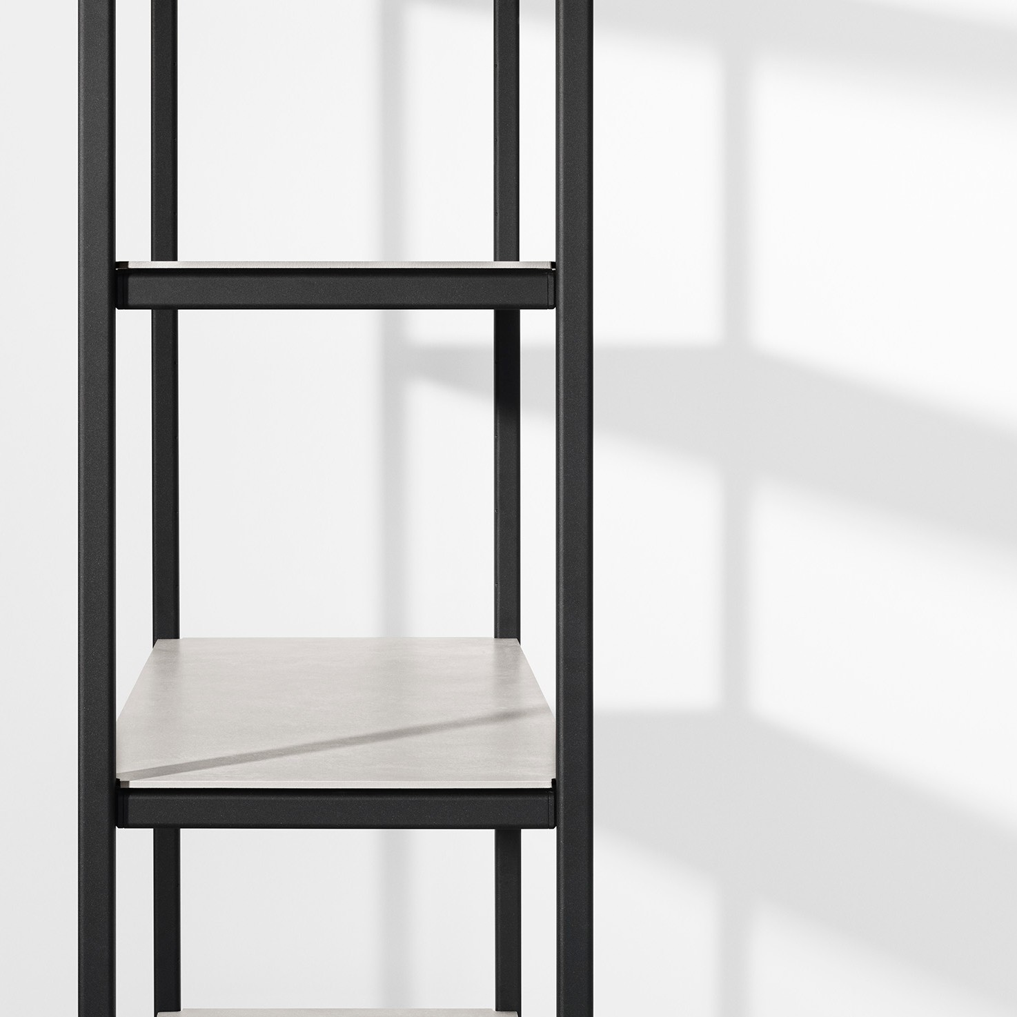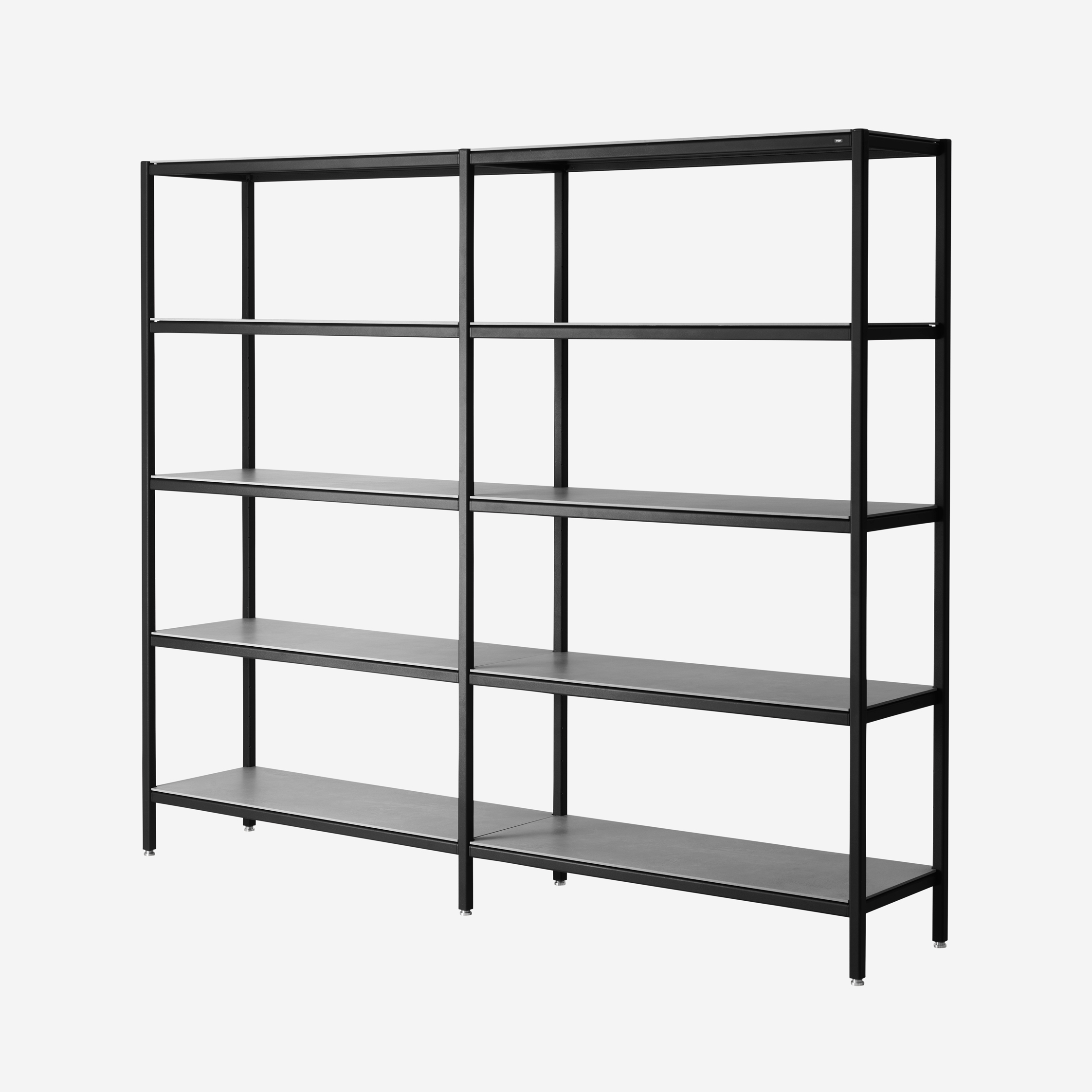 Vipp rack er et modulært reolsystem for kjøkkenet, stuen eller kontoret som er tilgjengelig i fire konfigurasjoner, med 3 eller 5 hyller i høyden. Bein i pulverlakkert stål, hyller i pulverlakkerte aluminiumprofiler med en keramisk hylletopp. Reolens høyde kan justeres med justeringsskruer i rustfritt stål.