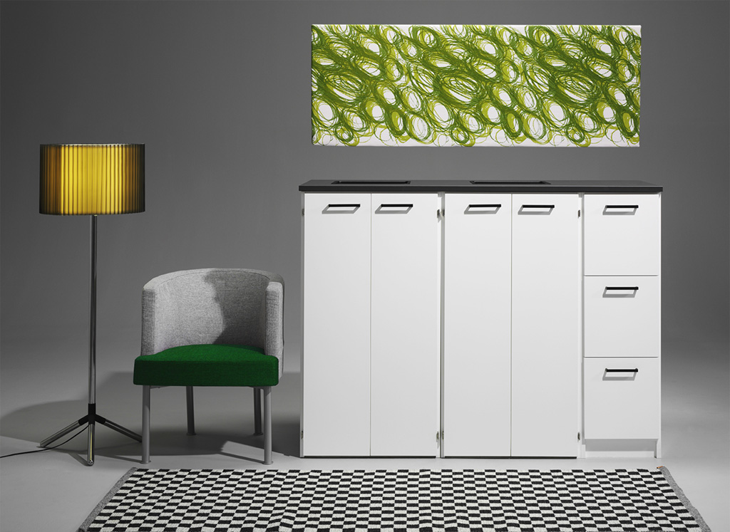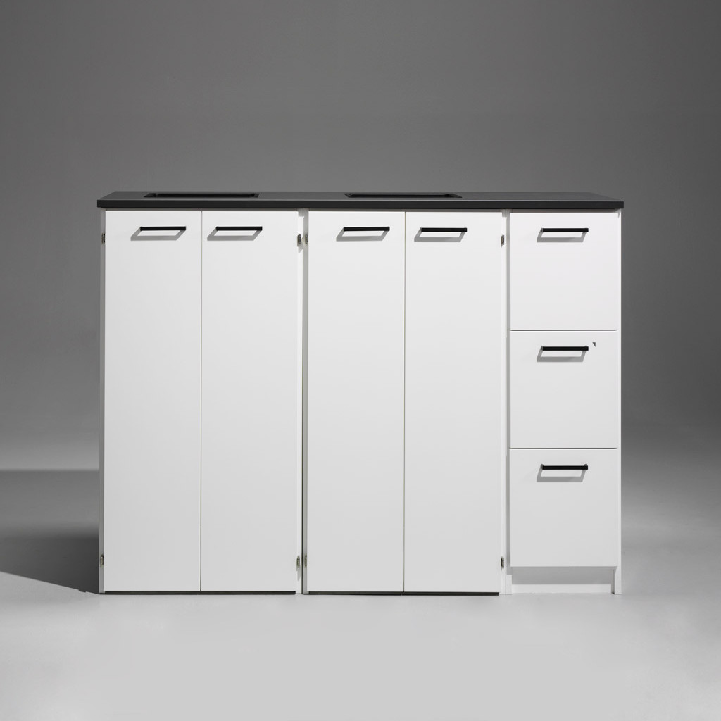 CombiLine – Miljøstasjon 2. Miljøstasjonen som dekker hele miljøsortering for både store og små kontorer. Ferdig oppsett som avbildet med hull i benkeplate. Miljøstasjonen er tilpasset 190-liters søppeldunk på hjul og 19 + 10-liters dunker. Disse inngår ikke og må kjøpes separat. Skrog og fronter i hvitt, benkeplate i laminat Formica F2297.