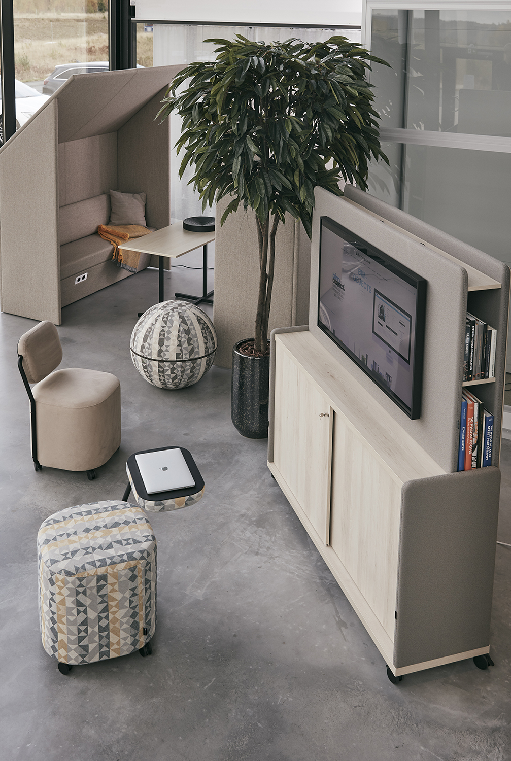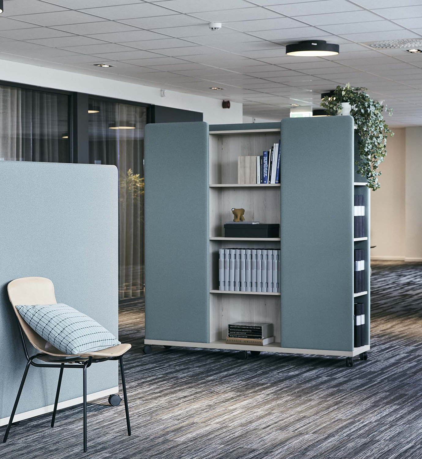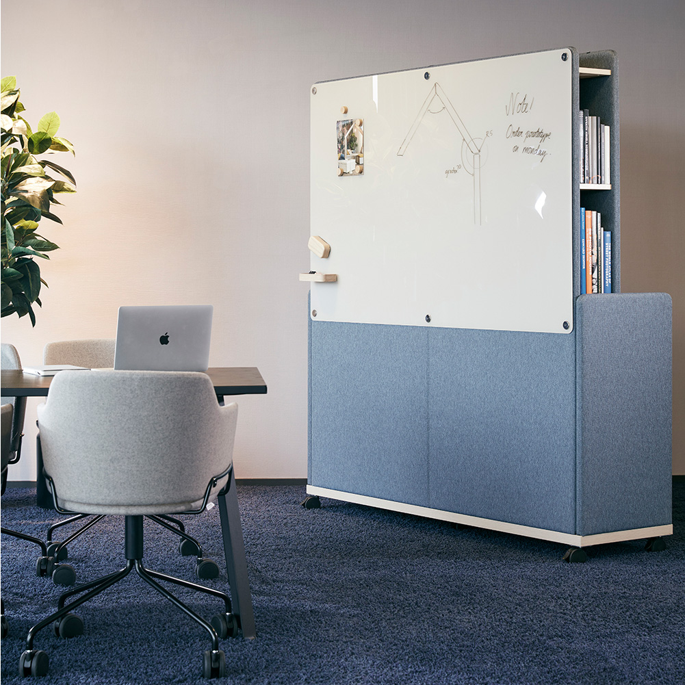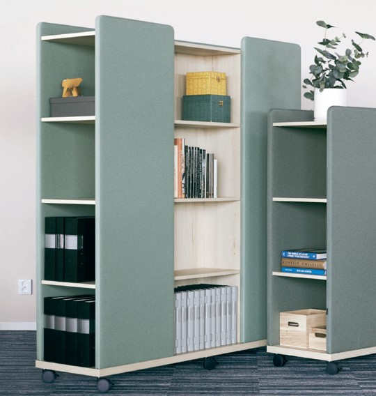 Moving Wall er tre oppbevaringsmøbler som også fungerer som romdelere, lydabsorbenter og interiørelementer. Takket være hjulene kan de enkelt forlyttes, og designet gjør det lett å skjule ledninger og montere strømuttak.