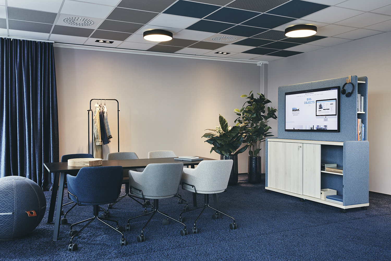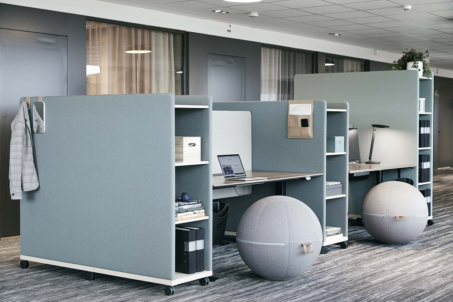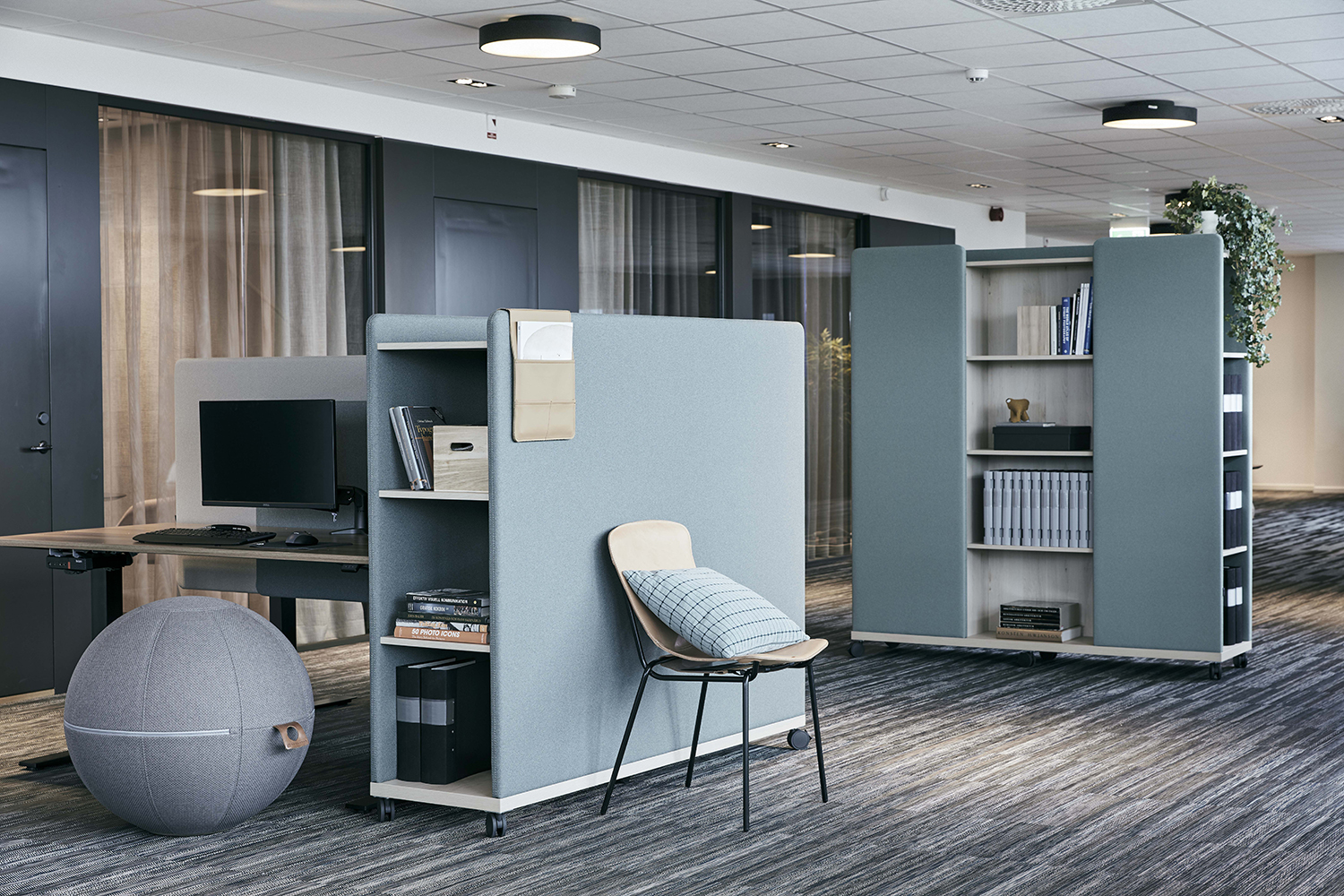 Moving Wall er tre oppbevaringsmøbler som også fungerer som romdelere, lydabsorbenter og interiørelementer. Takket være hjulene kan de enkelt forlyttes, og designet gjør det lett å skjule ledninger og montere strømuttak.