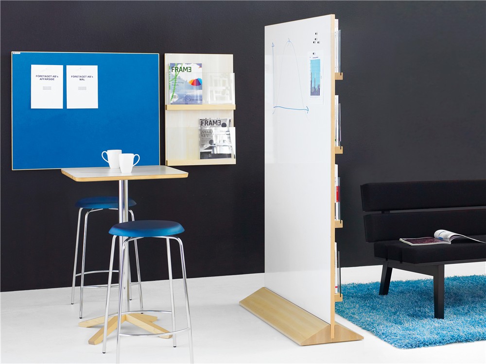 3. En kombinasjon med rette eller vinklede lister med rygg i tre, grå korklinoleum eller magnetisk whiteboard inklusiv magneter.