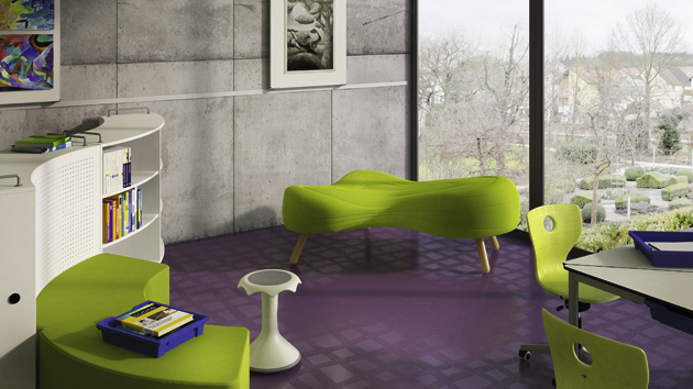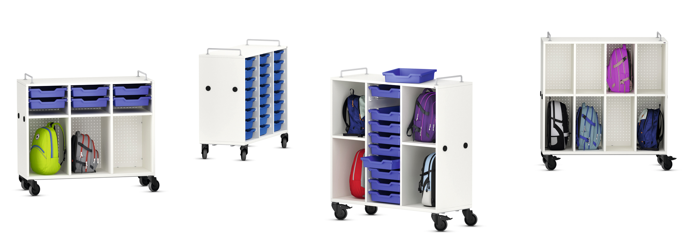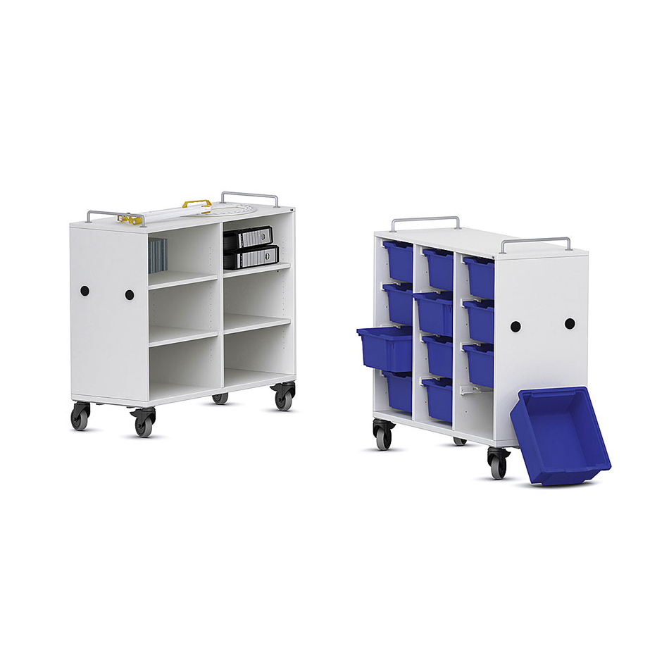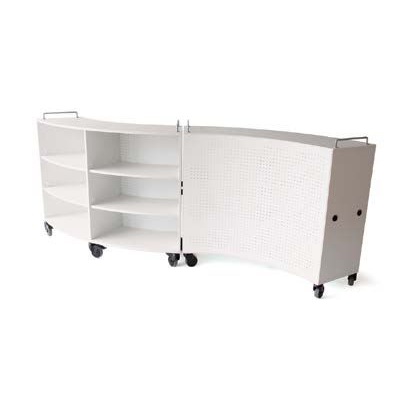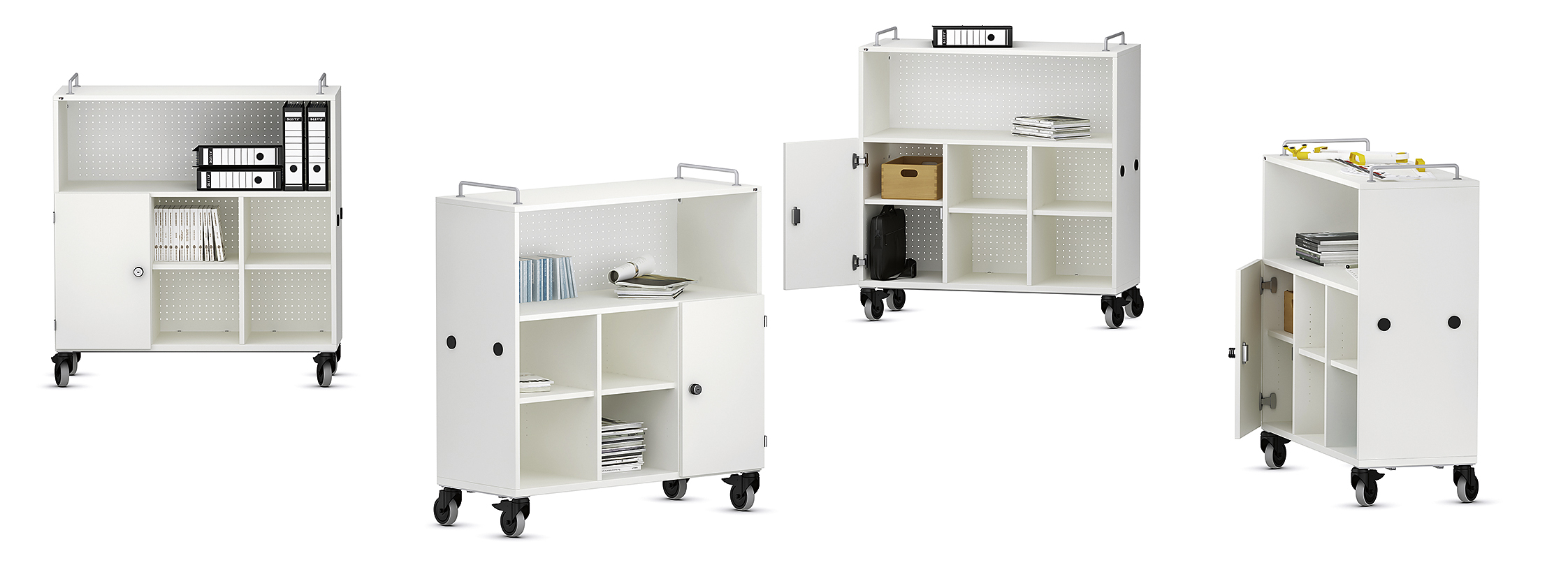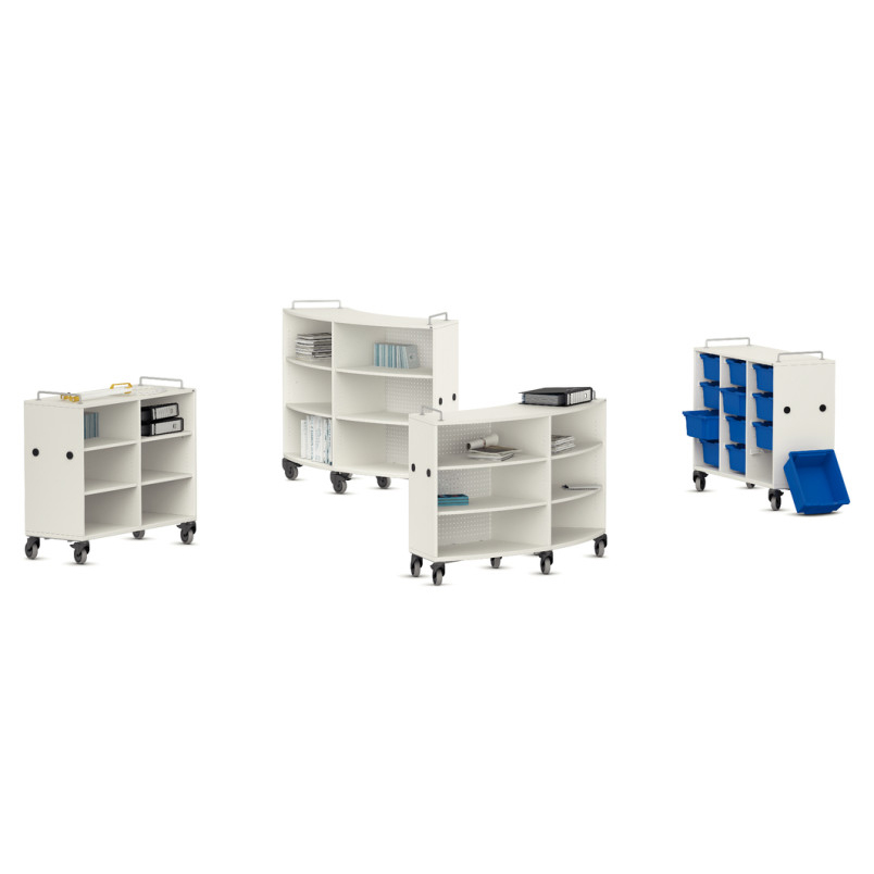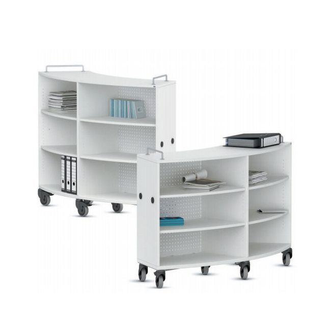 Elementsystem bestående av 7 ulike mobile reoler og myke seteelementer som kan settes sammen i ulike formasjoner.