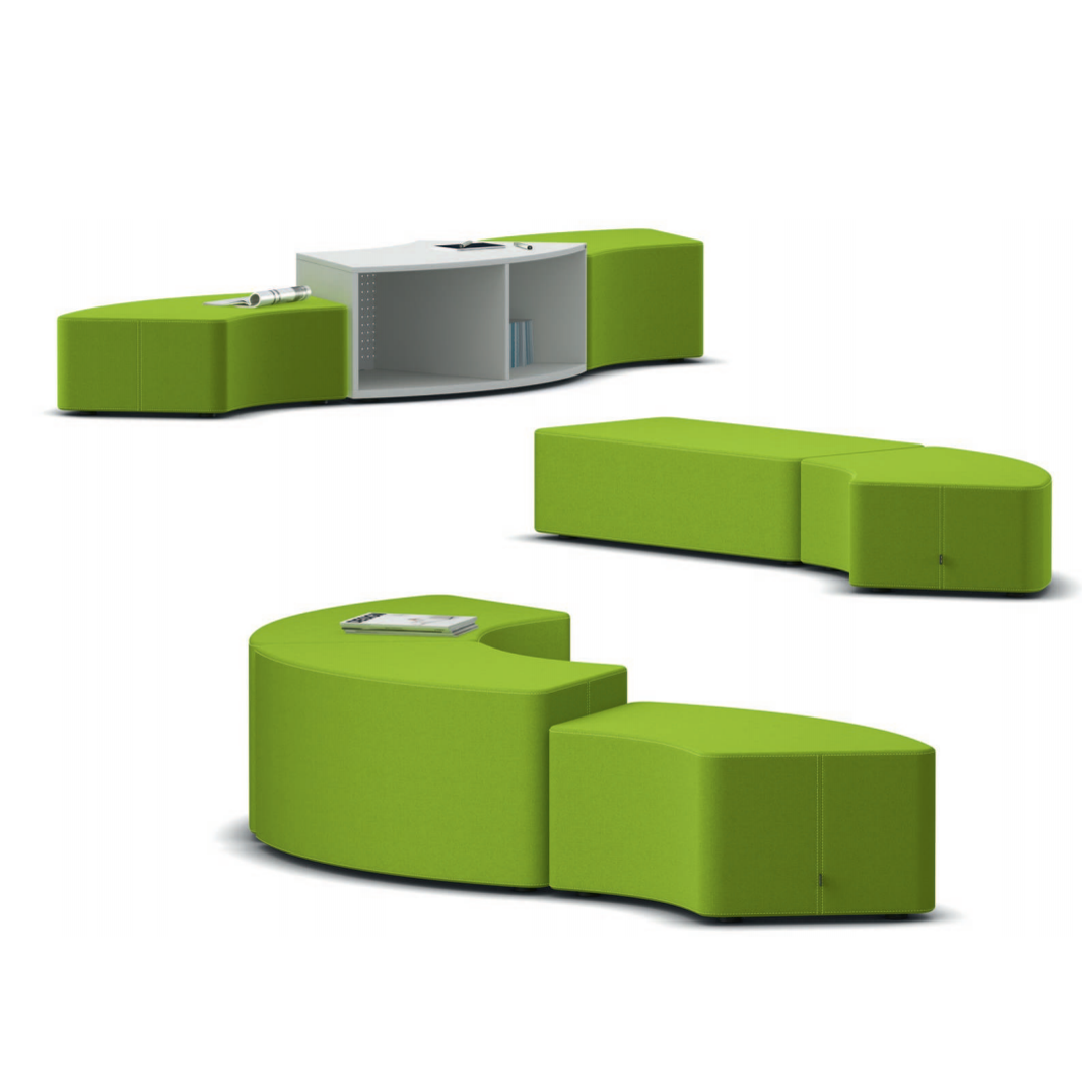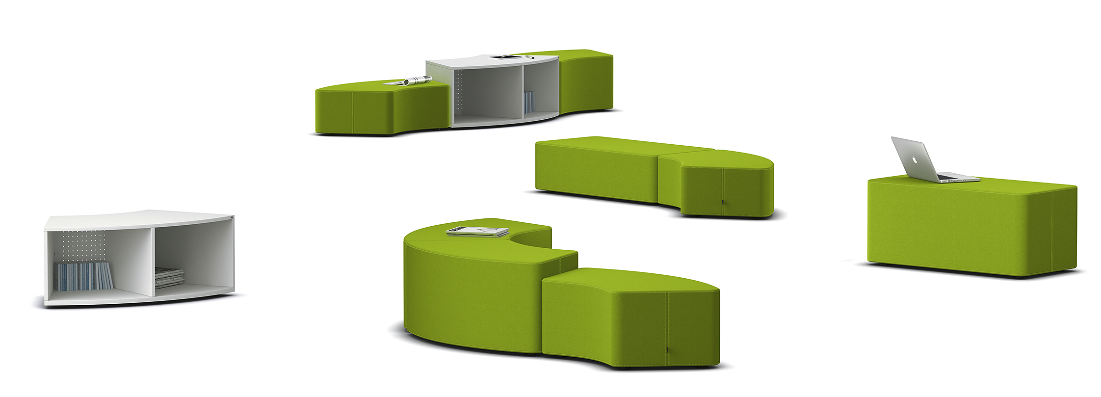 Magneter på utsiden for festing av flere skapelementer. Bueformede landskap-sete- og skapelementer kan kombineres lineært, og på grunn av de avstemte innvendige hhv. utvendige radiene kan de kombineres rygg mot rygg til sirkel- og slangeformede sete-skaplandskap.