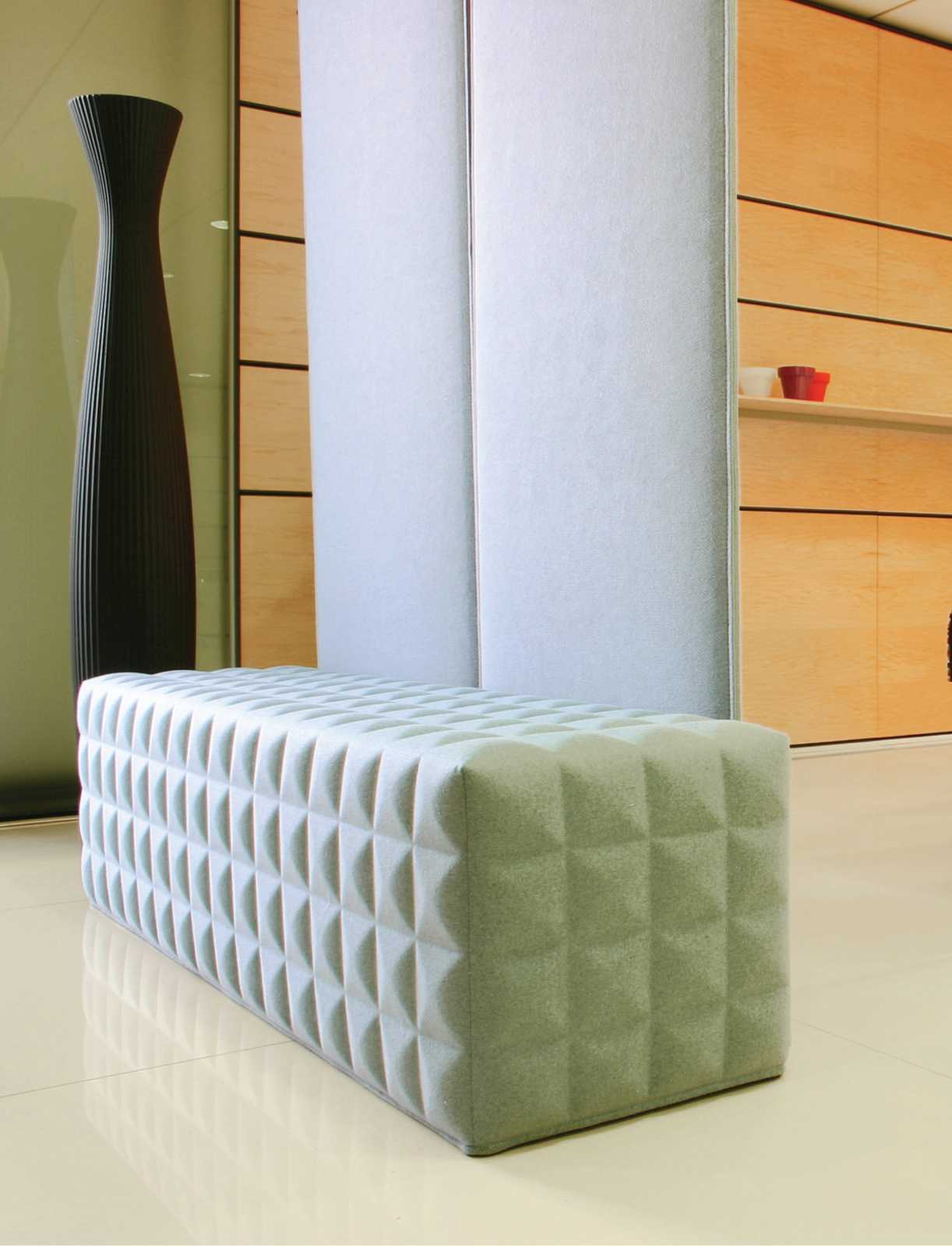 Den filtlignende materiale er laget av 100 prosent resirkulert PET (gamle plastflasker osv). Med sine lydabsorberende og grønne produkter skaper BuzziSpace små oaser av fred og ro – på kontoret og i samvittigheten.