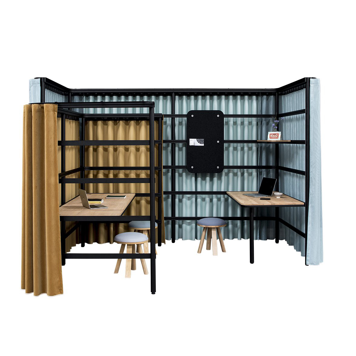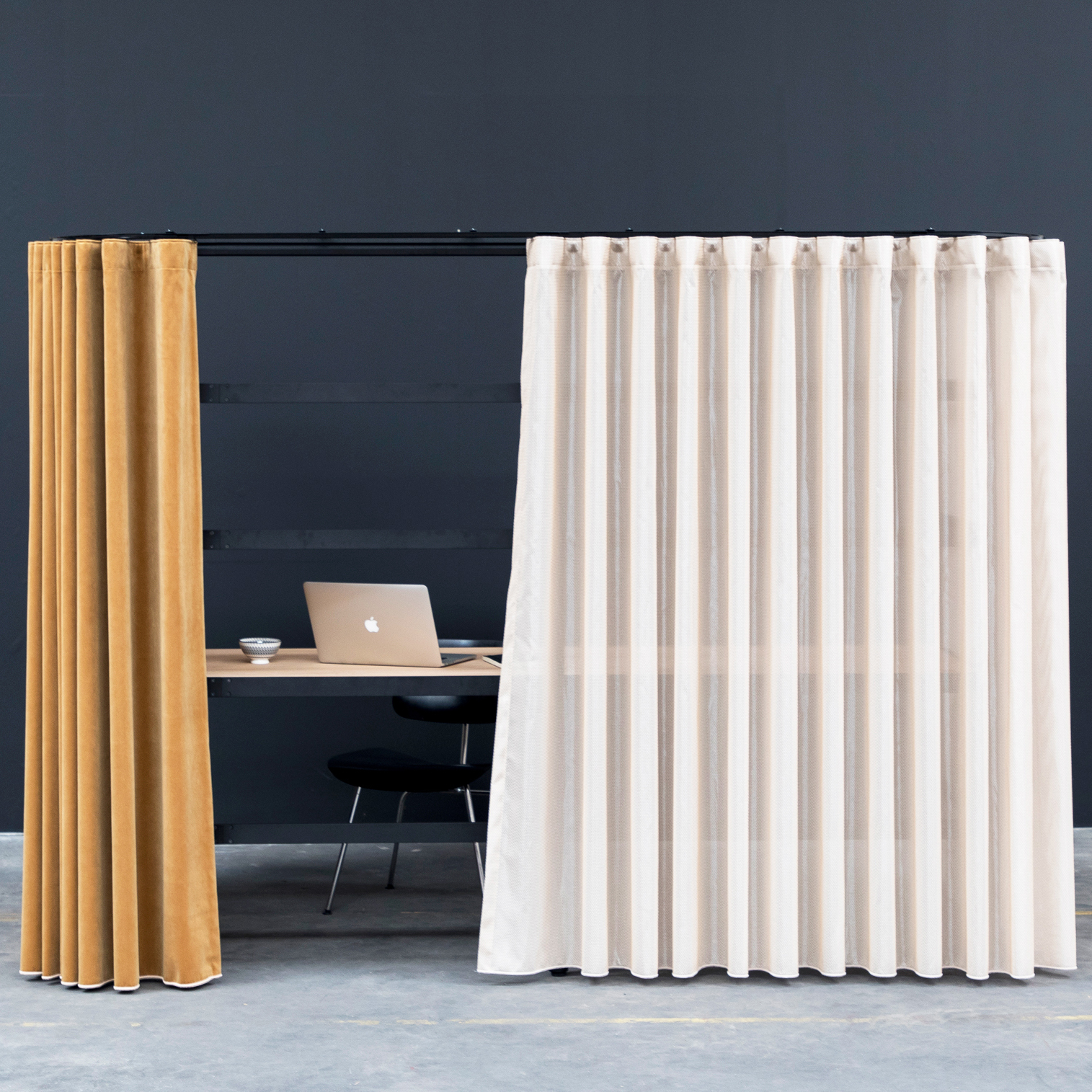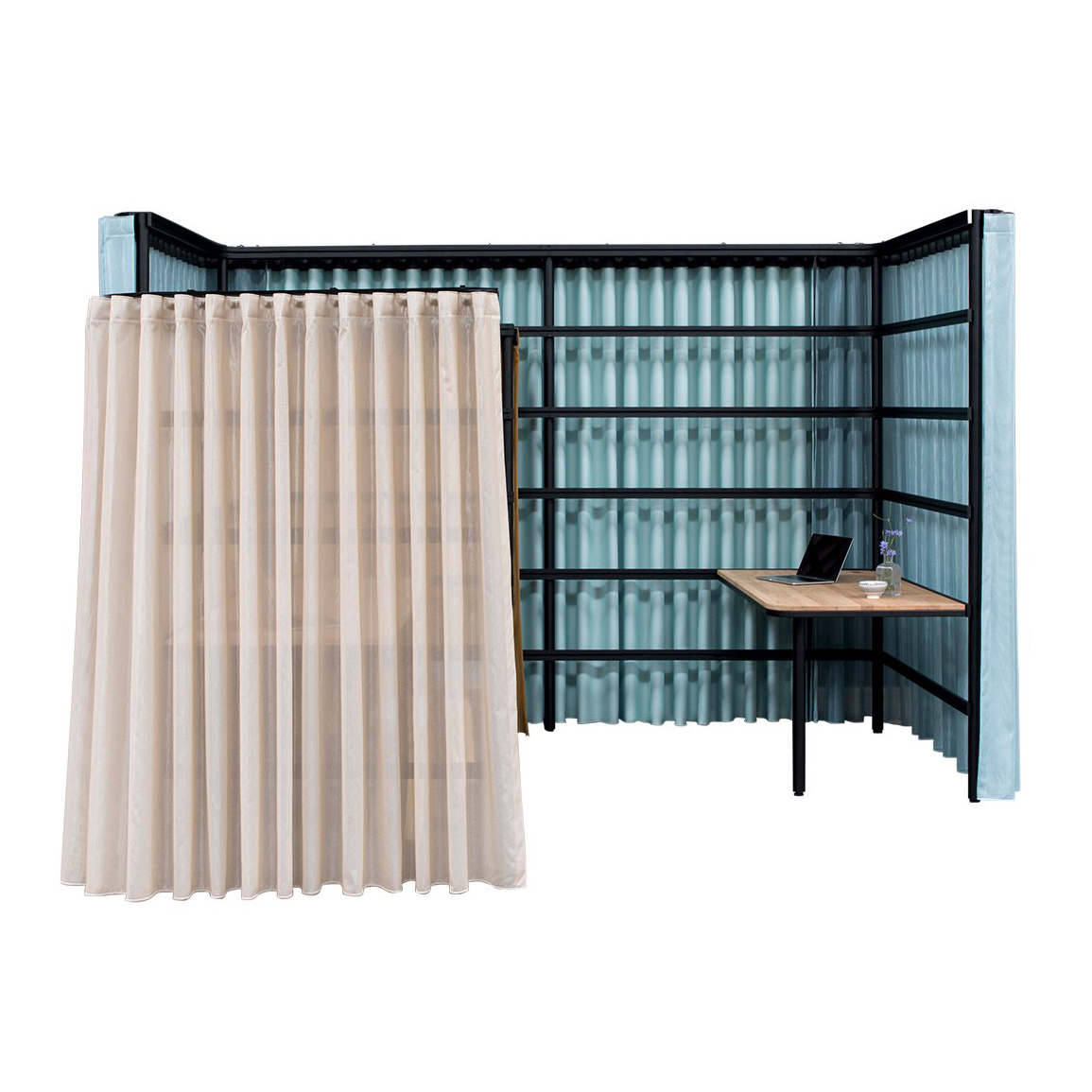 Et modulsystem…uten grenser. Det dynamiske, metalliske rammeverket kan skapes og gjenskapes i henhold til hverdagens behov – enten for å møte, ringe, fokusere eller samarbeide. Gardinene gir et ekstra lag med funksjonalitet, og fungerer som et akustisk og visuelt skjold for omverdenen.