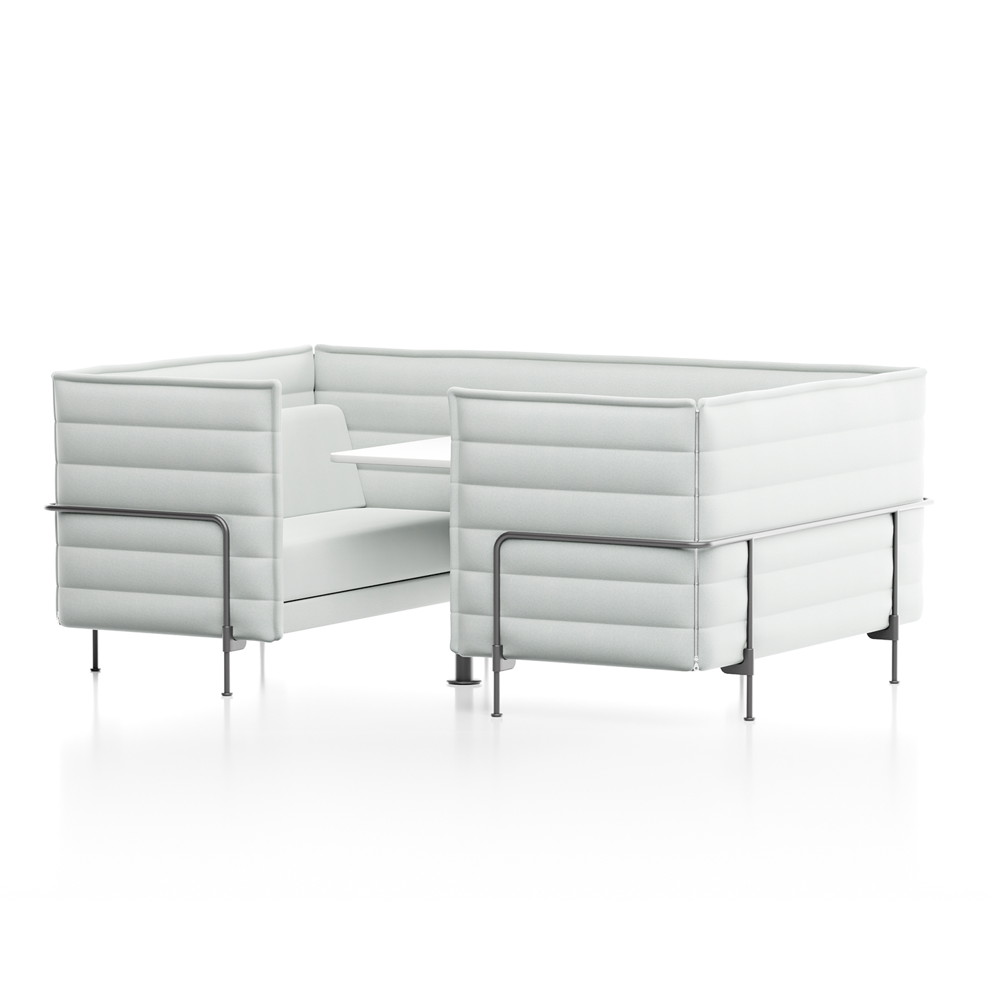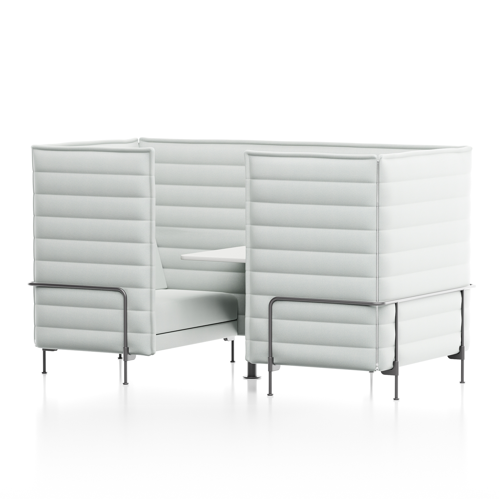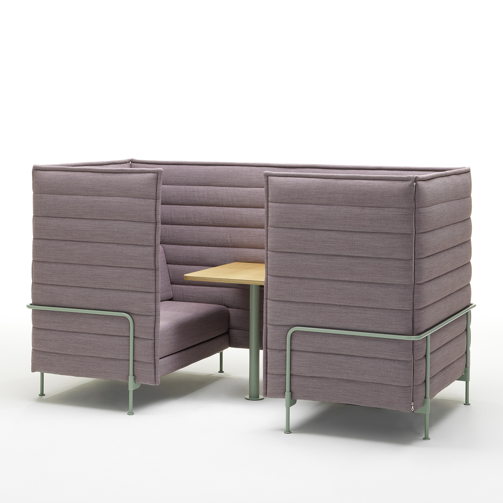 Det grunnleggende konseptet bak Alcove-serien er å skape steder for skjerming og tilbaketrukkethet – dette er spesielt tydelig i Alcove Plus Sofa. Innenfor de høye side- og bakpanelene til Alcove Highback Sofa, sitter man skjermet både visuelt og akustisk fra omgivelsene. Denne effekten er enda mer tydelig når to sofaer er plassert overfor hverandre for å lage et «rom i rommet».