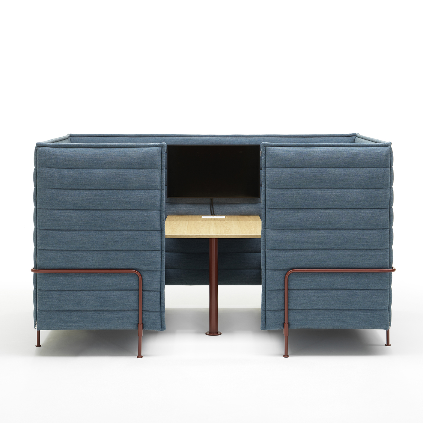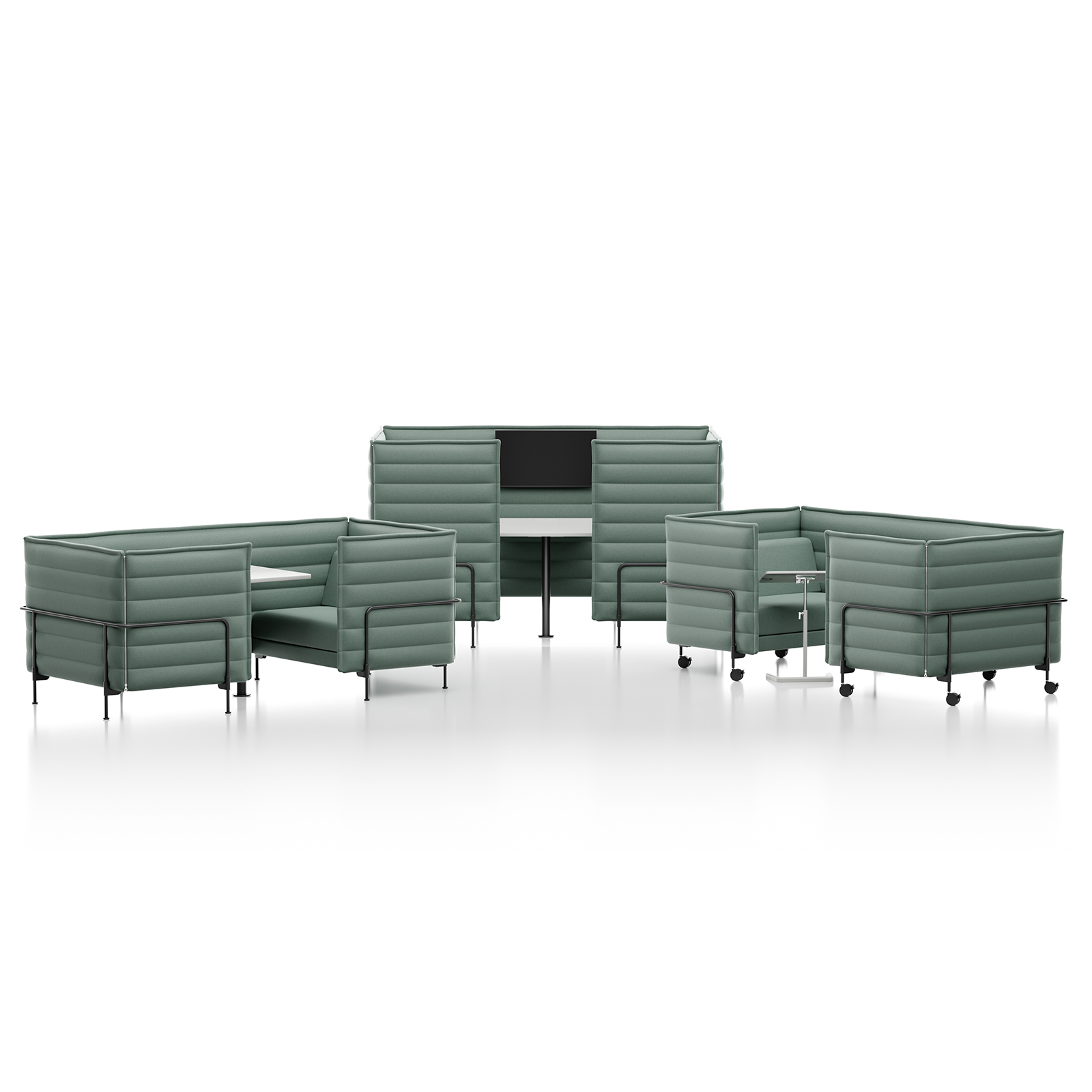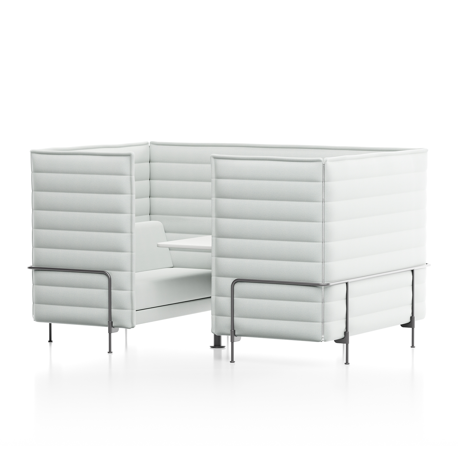 Det grunnleggende konseptet bak Alcove-serien er å skape steder for skjerming og tilbaketrukkethet – dette er spesielt tydelig i Alcove Plus Sofa. Innenfor de høye side- og bakpanelene til Alcove Highback Sofa, sitter man skjermet både visuelt og akustisk fra omgivelsene. Denne effekten er enda mer tydelig når to sofaer er plassert overfor hverandre for å lage et «rom i rommet».