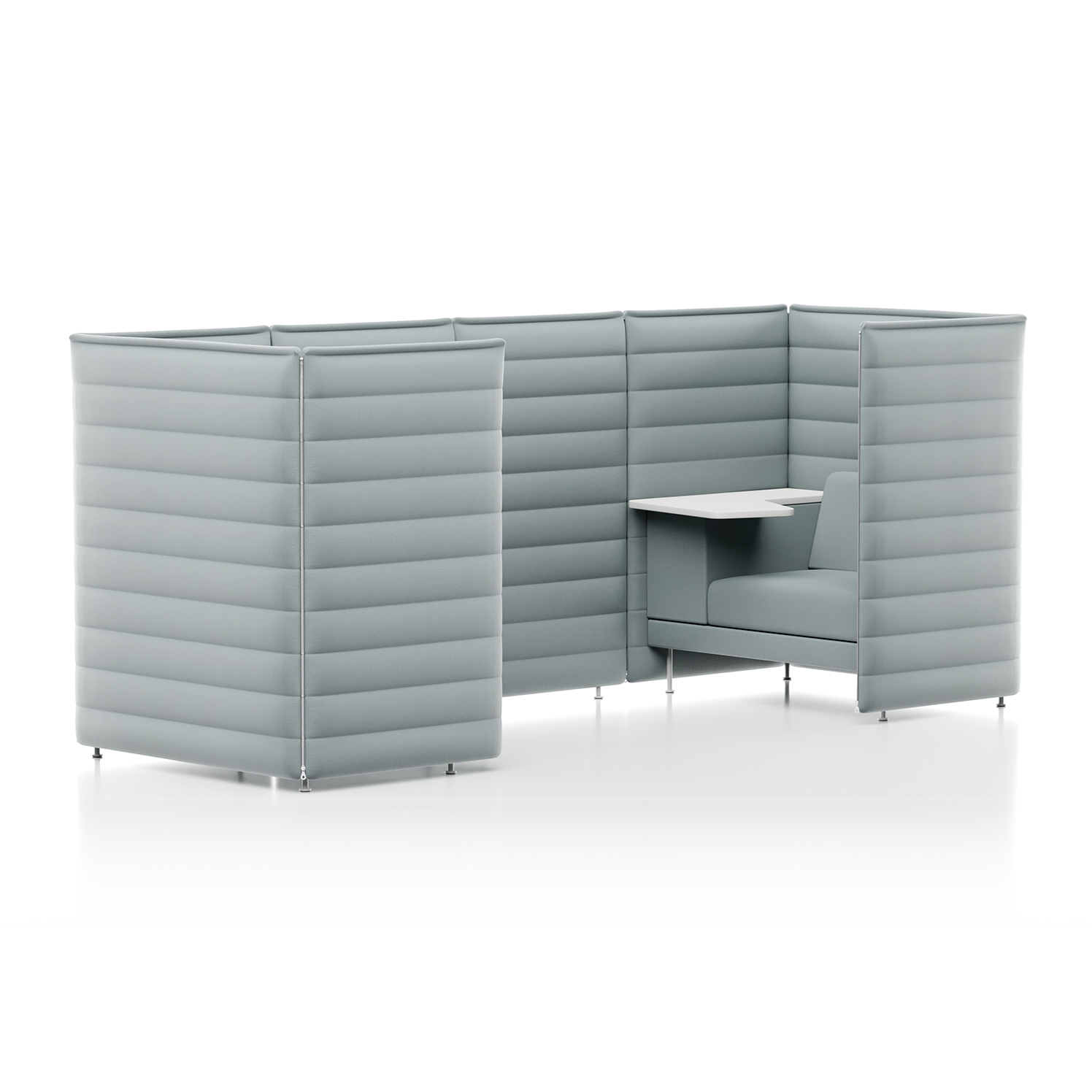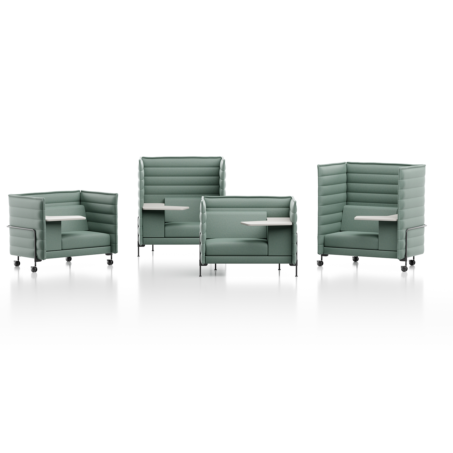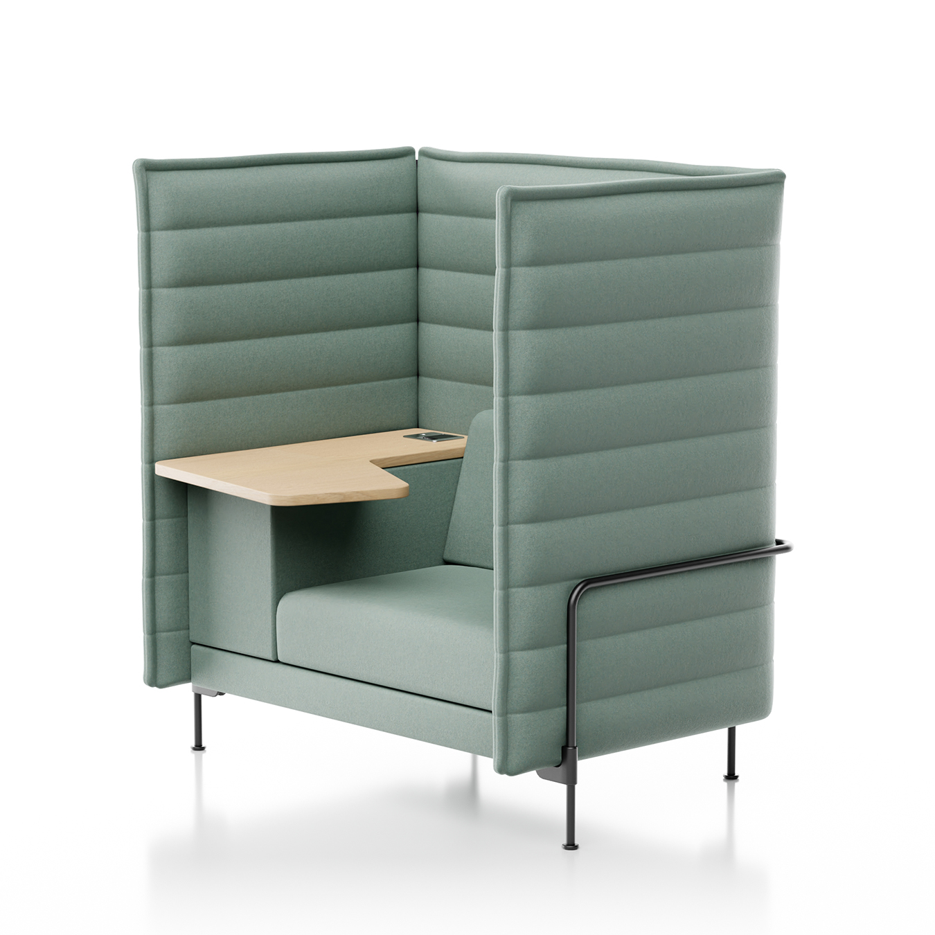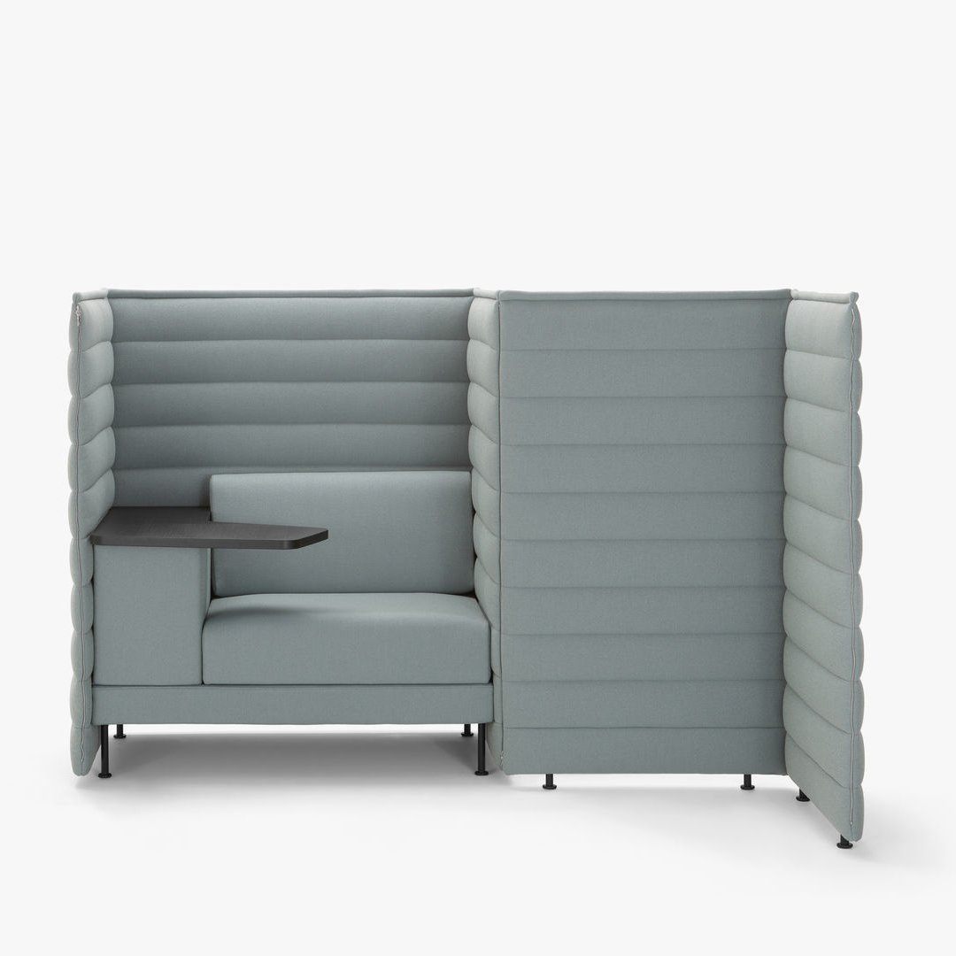 Det grunnleggende konseptet bak Alcove-serien er å skape steder for skjerming og tilbaketrukkethet – dette er spesielt tydelig i Alcove Plus Sofa. Innenfor de høye side- og bakpanelene til Alcove Highback Sofa, sitter man skjermet både visuelt og akustisk fra omgivelsene. Denne effekten er enda mer tydelig når to sofaer er plassert overfor hverandre for å lage et «rom i rommet».