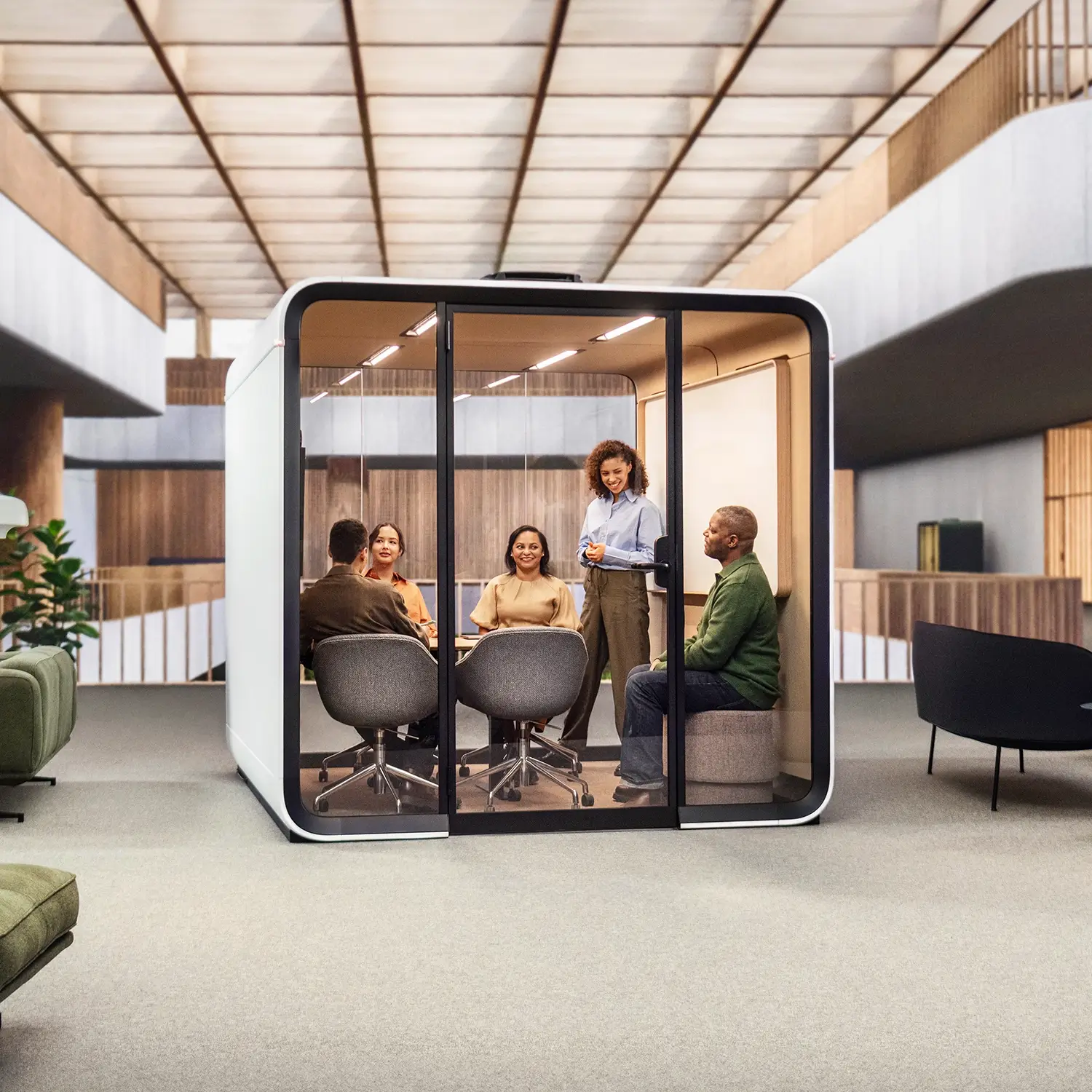 Et smart og lydisolert møterom for moderne team og hybridarbeid. Konstruert for å vare. Designet for folk som får det til. A-klasse lydisolering finjustert til menneskelige talefrekvenser betyr uavbrutt privatliv. Så du kan jobbe fritt uten å forstyrre andre. Adaptiv ventilasjon gjør at møterommet endrer luften inni fullt hvert 62. sekund. Velg mellom direkte eller indirekte luftstrøm og juster den slik du liker den. Automatisert belysning reagerer automatisk på dine behov. Velg mellom forhåndsinnstilte, optimaliserte lysmoduser som er ideelt justert for videosamtaler eller fokusert arbeid. Få enda mer ut av din smarte pod med Framery arbeidsplassteknologi. Lås opp mobilbestillinger, walk-in-reservasjoner og kalendertilkobling på tvers av hele organisasjonen.