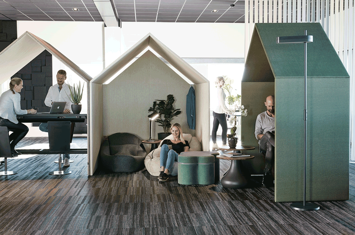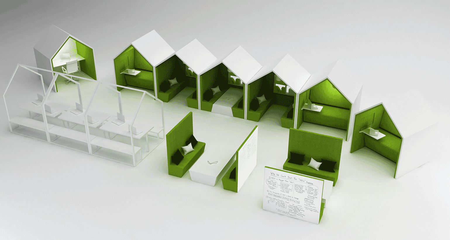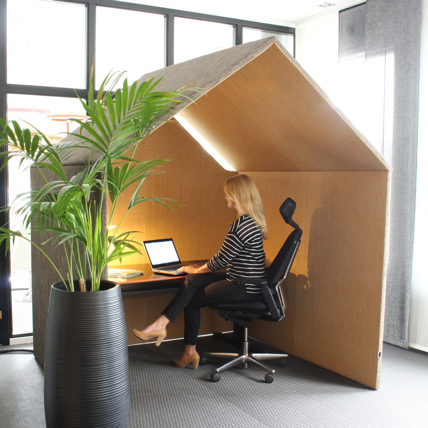 Husets enkle og rette linjer, er inspirert av det klassiske spillet Monopol og gir en tidløs form til det populære og praktiske rom-i-rom konseptet. Ved plassering på rekke kan huset brukes i flere formål, som en individuell arbeidsplass, et lite sitte-og-stå møterom eller et avslappings sted sammen med The Hut Sofa. Kan leveres med tilbehør som kabelkanal og lampe.